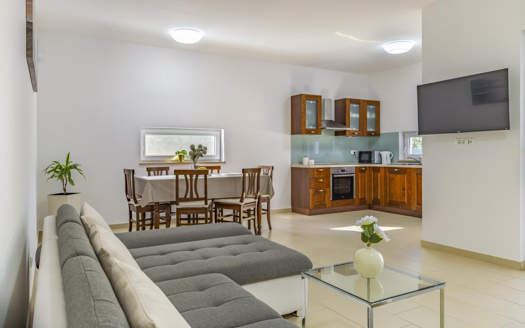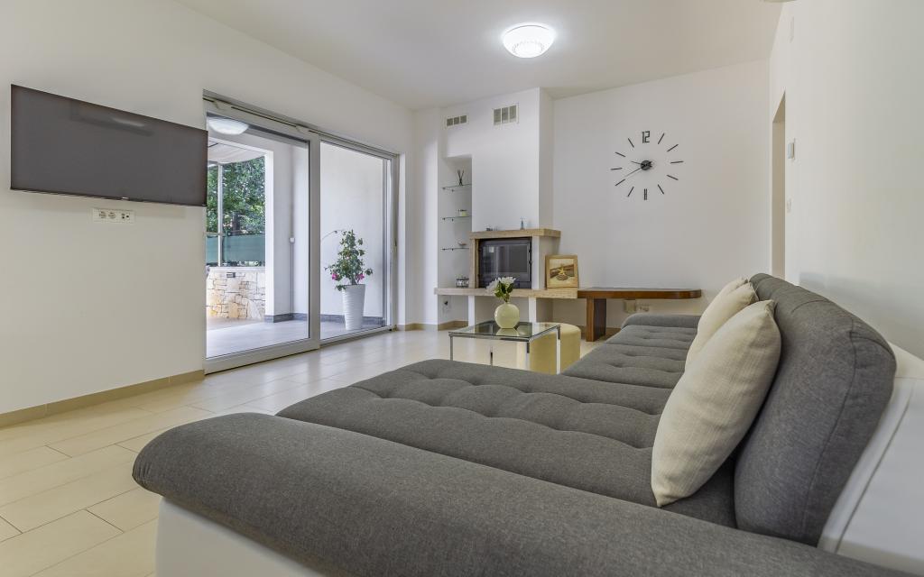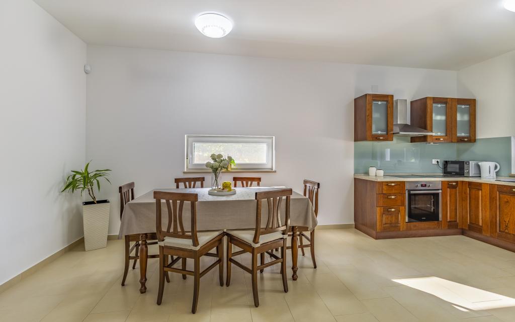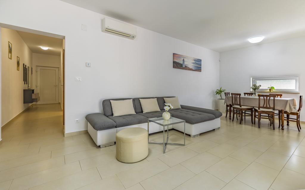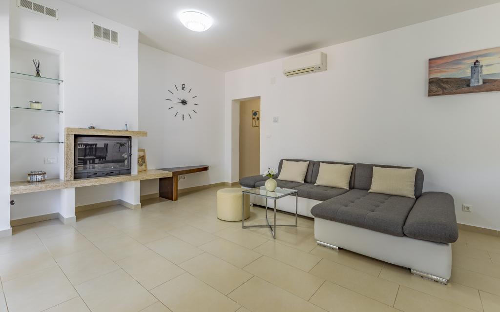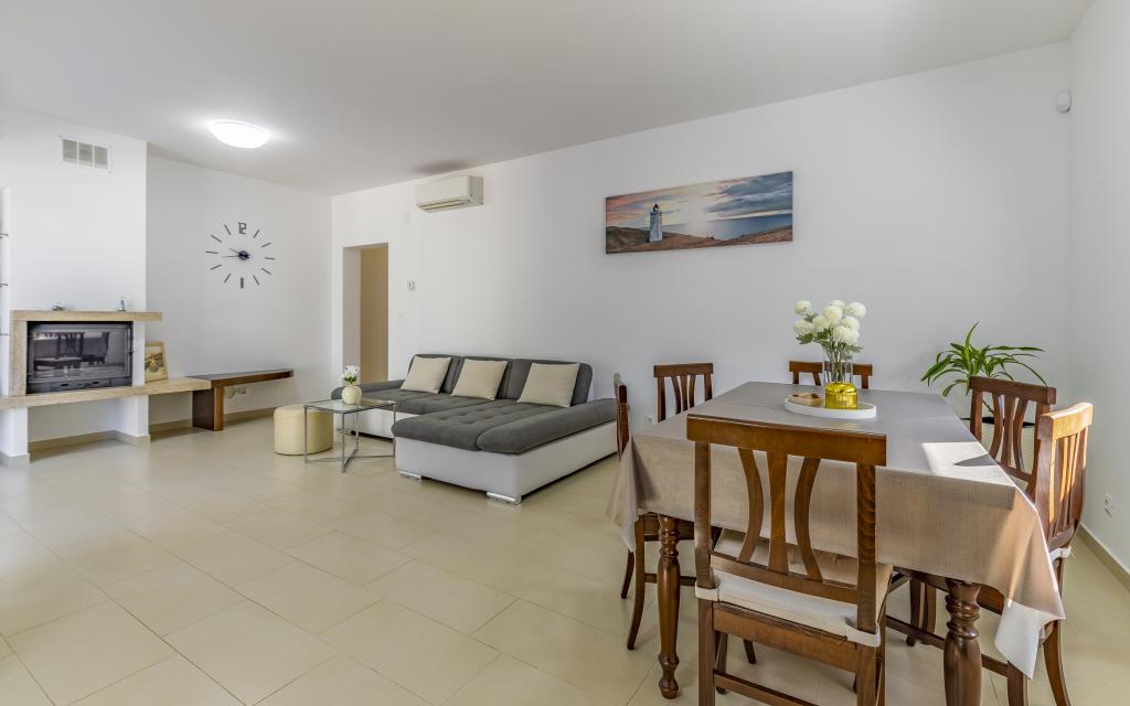 Fully equipped apartment (80 m²) in an excellent location in a quiet part of Banjol. The property is located 200 m from the sea and 300 m from the most beautiful beaches in the area. The apartment is located on the ground floor of a residential building with a total of three apartments and has a large private fenced garden (100 m²) with a separate entrance and its own parking space located right next to the apartment and the garden. The garden has a large covered terrace with a table and six chairs, four deck chairs, an outdoor shower and a barbecue, which is the main space for pleasant socializing and relaxation with plenty of privacy, sun, but also shade. The entire building is surrounded by a stone wall, and there are sliding doors at the entrance. The apartment consists of 2 bedrooms with double beds, 2 bathrooms with toilet and shower, a spacious living room with a sofa bed, a dining room and a kitchen. The apartment is air-conditioned, and in winter it is heated with underfloor heating and has an indoor fireplace, so it is also suitable for staying in the colder autumn and winter months