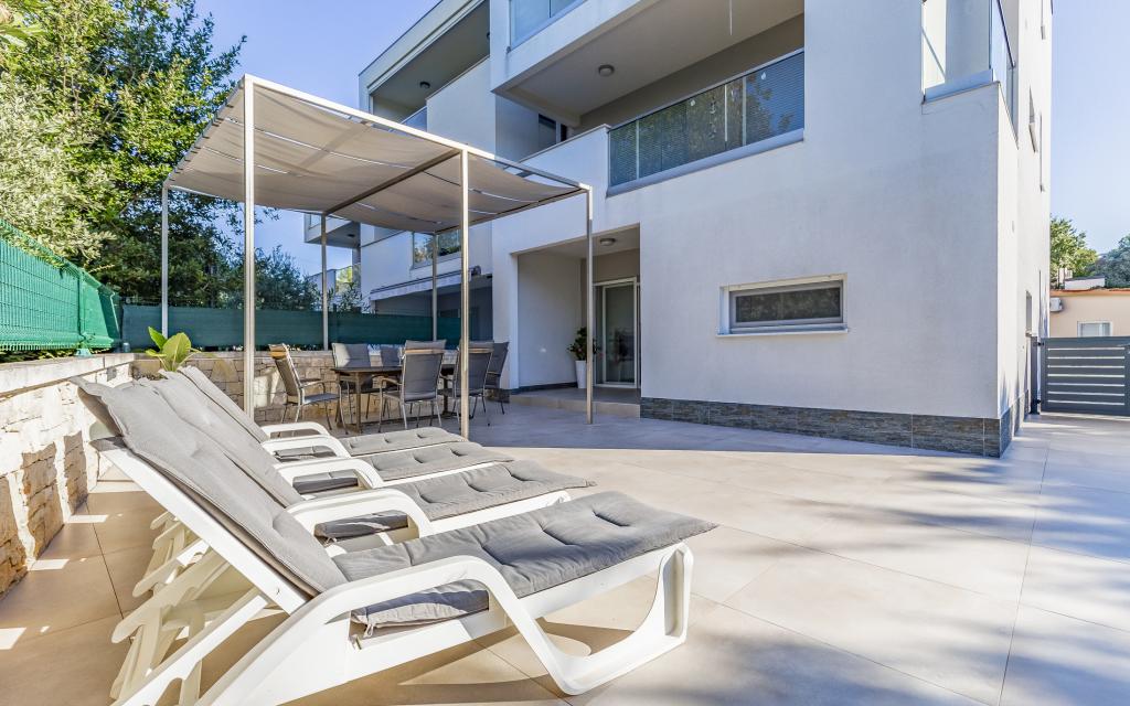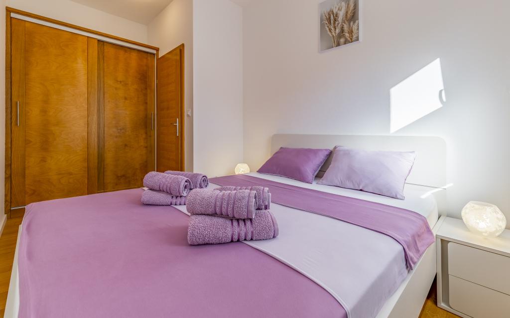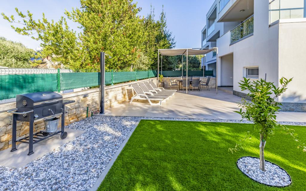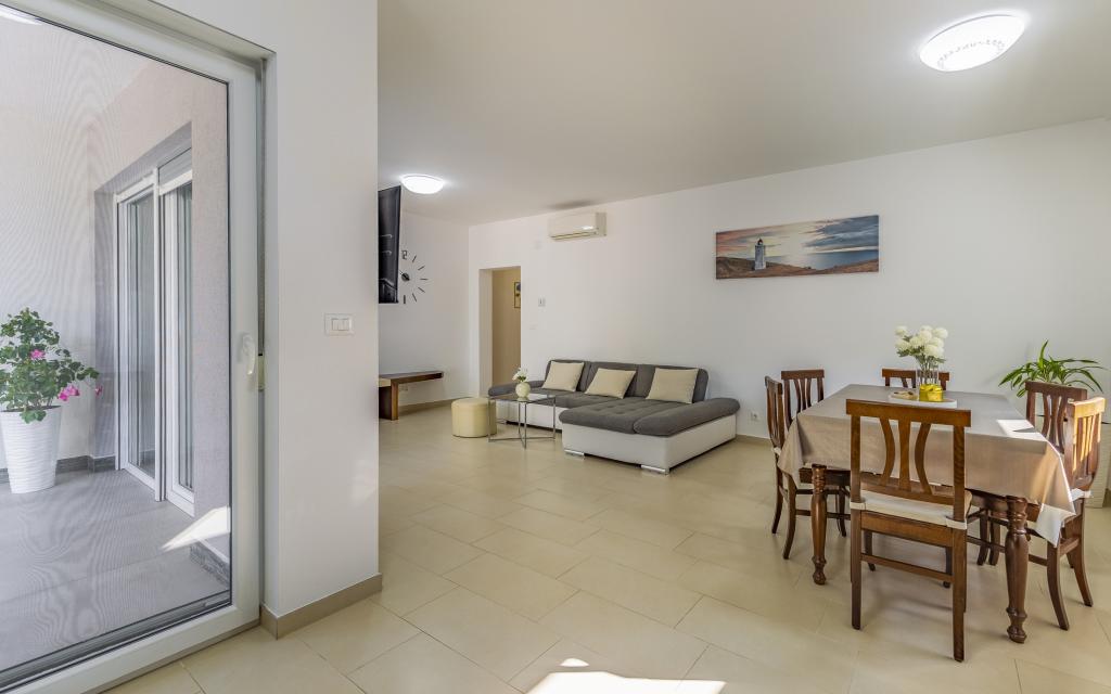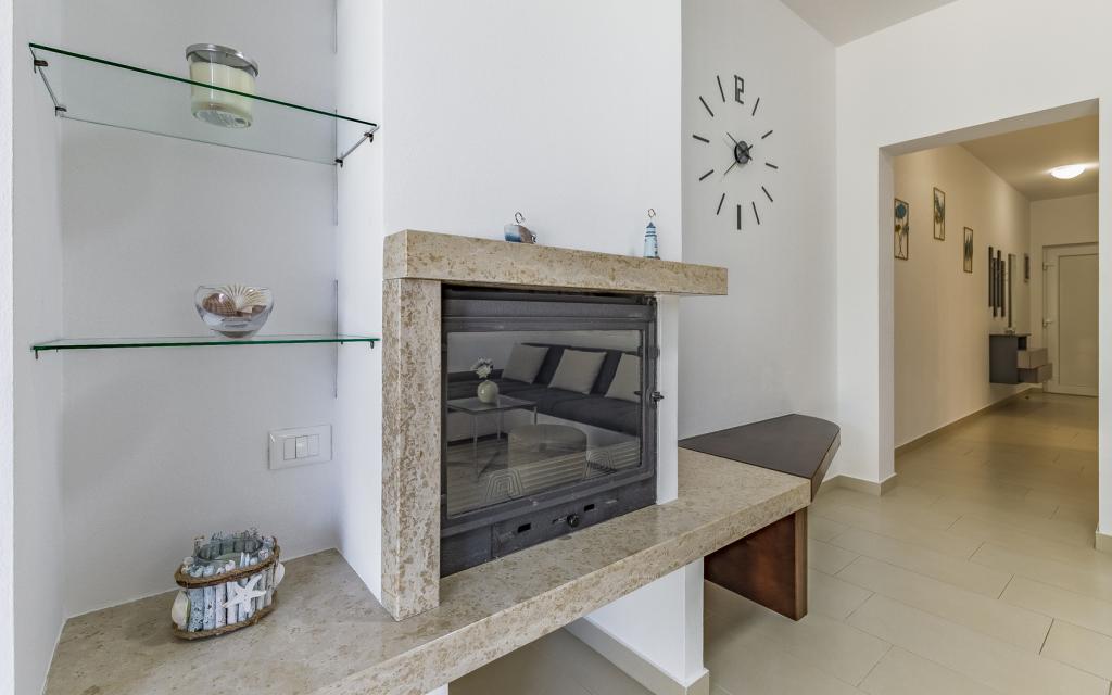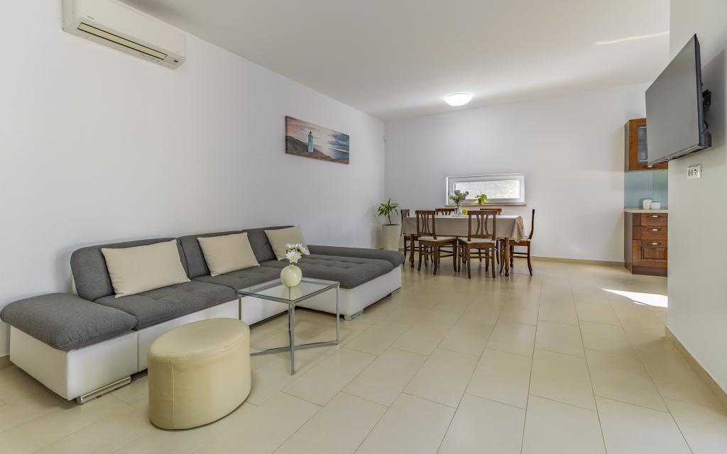 Fully equipped apartment (80 m²) in an excellent location in a quiet part of Banjol. The property is located 200 m from the sea and 300 m from the most beautiful beaches in the area. The apartment is located on the ground floor of a residential building with a total of three apartments and has a large private fenced garden (100 m²) with a separate entrance and its own parking space located right next to the apartment and the garden. The garden has a large covered terrace with a table and six chairs, four deck chairs, an outdoor shower and a barbecue, which is the main space for pleasant socializing and relaxation with plenty of privacy, sun, but also shade. The entire building is surrounded by a stone wall, and there are sliding doors at the entrance. The apartment consists of 2 bedrooms with double beds, 2 bathrooms with toilet and shower, a spacious living room with a sofa bed, a dining room and a kitchen. The apartment is air-conditioned, and in winter it is heated with underfloor heating and has an indoor fireplace, so it is also suitable for staying in the colder autumn and winter months