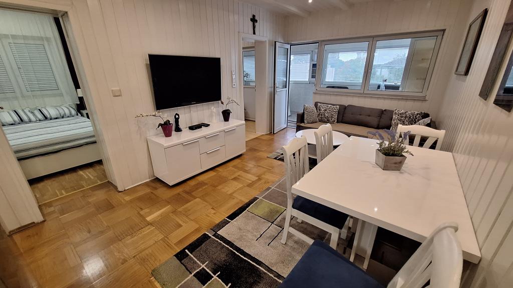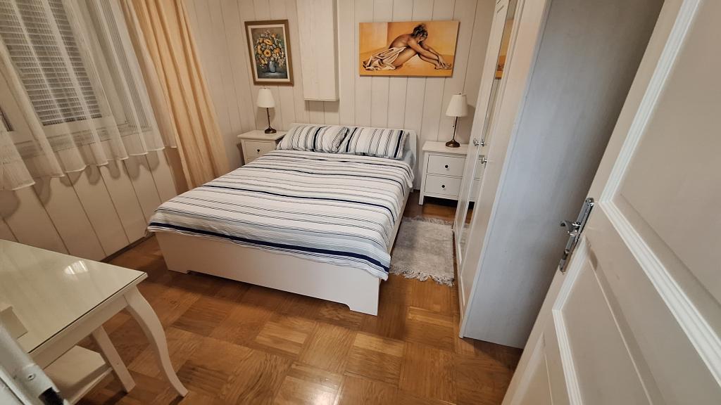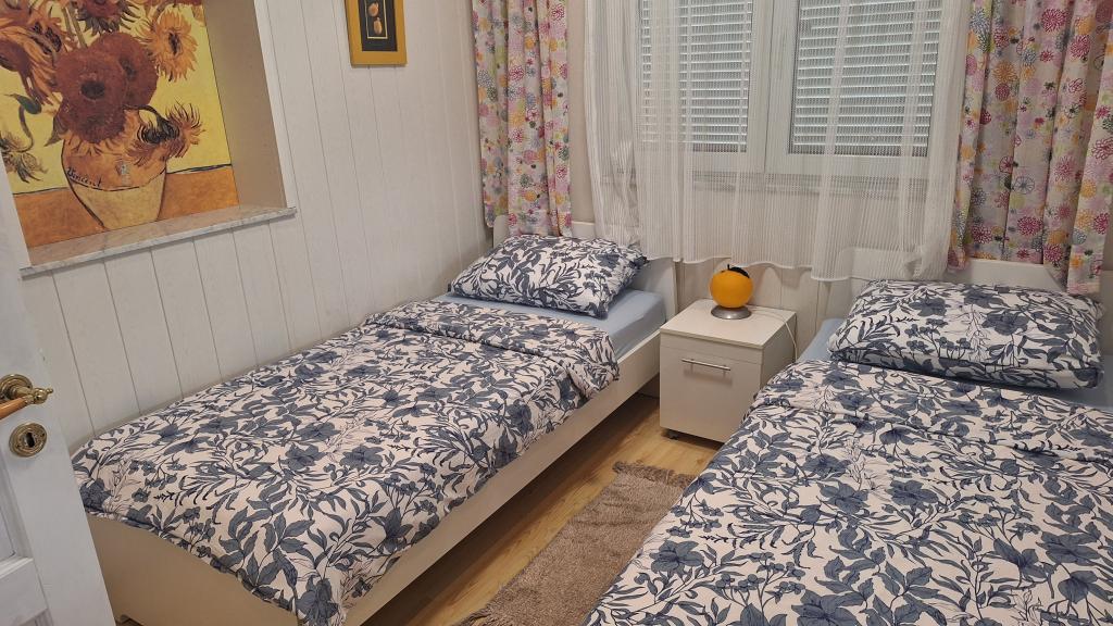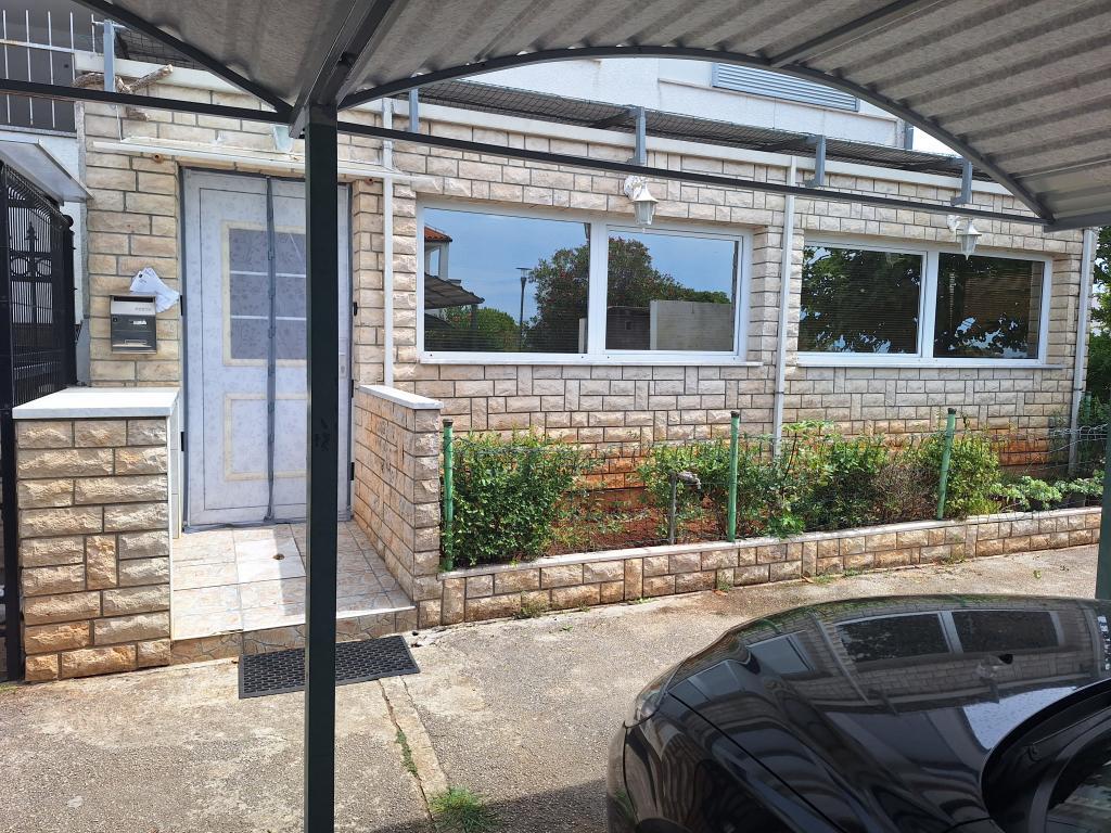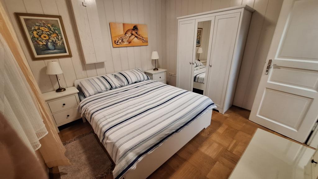 Apartment MARIJA is a large apartment with 3 bedrooms and a living room. In front there is a covered and glazed terrace. Next to the entrance there is a small free space where you can sit and possibly set up a grill which is available in the apartment. Directly in front of the entrance there are 2 covered parking spaces for 2 cars.