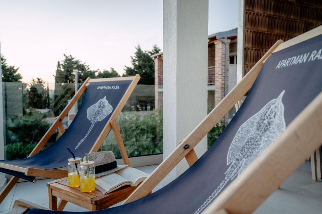 For all our guests, we have provided an open parking space in the shade of olive trees at the back of the house. Apartment Raža is surrounded by a large garden that is cultivated with great love. There is a barbecue in the immediate vicinity of the garden. For all guests who prefer shade, there is a terrace right by the sea with deck chairs and garden furniture. For all our guests who own or rent a boat, there is a waterfront and boat moorings in front of the apartment, as well as a workshop where you can store boat equipment or beach items. Visit us and explore Rab at your own pace. Welcome!