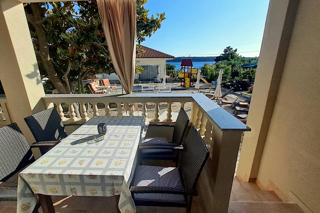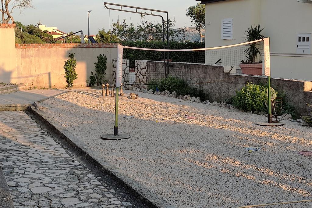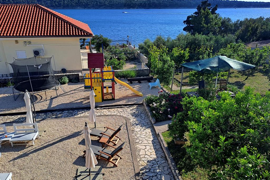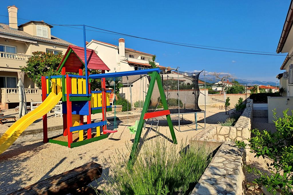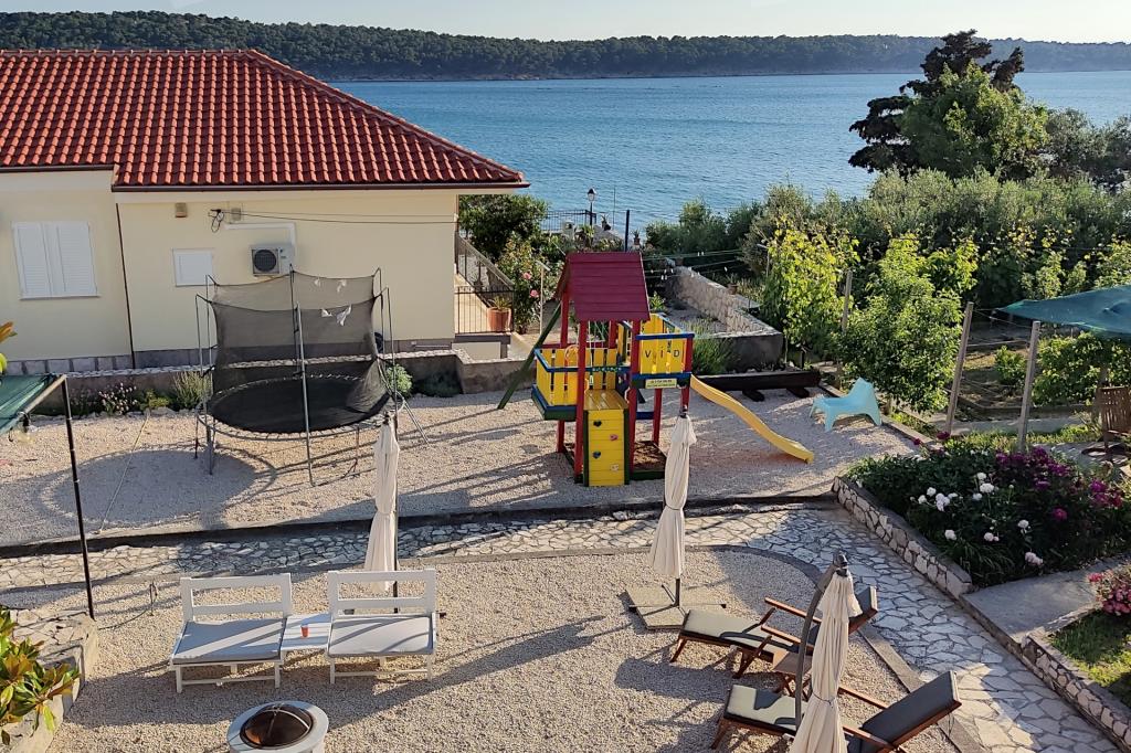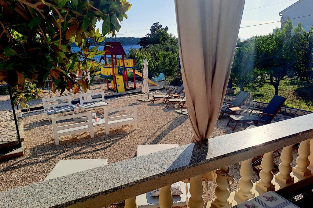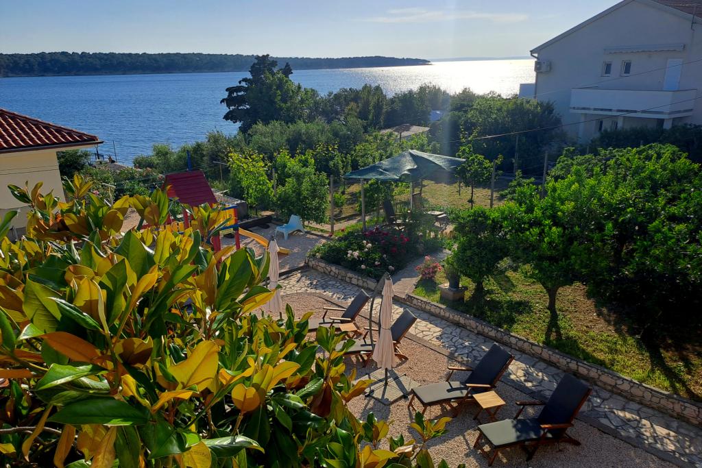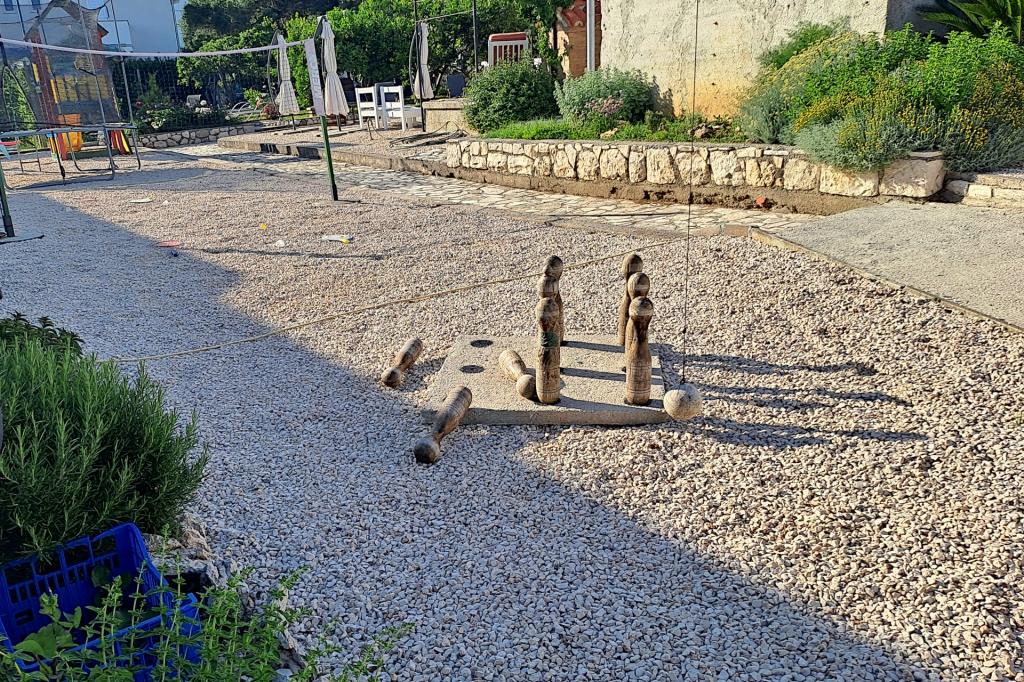 Apartments 30 m from the sea, free mooring for the vessel. The house owned by the family Snježana and Slobodan (Bobo) Frankić is located in Barbat on the island of Rab, 4 km from the town of Rab and 6 km from the ferry. It was built as a one-story building with five apartments for rent, a common room for entertainment and one apartment where the hosts live. The house is located in a quiet area, in a beautiful residential area, it is only 30 meters from the sea and is surrounded by a parking lot, a flower garden, an orchard, a sunny terrace with deckchairs, a playground for children and adults, and a common terrace. There are five apartments for 4 people: Apartment 1, Apartment 3, Apartment 4, Apartment 5 and one apartment for 2 people: Apartment 2. Two apartments for 4 people: Apartment 1, Apartment 3 and one apartment for 2 people: Apartment 2 are located on the ground floor, and two apartments for four people: Apartment 4, Apartment 5 on the first floor (hosts and rented Apartment 5 share a terrace). All apartments have air conditioning. Free WiFi