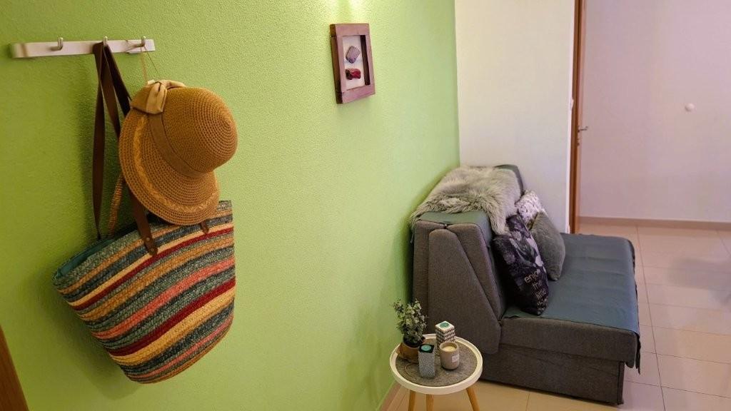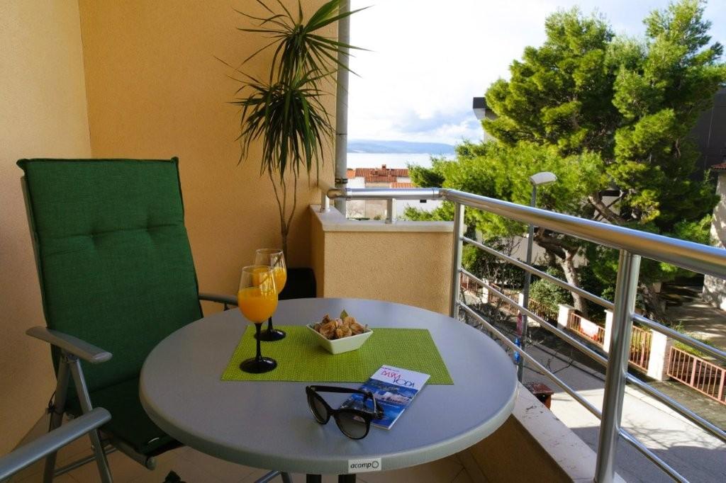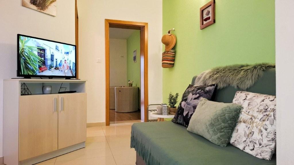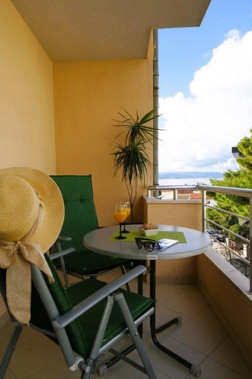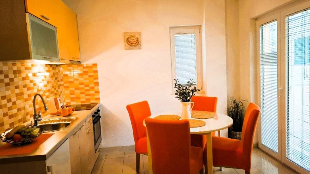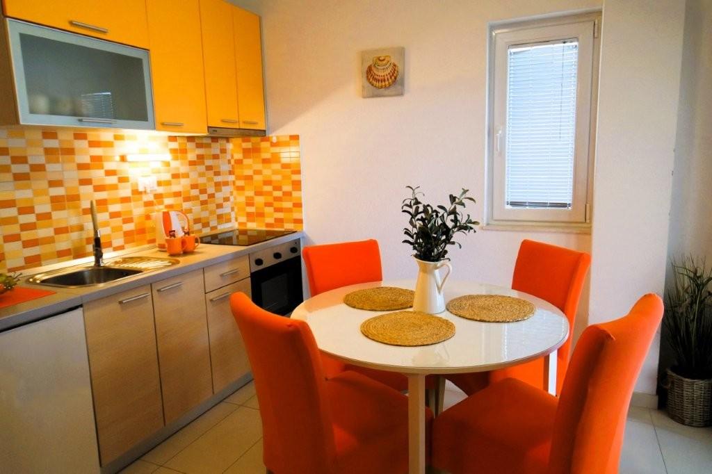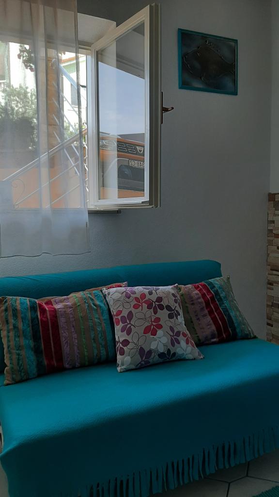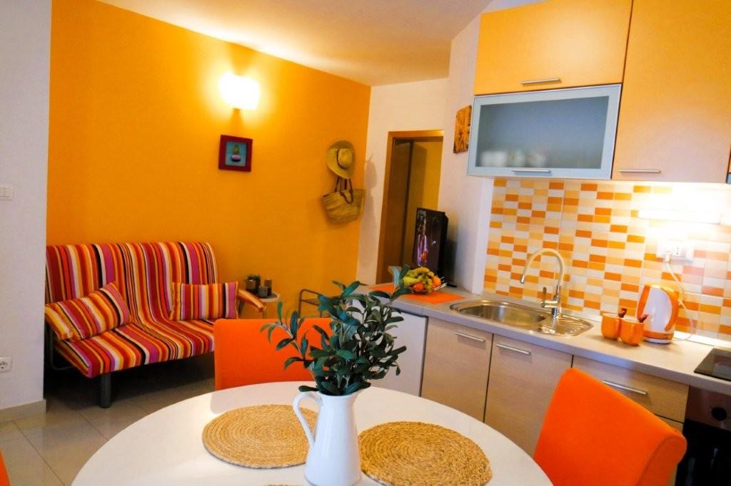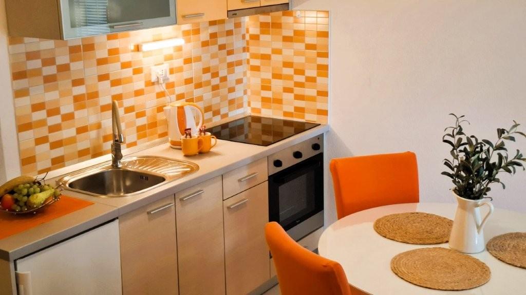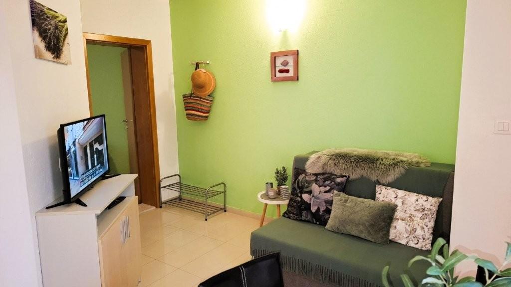 Carefully furnished and modernly equipped, apartments Harmonija are best choice for a peaceful and pleasant family holiday or for couples seeking comfortable accommodation in an excellent location 200m from the beach, in the attractive tourist area of Baška Voda, not far from the centre, with a beautiful side view to the sea and Mount Biokovo. We offer accommodation in three apartments: green, orange, and turquoise, designed for 2 adults with 1 child or 2 small children. Each apartment is approximately 40m2, has a large bedroom, a living area that includes a fully equipped kitchen with a dining table, a sofa bed, a bathroom, and a terrace. The green and orange apartments are located on the first floor of a family house, with balconies with sea view and garden furniture, while the turquoise one is located in the basement flooor of the house without a sea view, with a terrace and lounge chairs.The apartments exude cleanliness, harmony, and cheerful colours for your perfect holiday.