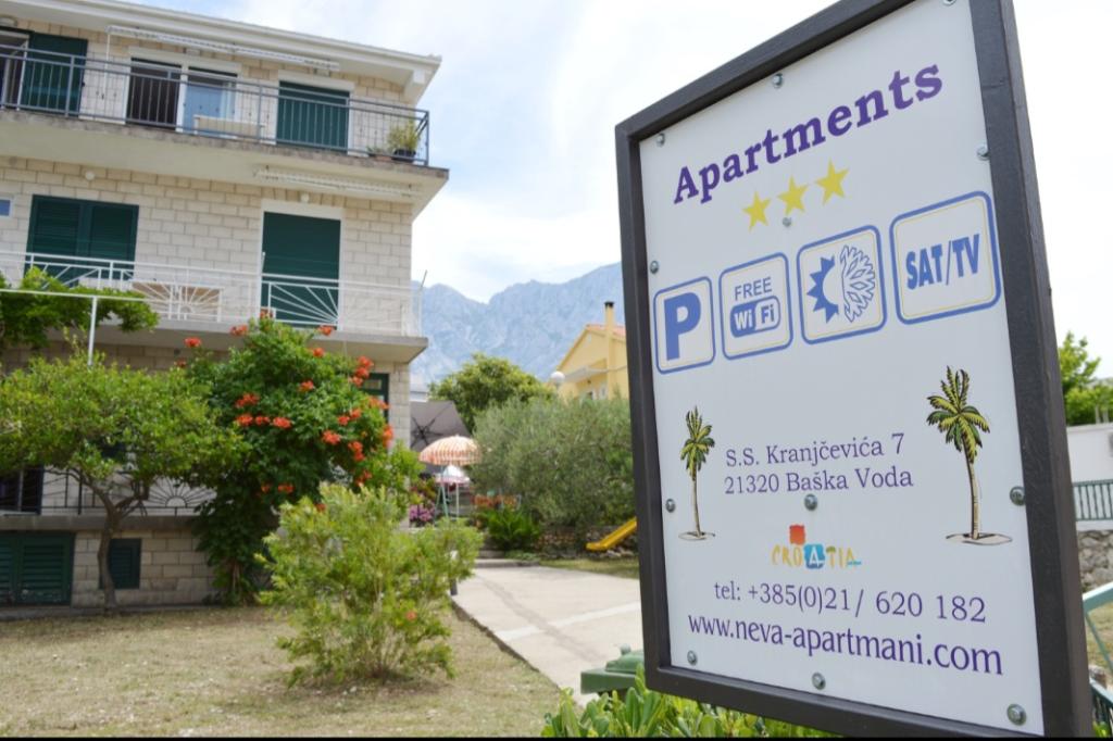 Read more Accommodation unitsEntering the apartment after 14:00 on the day of arrival. Departure from the apartment until 10:00 on the day of departure. Accommodation reservation is made by paying an advance to a bank account of a minimum amount of 1 night in the arrangement within 2 days, and the rest upon arrival. IMPORTANT INFORMATION: Please inform Apartmani Neva Baška Voda in advance of your expected arrival time. They can state their remarks at the time of booking or they can contact the property directly via the contact details provided in the booking confirmation at least 24 hours before arrival (e-mail / sms / whats app / viber).