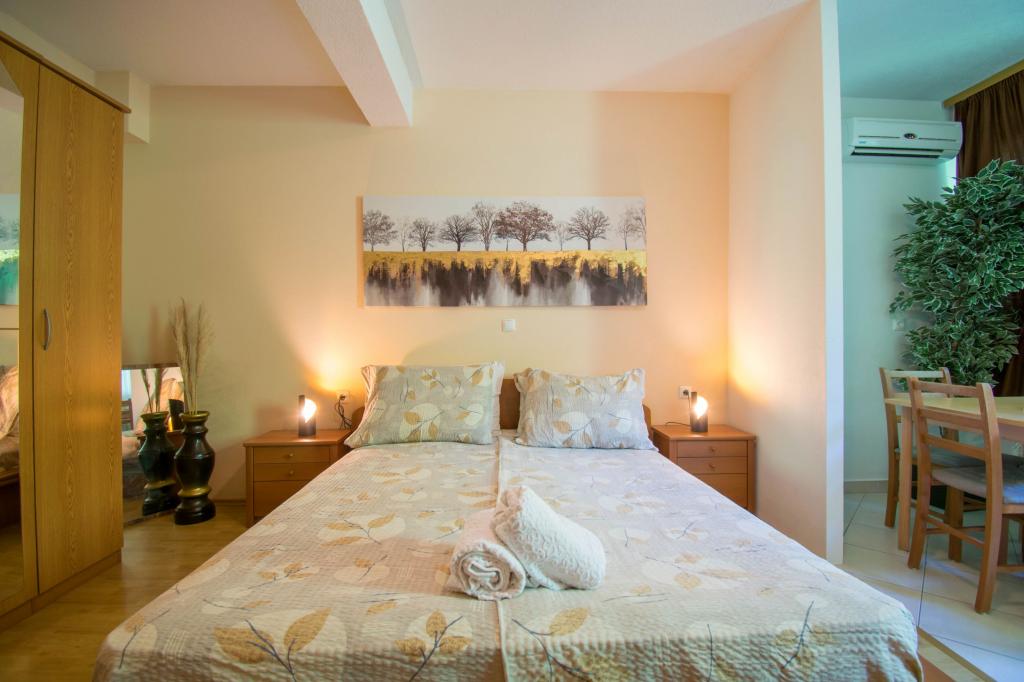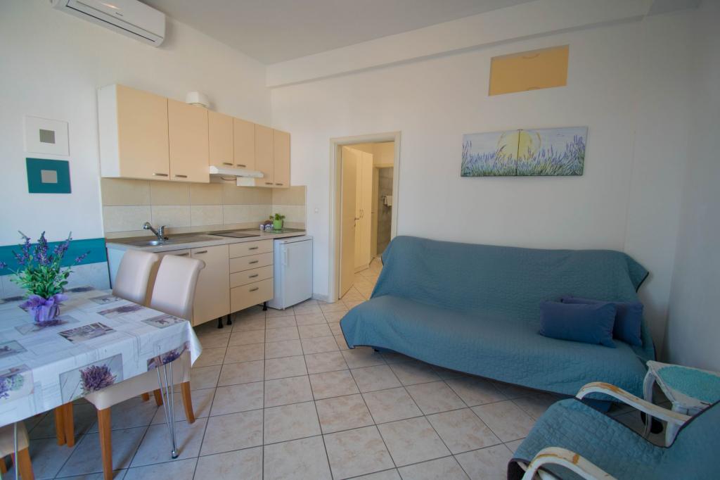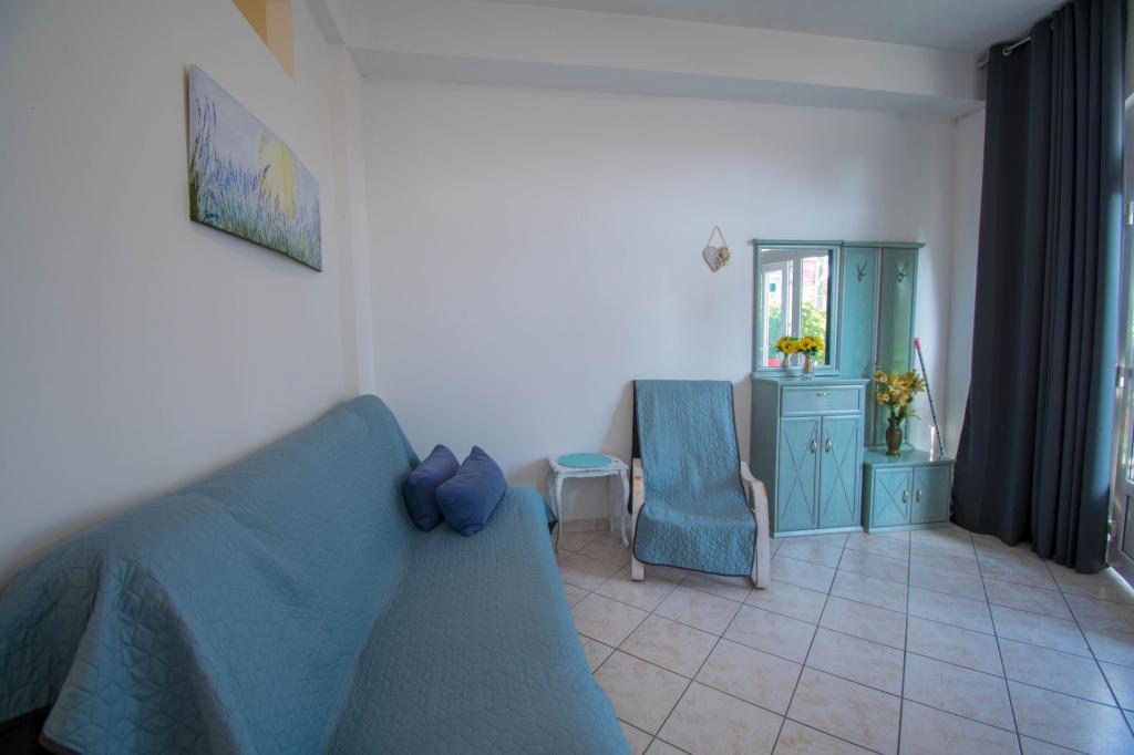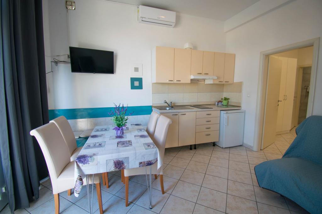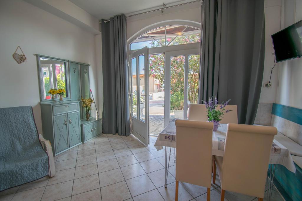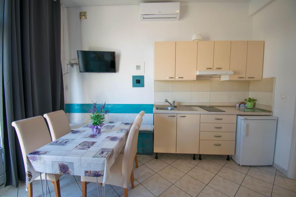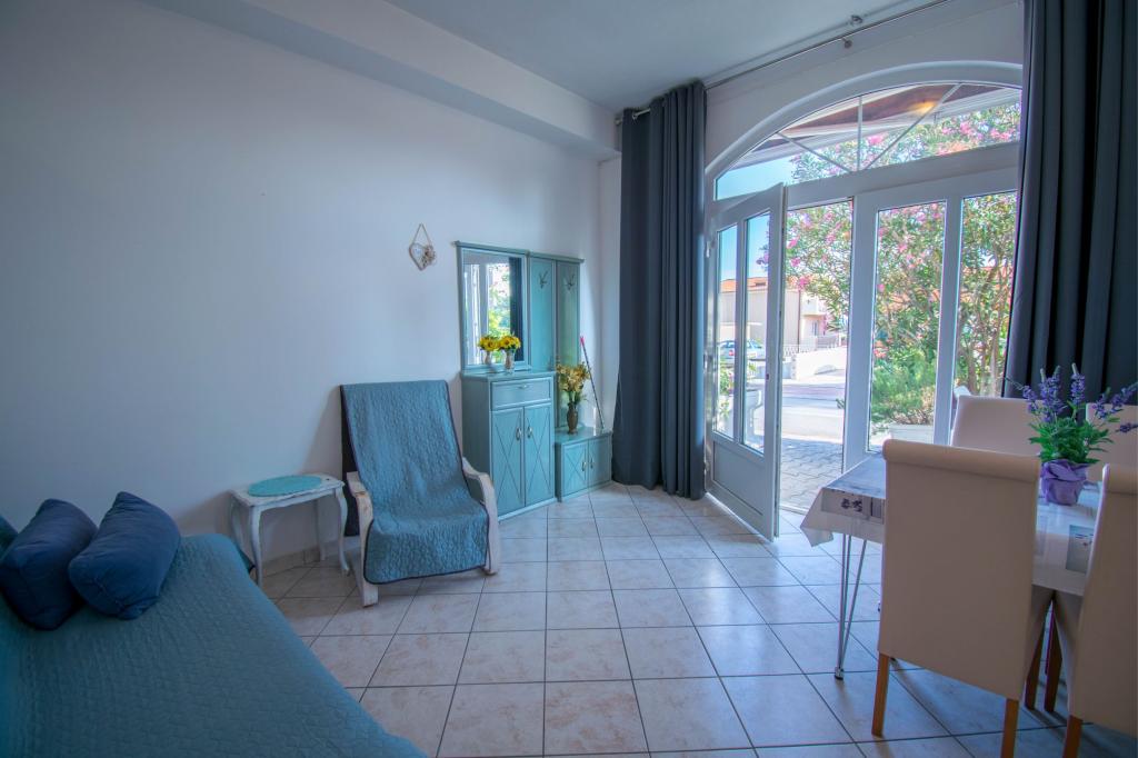 Apartment as described in the offer. Located on the main road in the village so very easy to find. It is close to the beach and the town center - maximum 5 minutes on foot. Parking is available but not at the property itself, only about 150-200 m from it. Very close - within a radius of several hundred meters markets and a bakery. The apartment we rented was on the ground floor. It was clean and nice. There is working air conditioning. Comfortable and fully equipped kitchen (pots, plates, glasses and other utensils, fridge and two-burner electric cooker). Bathroom with shower - everything OK. The rooms have large wardrobes and large very comfortable beds. There is a small terrace with a table at the exit of the apartment, but you sit almost on the pavement (I don't know if it's a disadvantage or an advantage). The owner very nice and helpful. He speaks very good English. I really recommend this apartment.