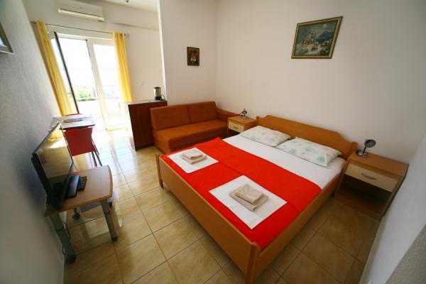 House in a quiet part of town in a cul de sac with little traffic. Distance from the beach is about 500m (about 5-10 minutes walk). The house has several apartments that are equipped to accommodate 2, 3, or 4 people. All apartments are air conditioned and modernly equipped with everything you need for a comfortable stay. Year of construction is 2008. Most apartments have a sea view. Parking spaces are provided for all guests. Tourist tax 1 € per person per day All other costs are included in the price