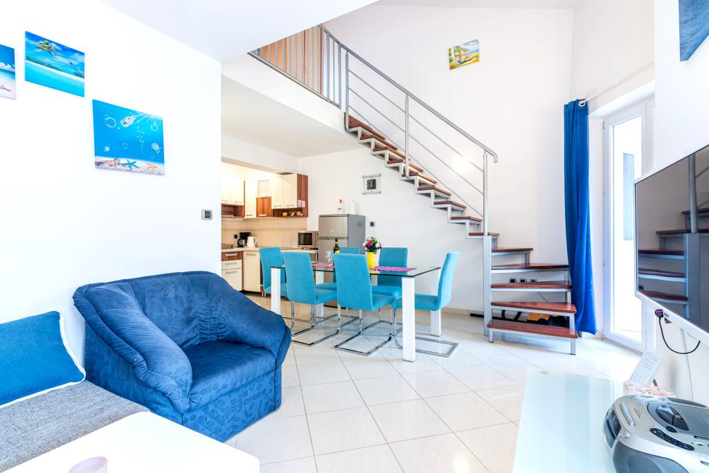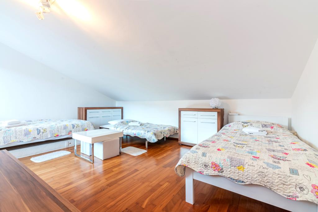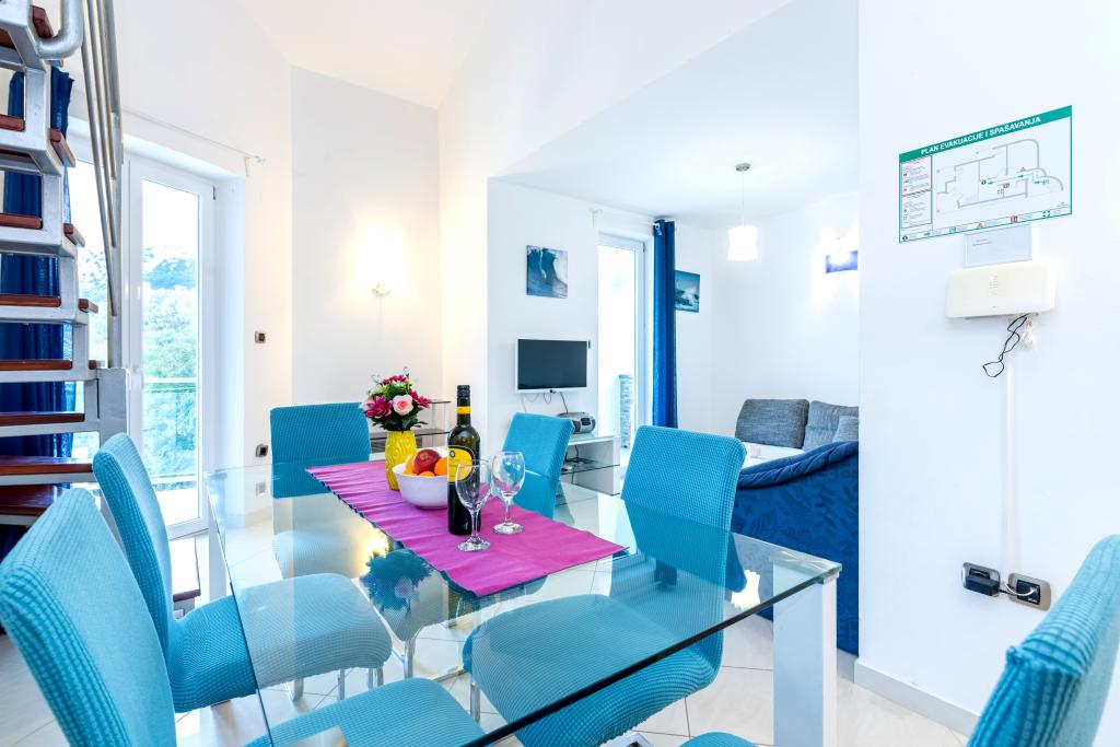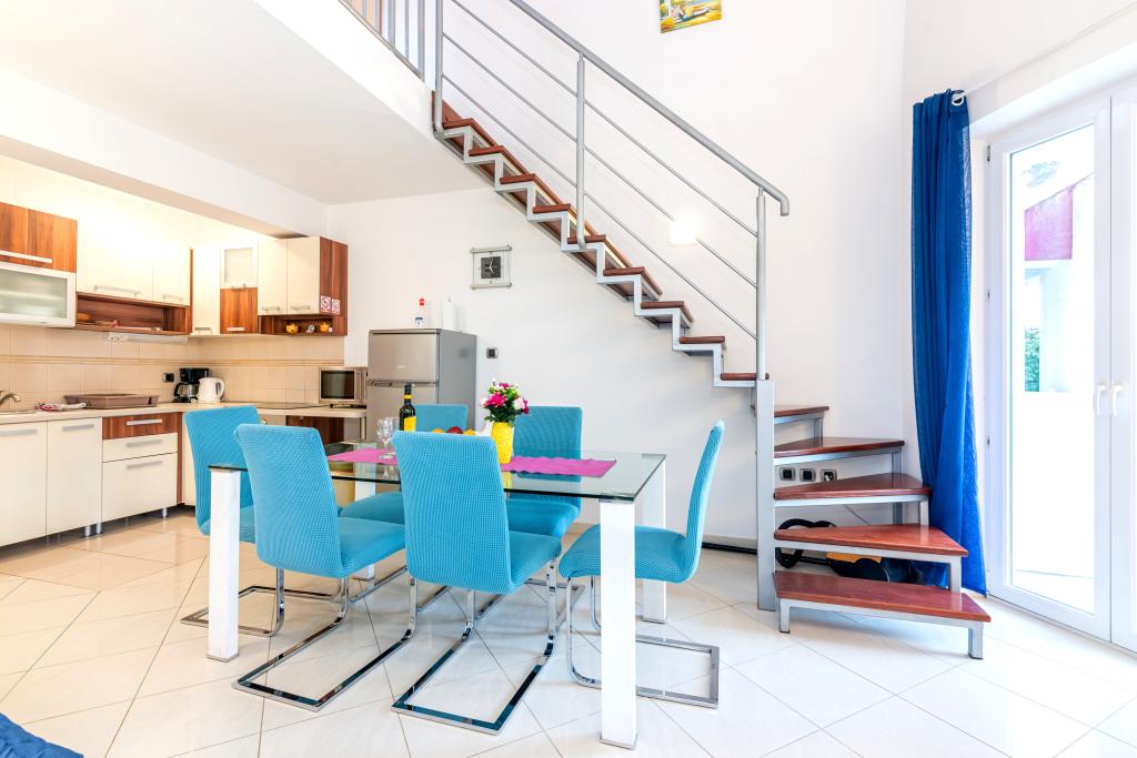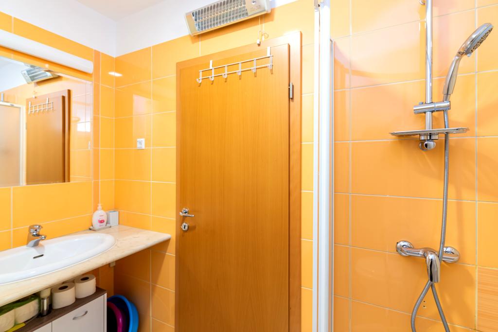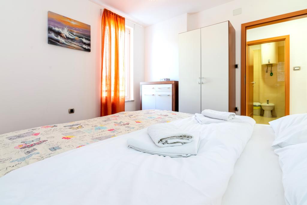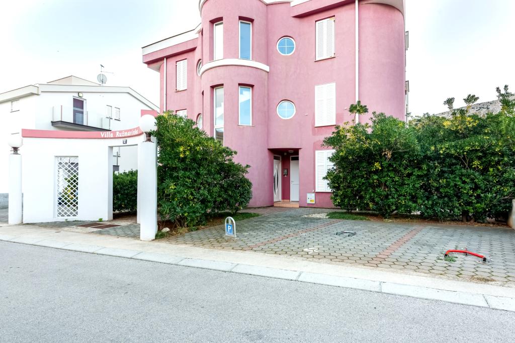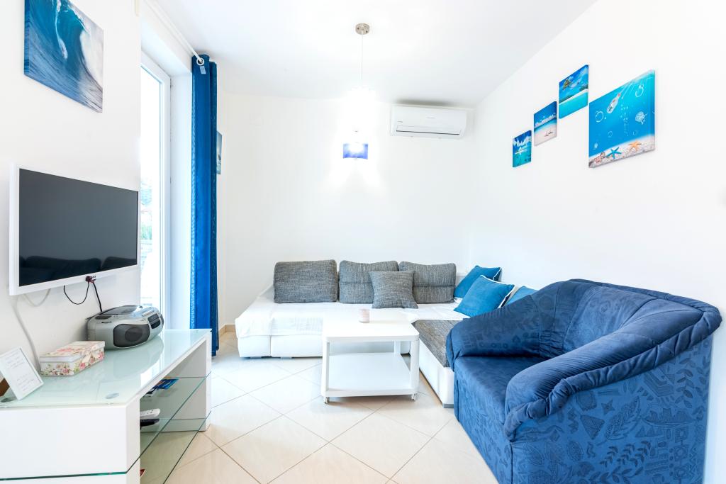 The apartment is located on the 2nd and 3rd floor. It has 2 double rooms with double beds, 1 double room with single beds, living room with sofa for 2 people, 2 bathrooms, fully equipped kitchen and dining room. This apartment is located approximately 3 minutes' walk from the central beach. Located in a quiet area, this modern apartment is equipped with 3 air conditioners, free WiFi internet, SAT-TV, a spacious terrace, and free private parking in front of the house. The facility is also near a small shop and restaurant.