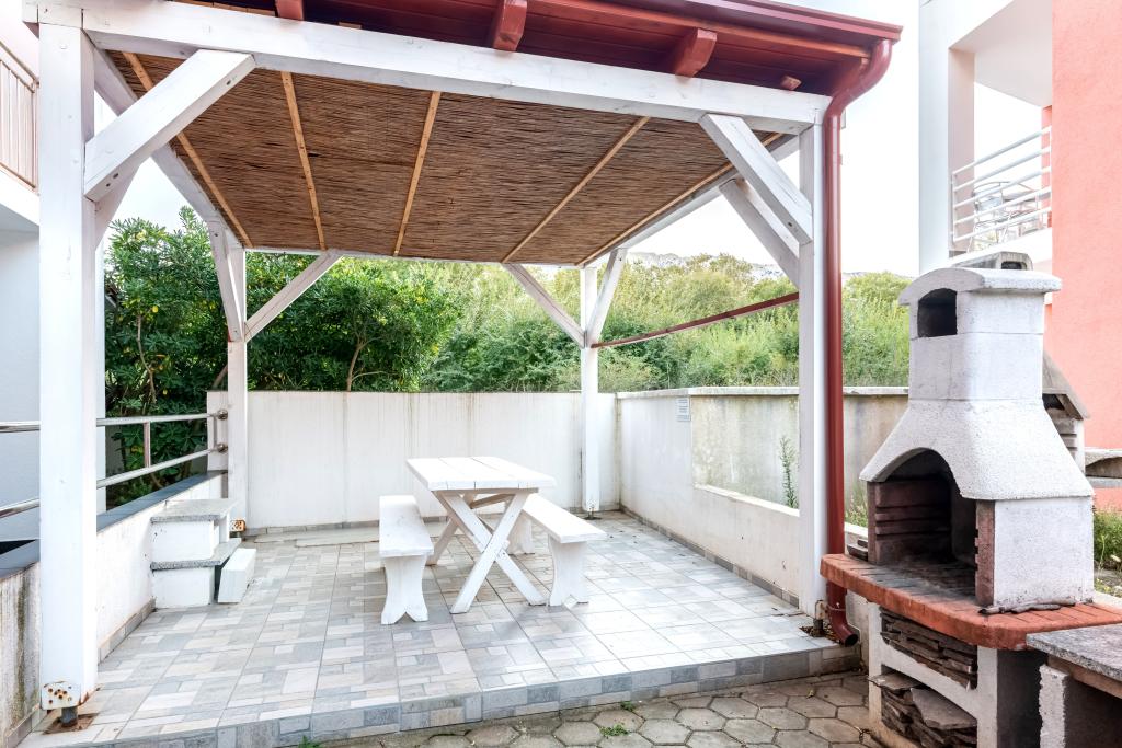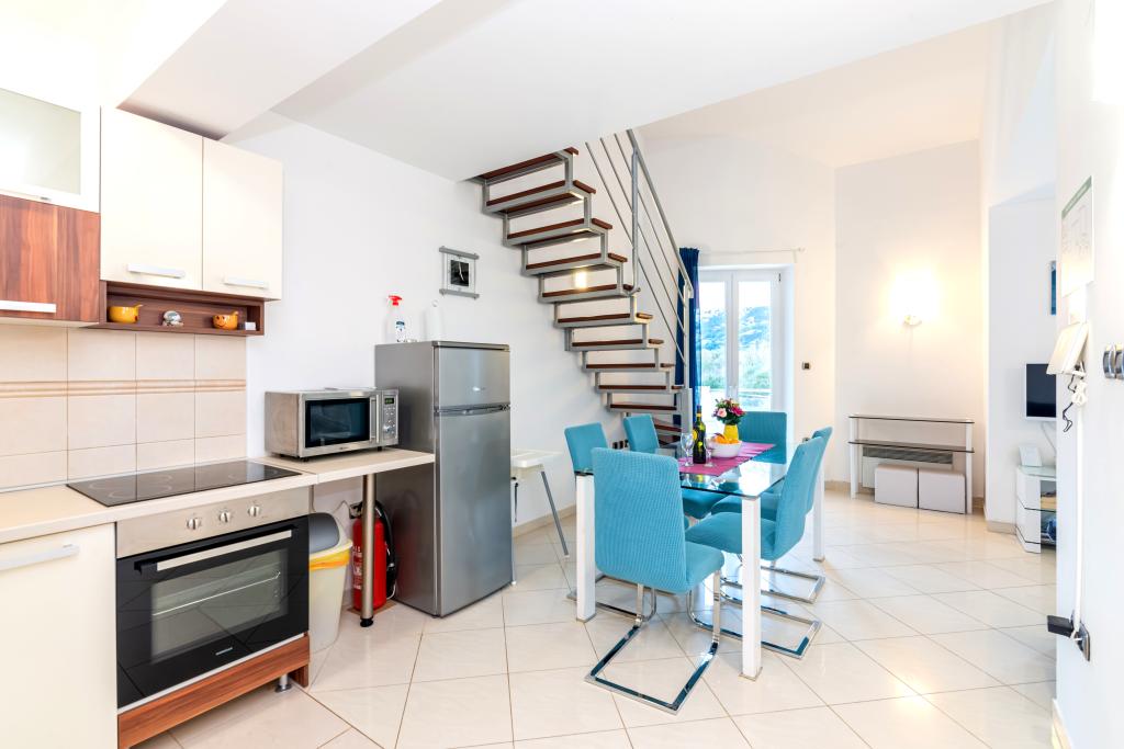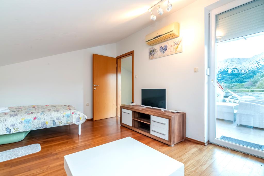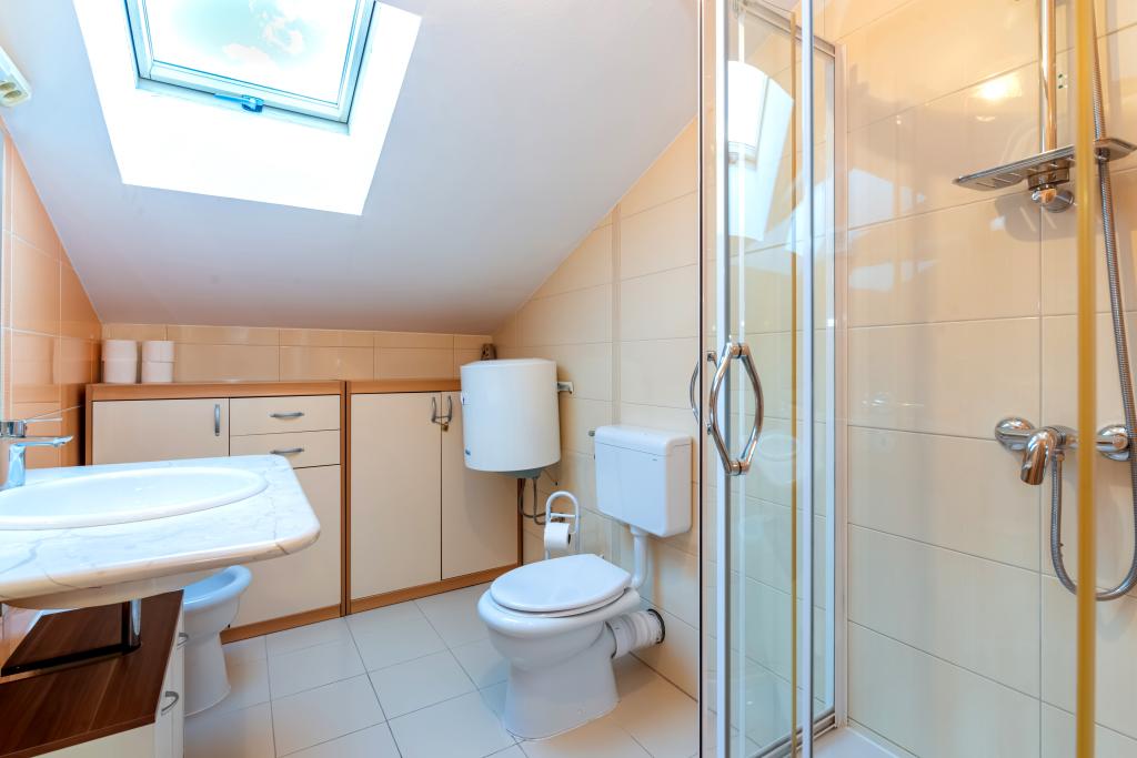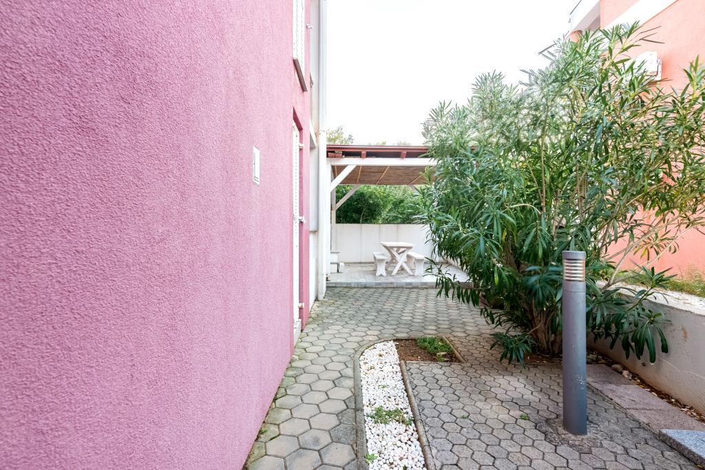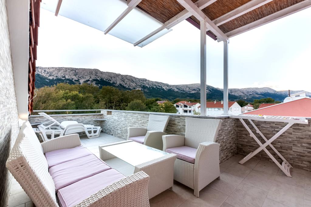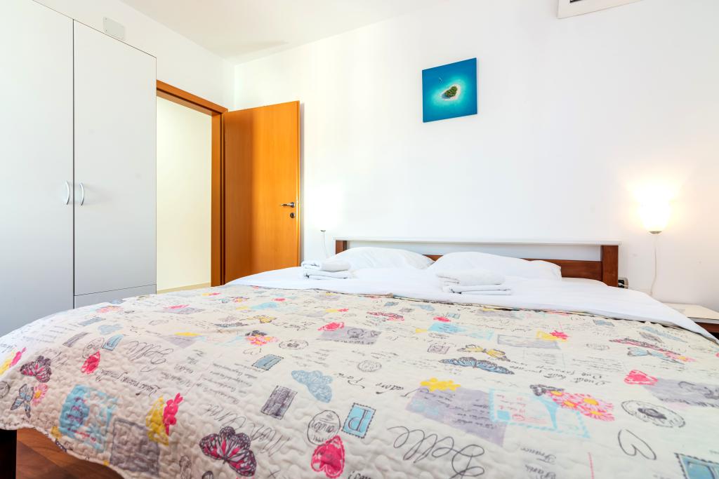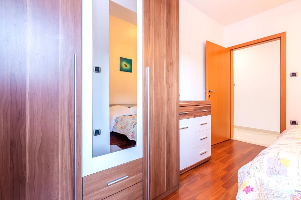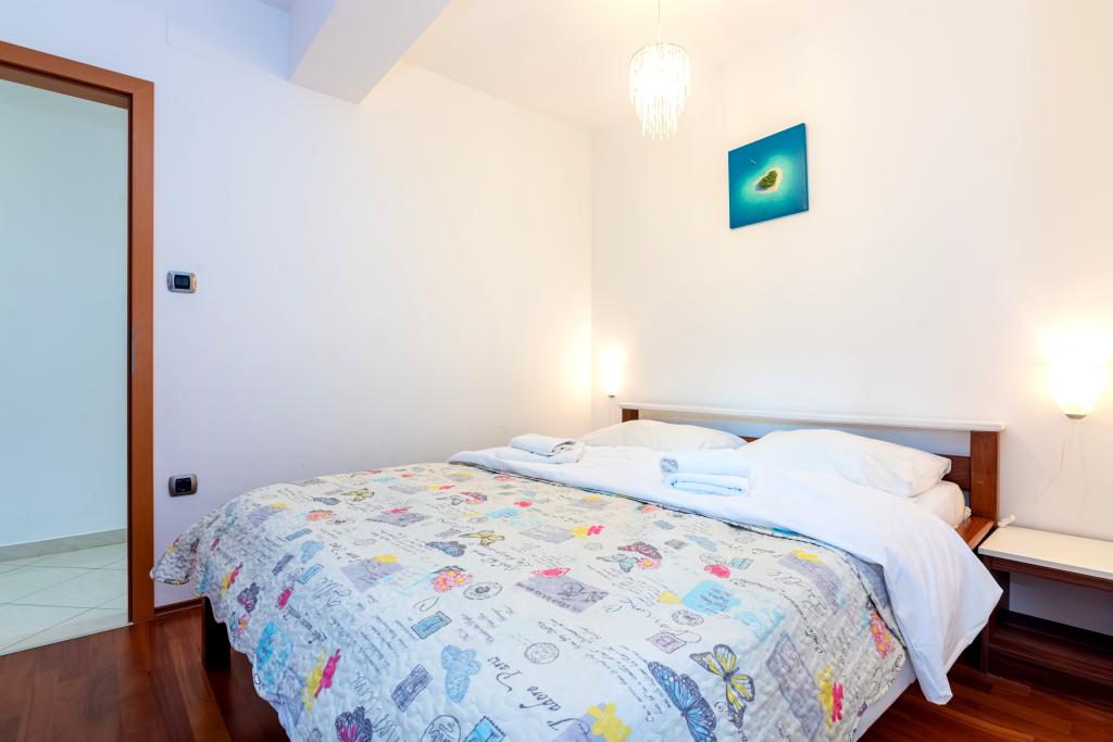 The apartment is located on the 2nd and 3rd floor. It has 2 double rooms with double beds, 1 double room with single beds, living room with sofa for 2 people, 2 bathrooms, fully equipped kitchen and dining room. This apartment is located approximately 3 minutes' walk from the central beach. Located in a quiet area, this modern apartment is equipped with 3 air conditioners, free WiFi internet, SAT-TV, a spacious terrace, and free private parking in front of the house. The facility is also near a small shop and restaurant.