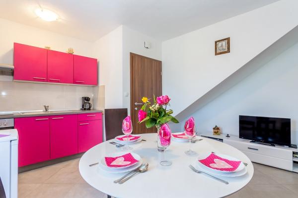In one word, the apartments are great. The hosts are primarily very friendly and take care of the cleanliness of the pool and stairs every day. There were twenty of us. Mrs. Tanja hosted us all in the middle of the week. We didn't lack anything. We had everything from dishes, enough for all of us, we even had a grill, which we used, of course. There were also multiple clothes dryers, so our towels were dry by the next day (and earlier). Seats for two hundred Thank you for a nice stay
