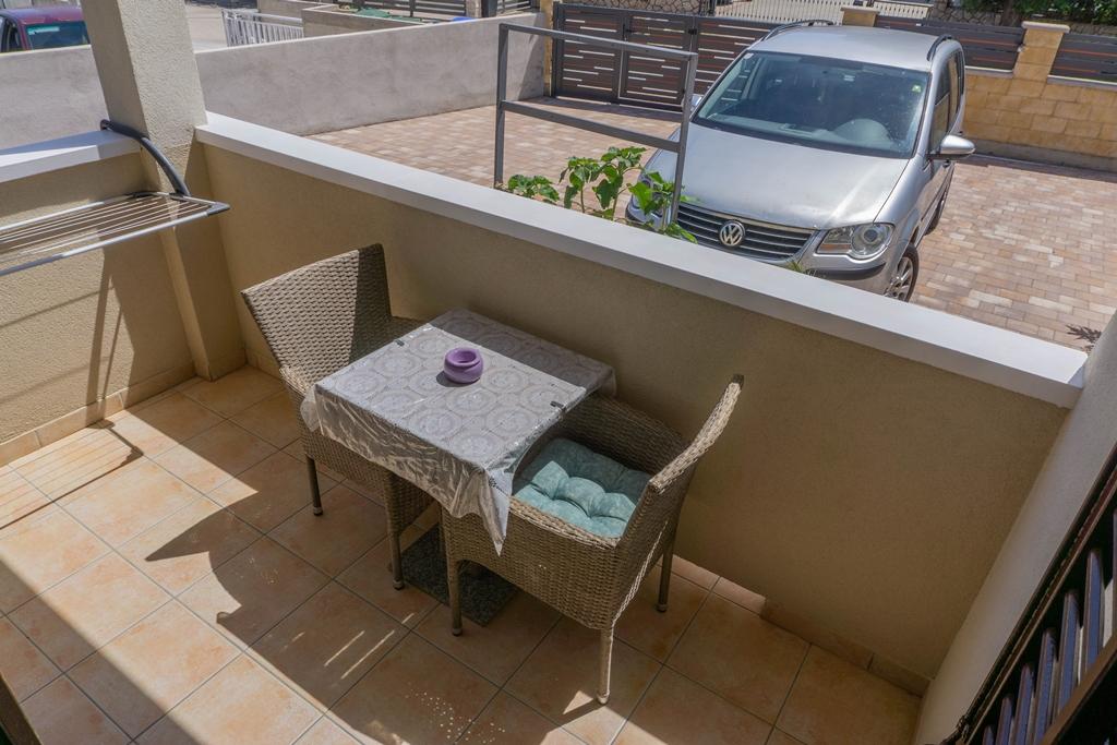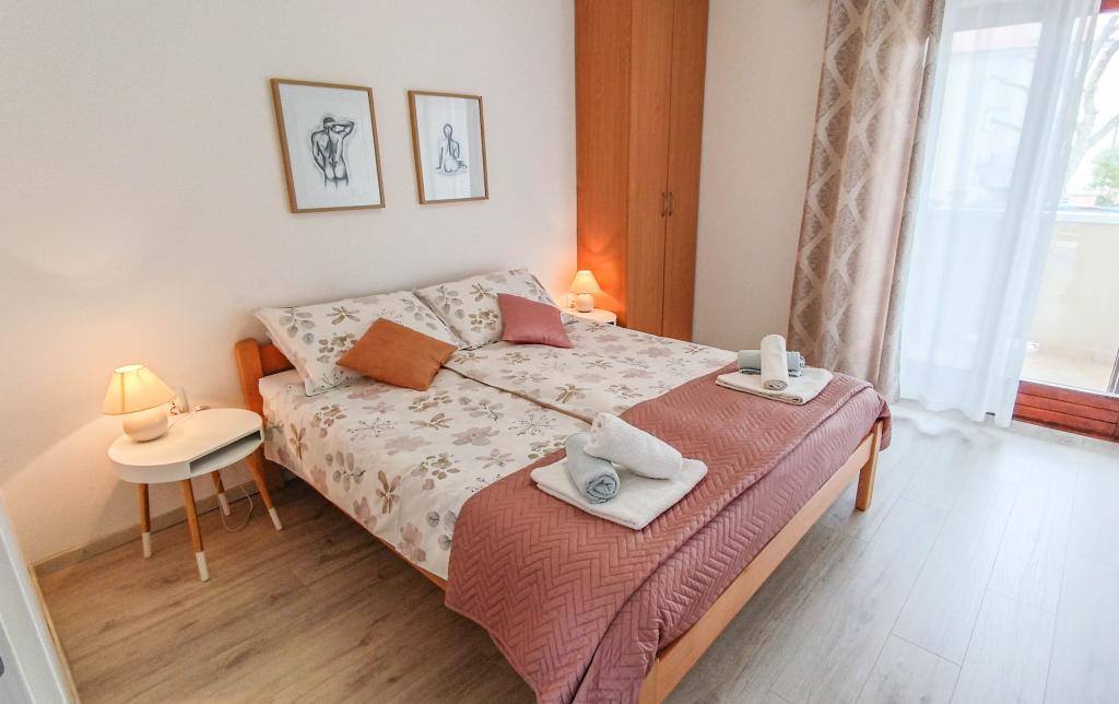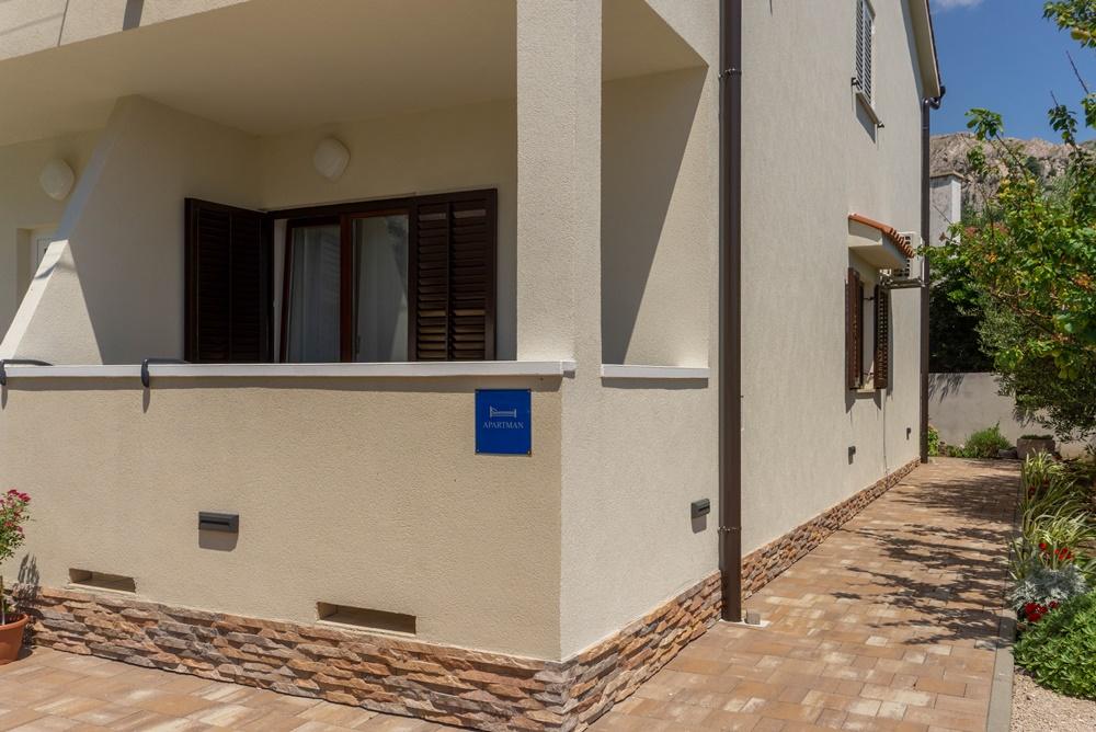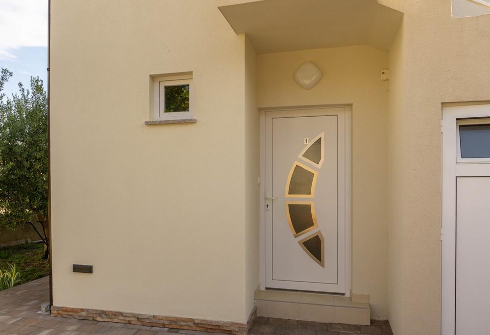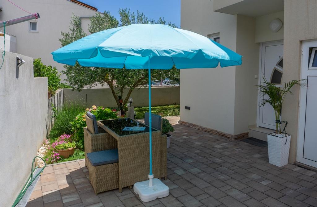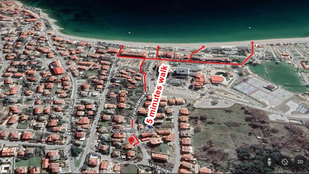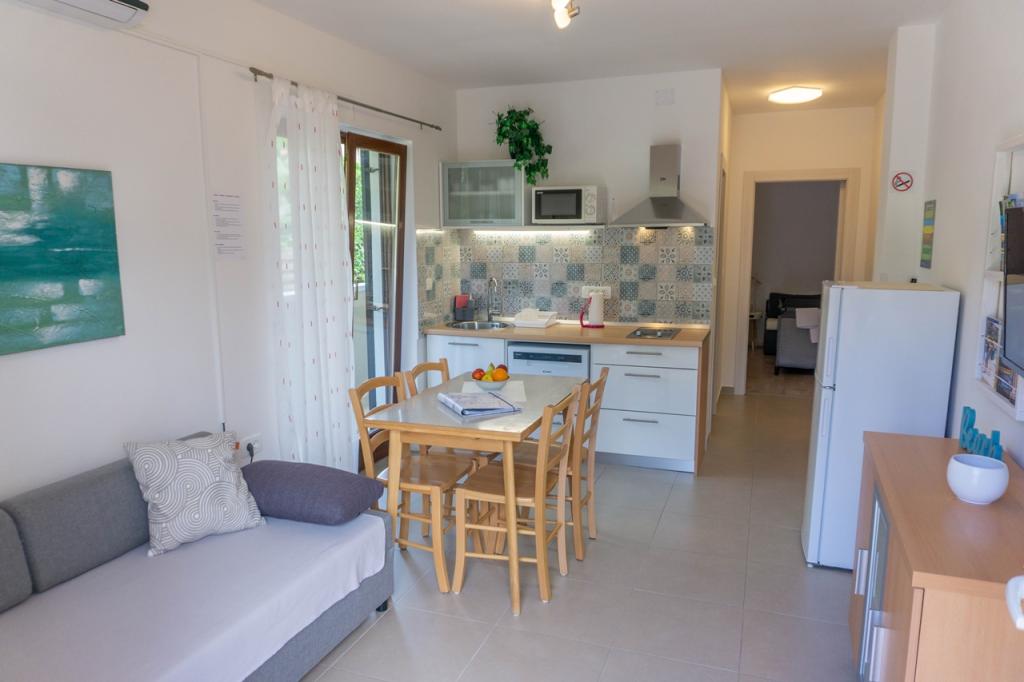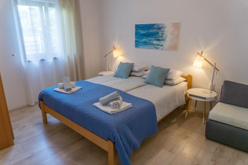 Apartments Jadran are located in a family house in a quiet area, only 300 m (approx. 5-minute walk) from the sea and the main beach. The property offers two modern ground-floor apartments, with one secured parking space per unit in the courtyard. The location is excellent for nature lovers (cycling and hiking trails) and those interested in exploring cultural heritage and archaeological sites. Apartment Jadran 1 (30 m² including terrace): Features a bedroom with a double bed (160x200), a bathroom with a shower and hairdryer, and a living area with a kitchenette. The living room includes an extra bed (85x200) for a child up to 12 years old. Apartment Jadran 2 (37 m² including terrace): Features a bedroom with a double bed (160x200) and an armchair bed (80x200) for a child up to 10 years old, a bathroom, and a living area with a kitchen. The living room includes a sofa (90x200) for a person up to 18 years old. Both apartments are air-conditioned, with free Wi-Fi and satellite Smart TV.