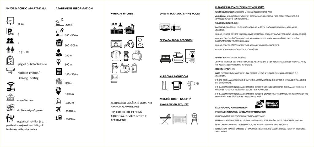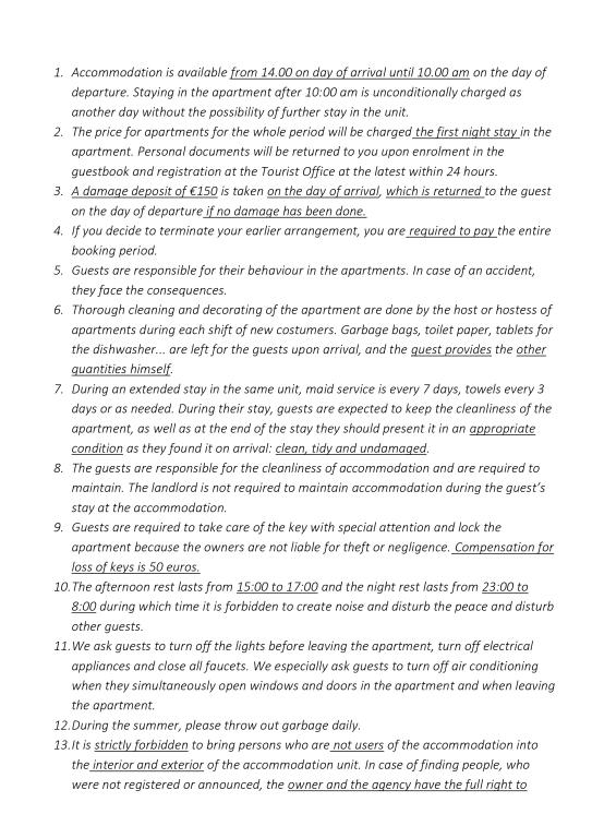 Read more Accommodation unitsCheck-in/out: Check-in is after 14:00, and check-out is by 10:00. Payment: Reservations are confirmed by a 30% deposit payment. The remaining balance is paid upon arrival. Damage deposit: A deposit of €150 is required upon arrival, which is refunded on the day of departure if no damage has occurred. Pricing: For stays of up to 3 nights, the price is 30% higher. The surcharge for an extra person is €10 per night. House rules: Unregistered guests and pets are not allowed. Quiet hours: 15:00–17:00 and 23:00–08:00. Season: Closed from Oct 31 to Mar 15. Bookings for 2026 are accepted from Jan 1, 2026.