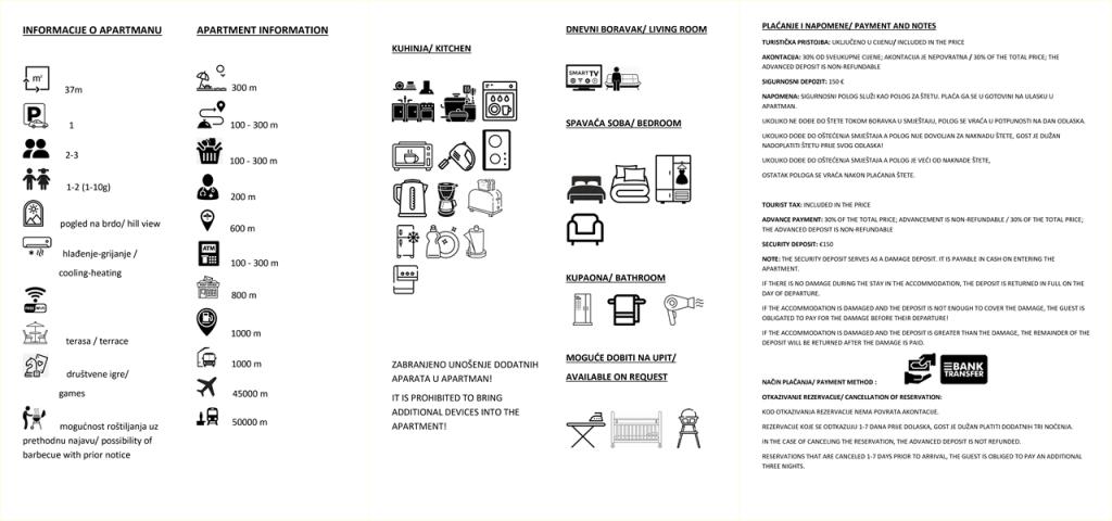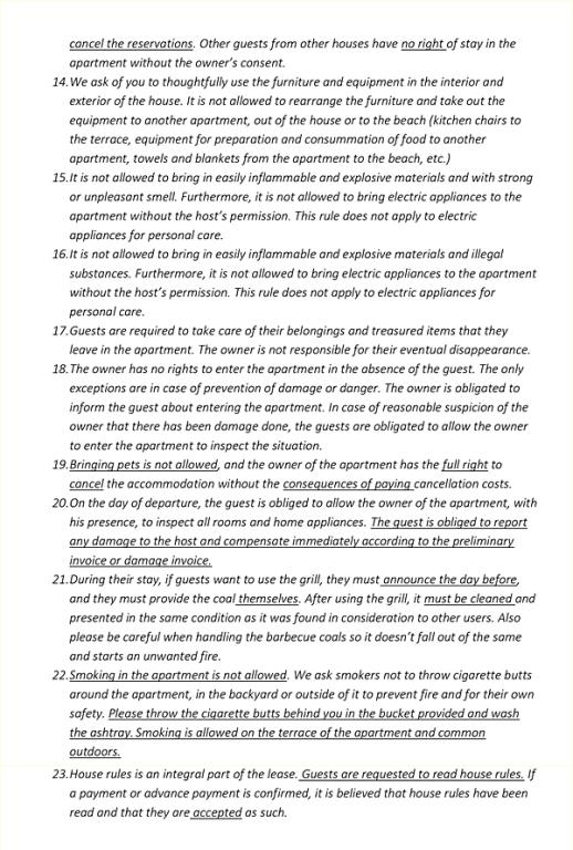 Residential tax is included in price.Non-refundable deposit: The 30% deposit serves as a booking guarantee and compensation in case of a no-show; it is non-refundable. Early departure (guest's choice): If a guest decides to shorten their stay voluntarily, they are required to pay the full amount of the reservation. Damage: The €150 deposit covers potential damage. If the damage exceeds the deposit, the guest is required to pay the difference immediately. House rule violations: In case of a violation of the rules, the owner has the right to cancel the reservation. In this event, the amount for the remaining days (starting from the following day) will be refunded to the guest.
