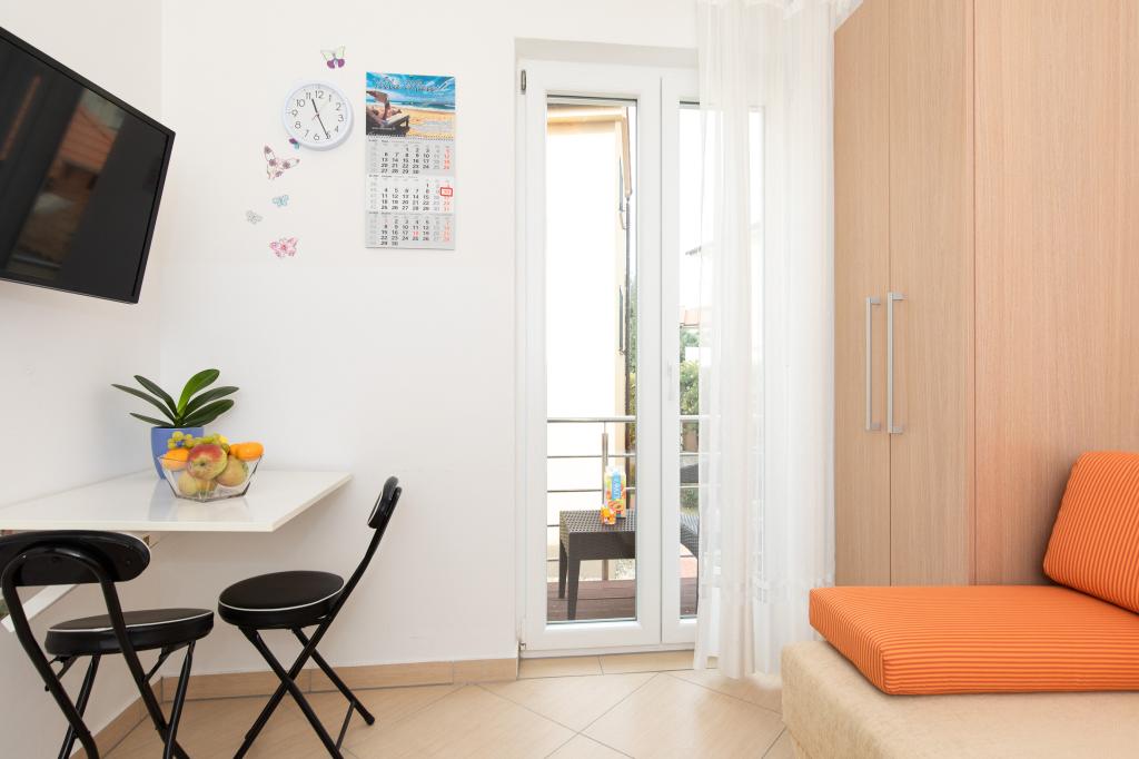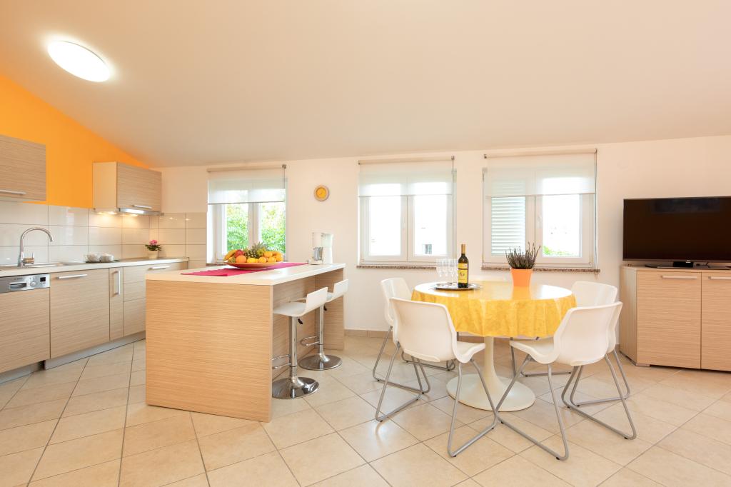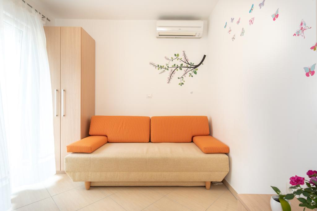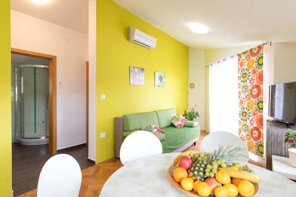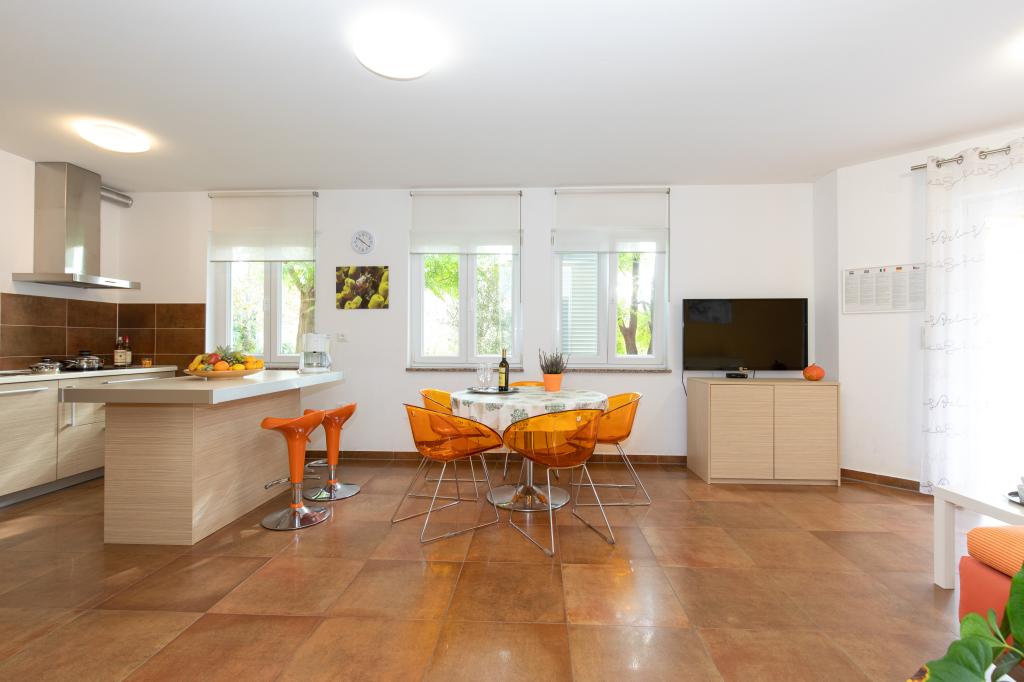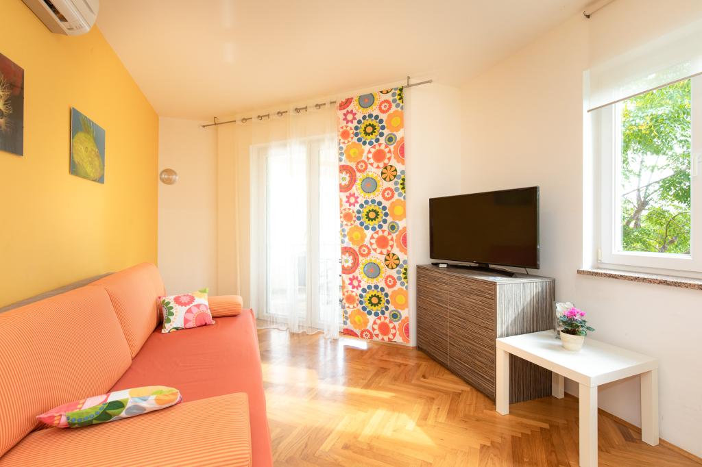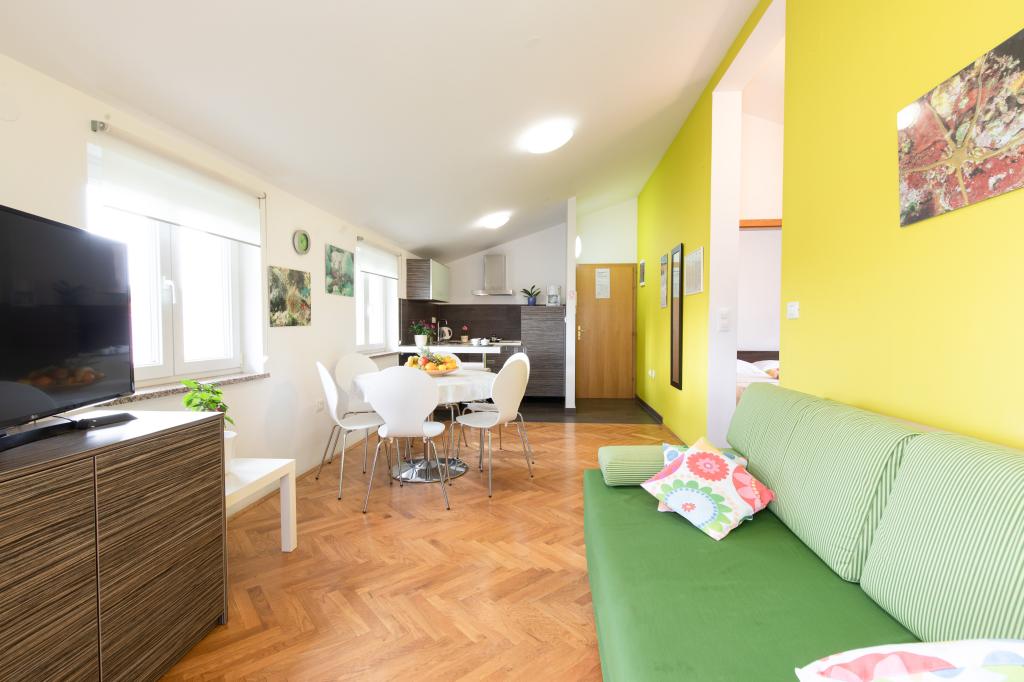 Apartments VillaMare are located in a quiet part of Baška, a 5-7 minute easy walk to a beautiful sandy beach as well as the center itself with all the amenities offered by a tourist town. There are 5 apartments in the 4**** category: 4 x A/4+2 for max 4-6 people, 1 x A/2+2 for max 2-4 people and a nice studio for max 1-2 people. All apartments are air-conditioned and modernly equipped, free WiFi, satellite TV, 1 parking space per apartment; in the courtyard part, a garden area with a barbecue, a wooden gazebo and a children's playground is available to all guests. A cot, high chair/feeding table, washing machine are available on request. All apartments in the extension have a comfortable terrace where you can completely relax and enjoy the beautiful view of Baška and the mountain that surrounds it, while the apartment on the ground floor has an additional extended terrace with deckchairs and direct access to the beautiful garden (...and fig trees :- )