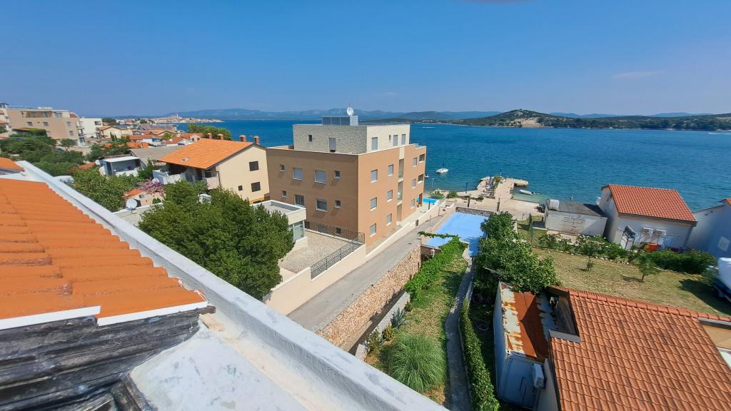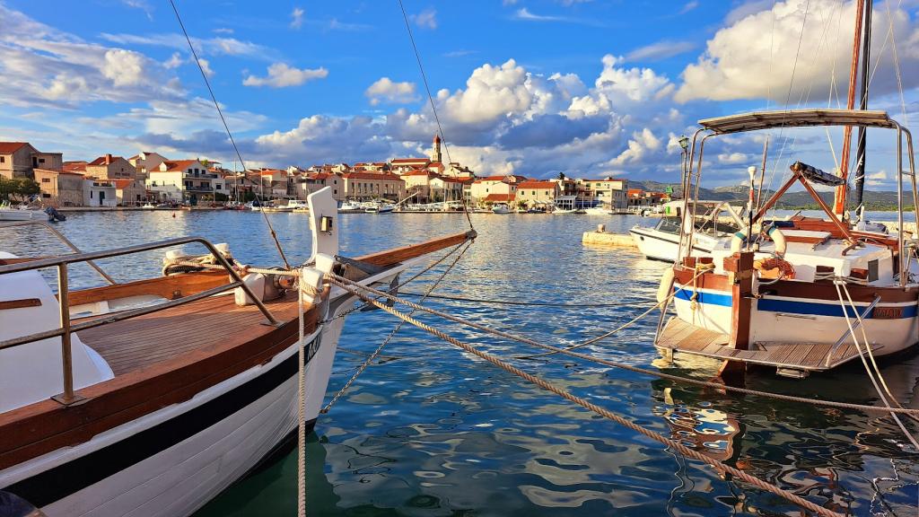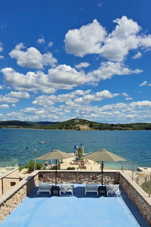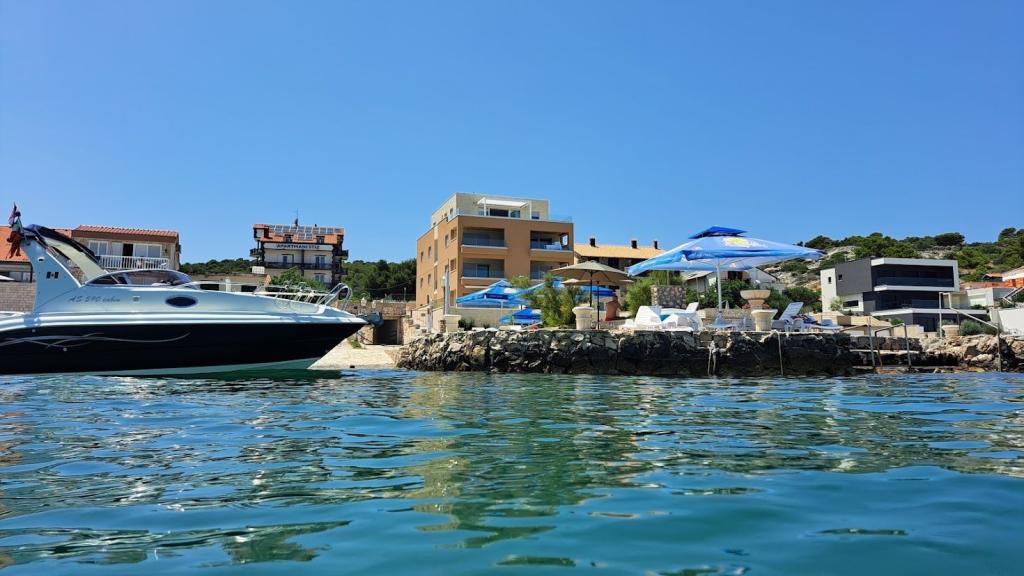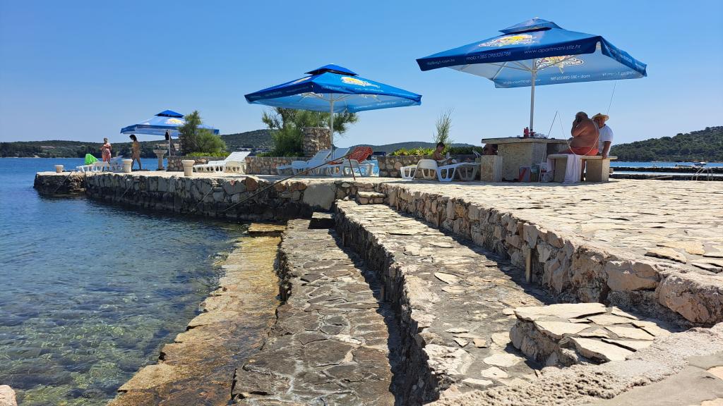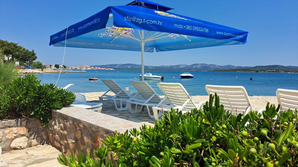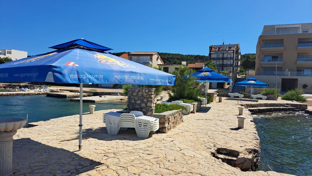 Apartment house ŠTIZ-BETINA – Your ideal vacation by the sea! Located directly on the coast in Betina on the island of Murter, apartment house ŠTIZ-BETINA offers the perfect setting for a relaxing vacation. Our well-maintained stone beach is equipped with deck chairs and large umbrellas that you can use free of charge. Are you coming by boat? We offer a launch and a berth for boats up to 7 meters long, with secured parking for a trailer within the fenced yard. Location: The house is located 1.5 km from the center of Betina, where you will find the old town center, shops, cafes, restaurants and the main town beach. The island of Murter is easily accessible by car because it is connected to the mainland by a drawbridge, which rises twice a day. We offer: six apartments (2+2) and four studios (2+1). Each accommodation unit includes: a fully equipped kitchen, air conditioning, free Wi-Fi, flat-screen SAT HDTV, toilet with shower, bed linen and towels. All apartments and studios have a beautiful view of the sea and garden.