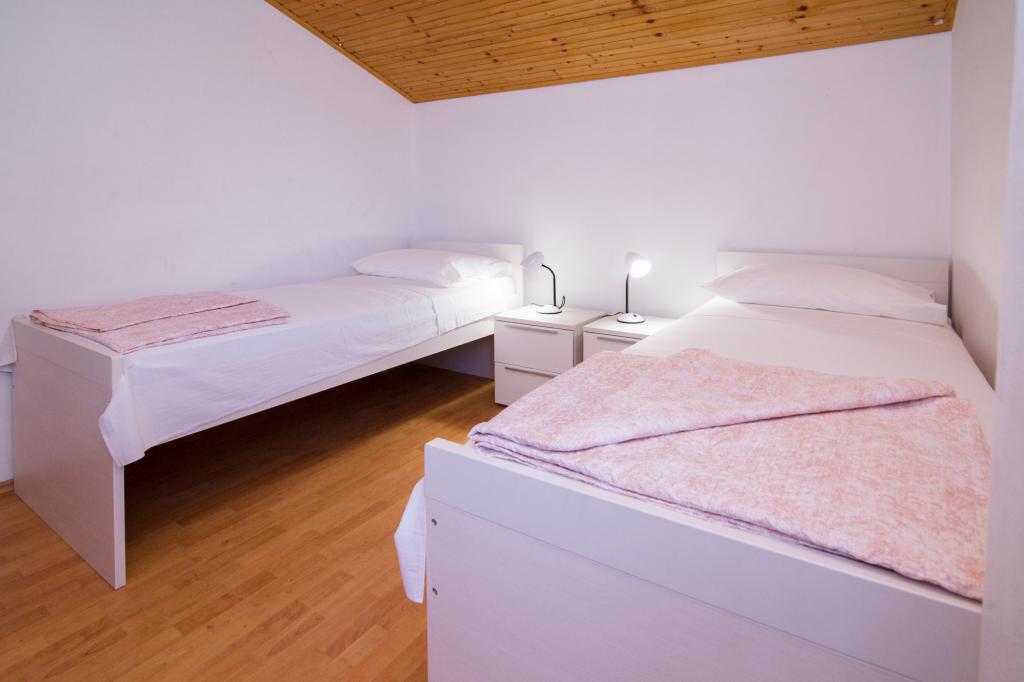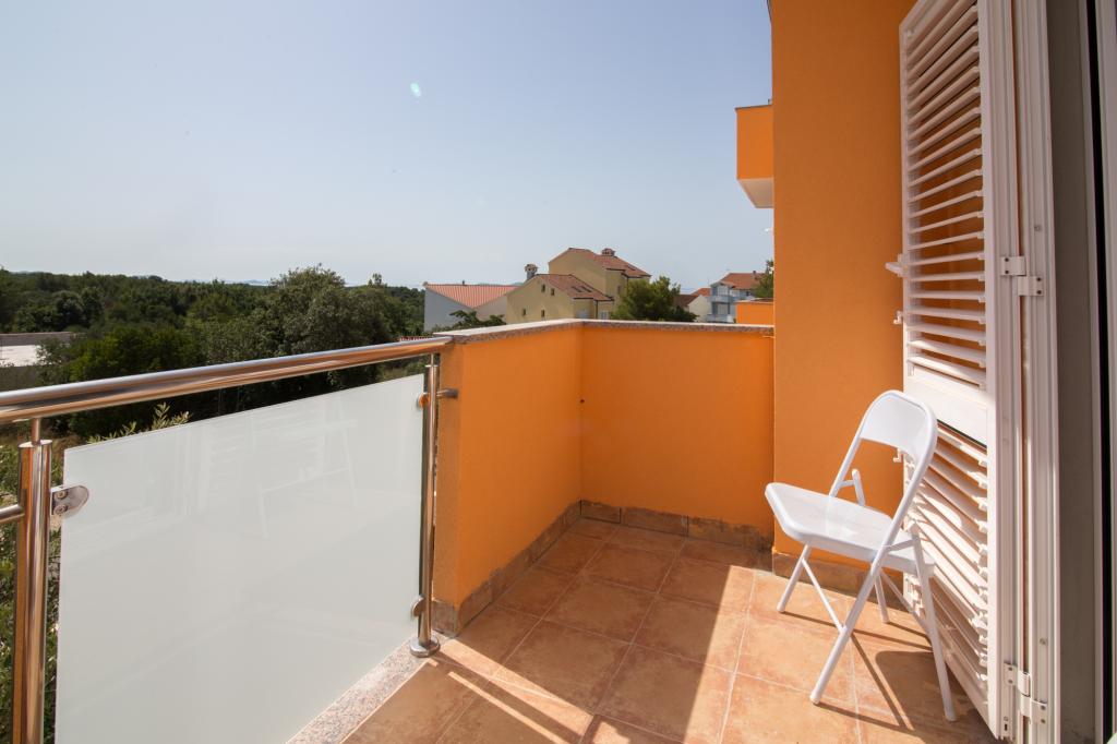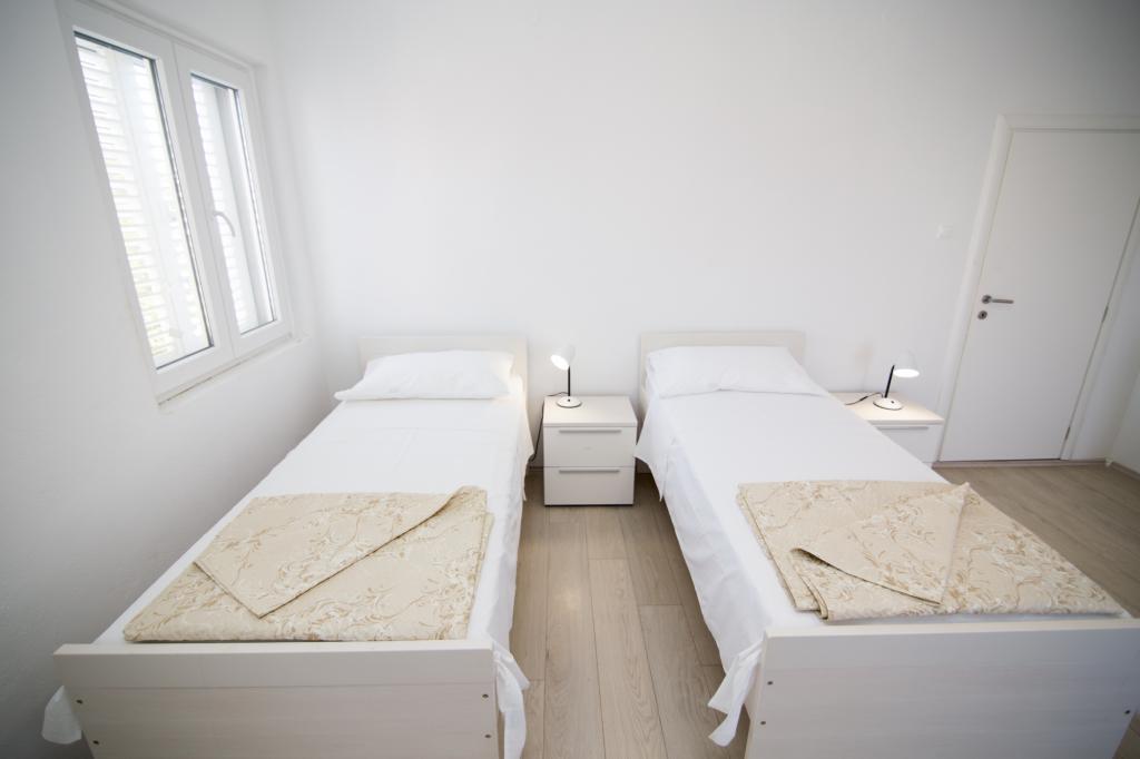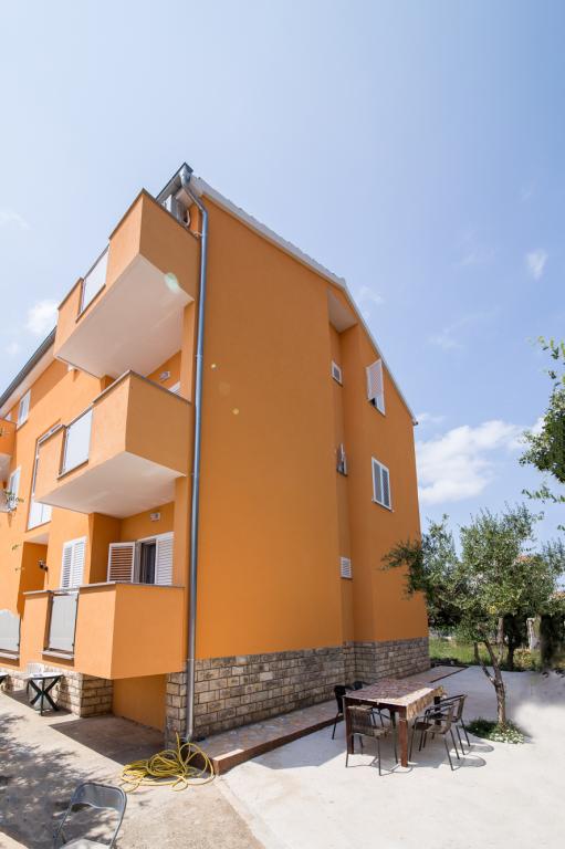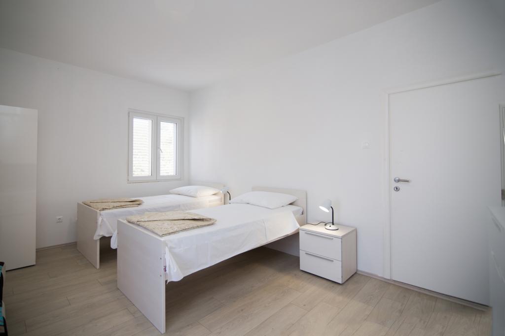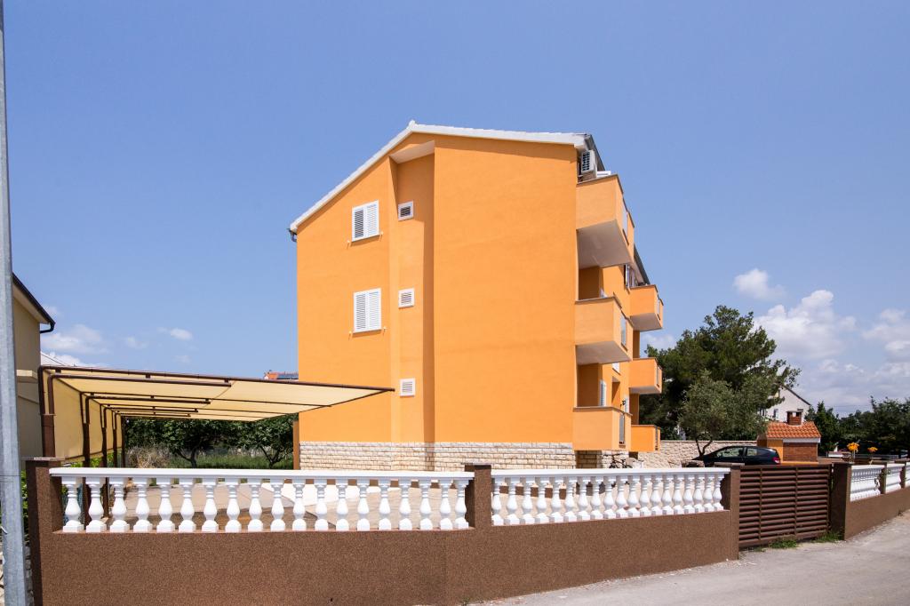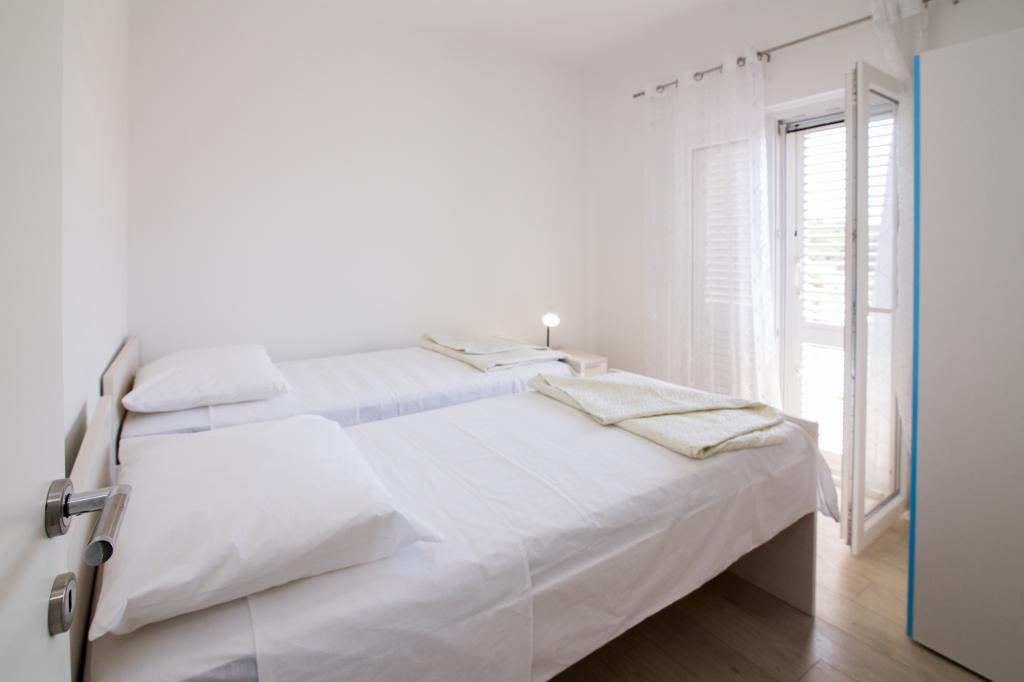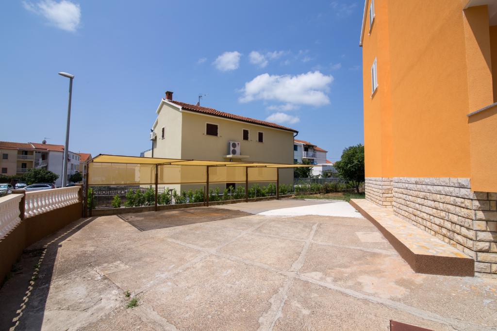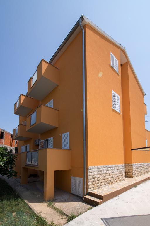 Apartments Jadran are located in a quiet apartment complex in Biograd na Moru Kumenat, located away from the city center, next to a tourist camp surrounded by pine forests. The town center can be reached by a 10-minute walk along the promenade along the sea. The distance from the beach of the same name, Kumenat, is about 100 meters, and from the second sandy beach, Soline, about 300 meters. The apartments are located on the second and third floors of a family house with a view of the sea and islands, with a total area of 65m2 each apartment, consisting of two separate rooms with beds, extra beds and another room with two beds, a kitchen-living room, hallway, bathroom, two terraces. Each apartment has 2 rooms, plus an extra bed, so the accommodation is suitable for 5 people, and two terraces on the front and back of the house where you can enjoy and relax with the morning chirping of birds and enjoy the view of the sea and islands as well as romantic sunsets. The number of nights depends on the choice of guests, the price list is available by clicking on the price list button. Welcome!