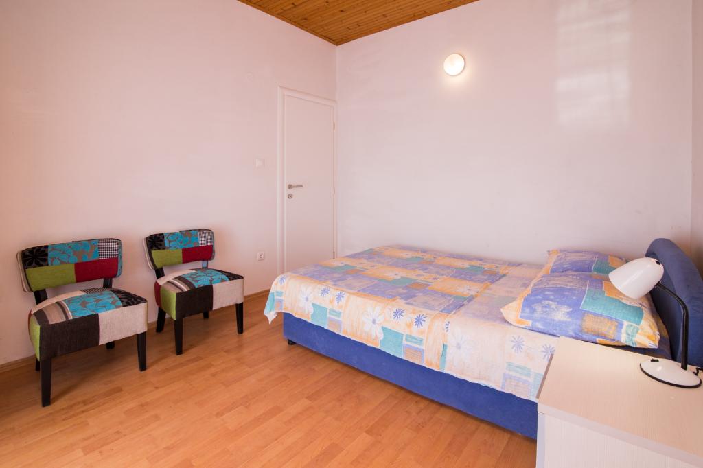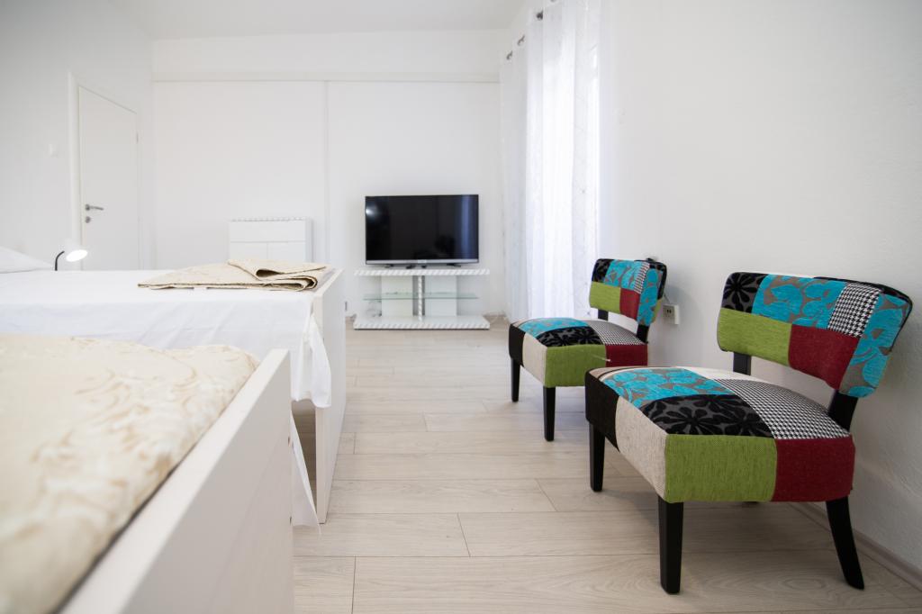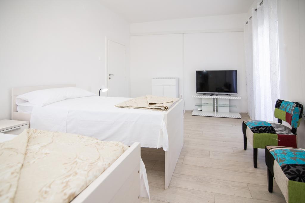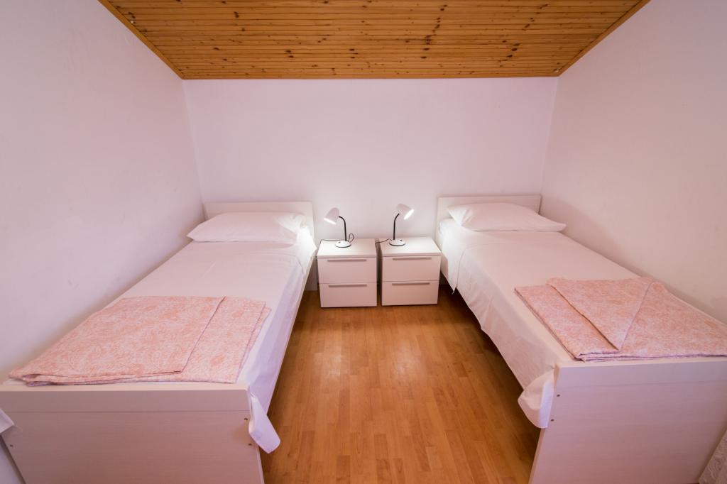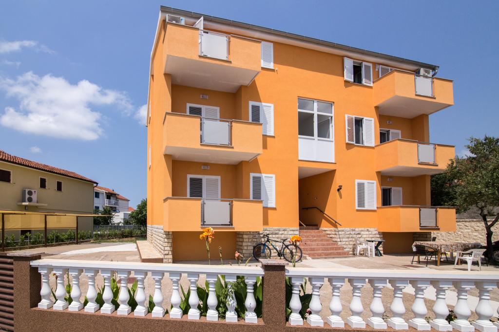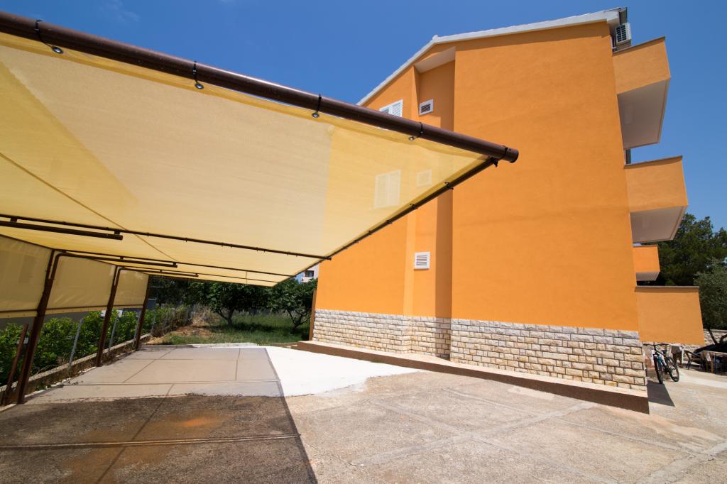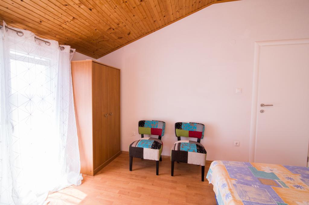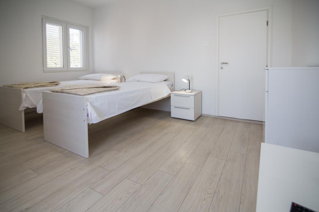 Apartments Jadran are located in a quiet apartment complex in Biograd na Moru Kumenat, located away from the city center, next to a tourist camp surrounded by pine forests. The town center can be reached by a 10-minute walk along the promenade along the sea. The distance from the beach of the same name, Kumenat, is about 100 meters, and from the second sandy beach, Soline, about 300 meters. The apartments are located on the second and third floors of a family house with a view of the sea and islands, with a total area of 65m2 each apartment, consisting of two separate rooms with beds, extra beds and another room with two beds, a kitchen-living room, hallway, bathroom, two terraces. Each apartment has 2 rooms, plus an extra bed, so the accommodation is suitable for 5 people, and two terraces on the front and back of the house where you can enjoy and relax with the morning chirping of birds and enjoy the view of the sea and islands as well as romantic sunsets. The number of nights depends on the choice of guests, the price list is available by clicking on the price list button. Welcome!