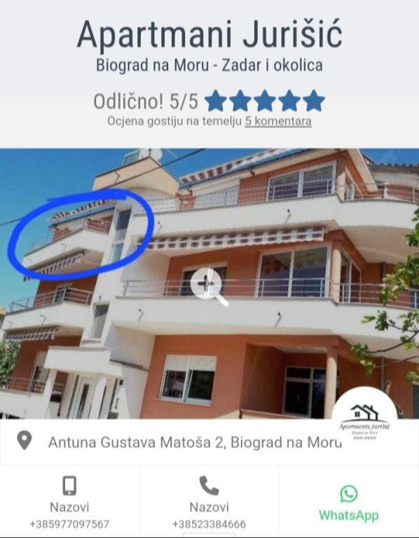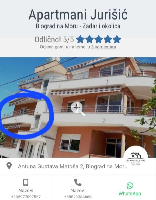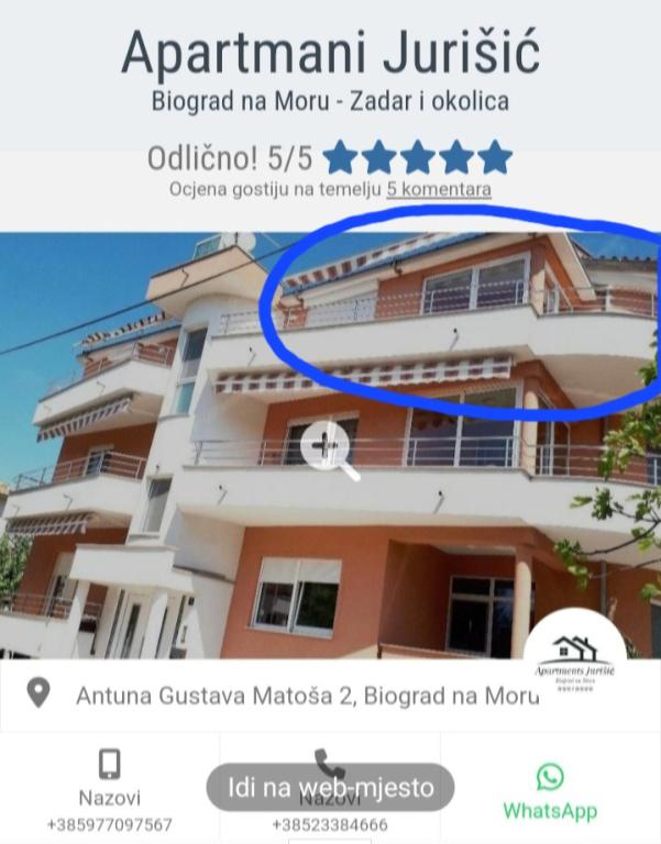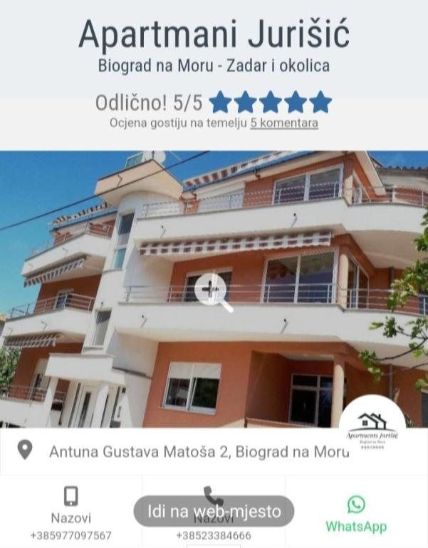 We are the Jurišić family, which has a long tradition of tourism, more than 40 years. In a quiet part of the city center of Biograd na Moru (near the "Ilirija" hotel), our two houses are located, located only 50 meters from the sea, promenade, waterfront and other facilities... restaurants, shops, post office... All apartments have air-conditioned accommodation (there is an air conditioner in each room and living room), there are mosquito nets on the windows, and each apartment has its own balcony, secured parking, Wi-Fi and barbecue for use. Prices (by dates) are listed in the price list of each apartment (extra bed - sofa for additional 2 people/children is paid +10 euros/night).