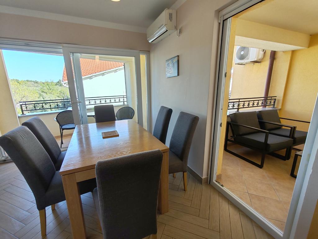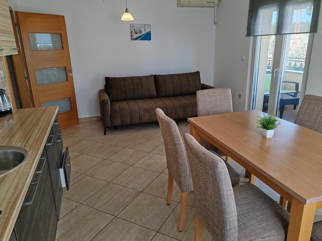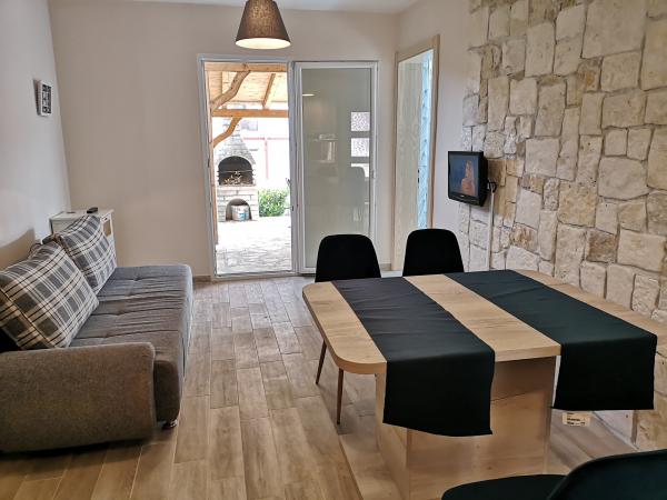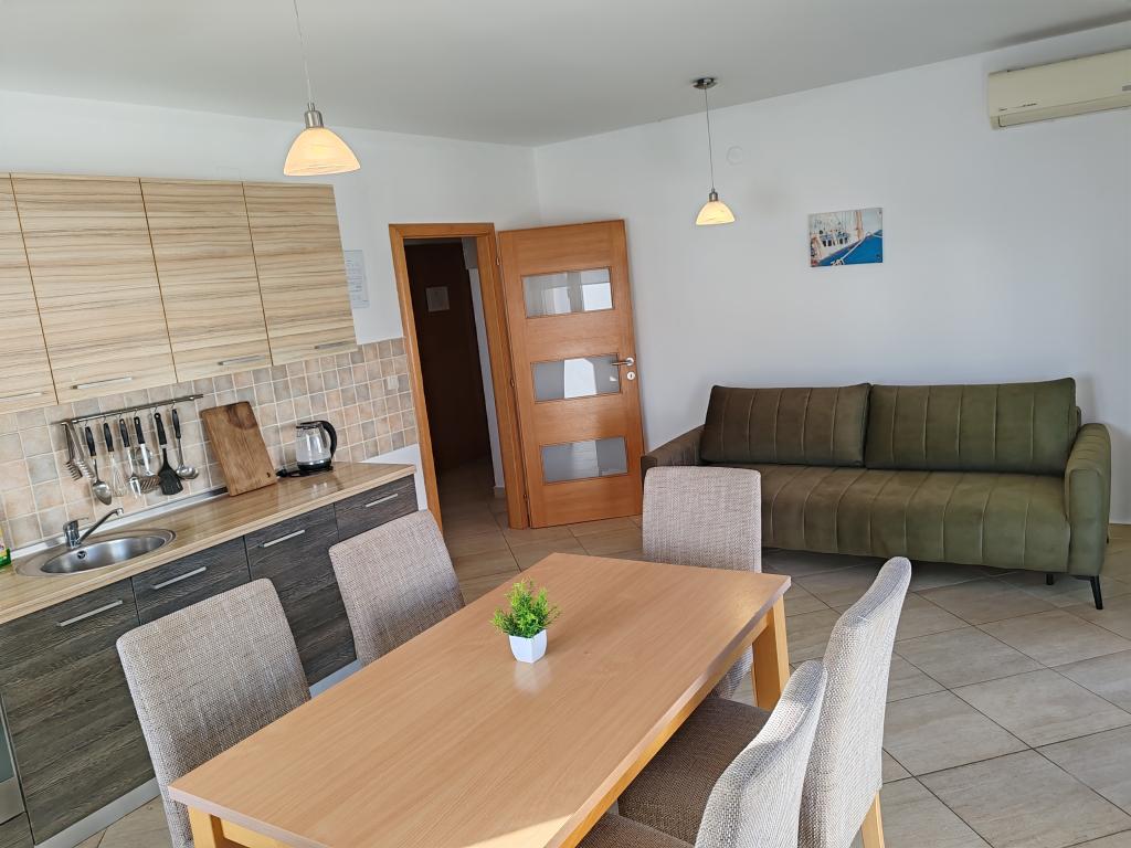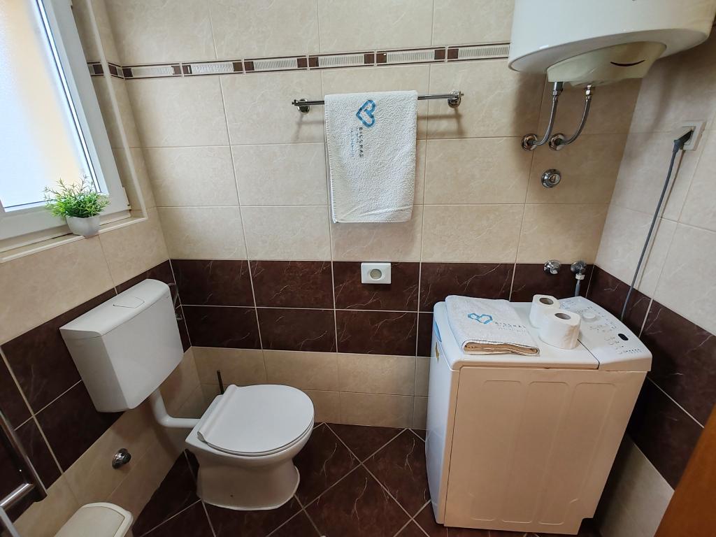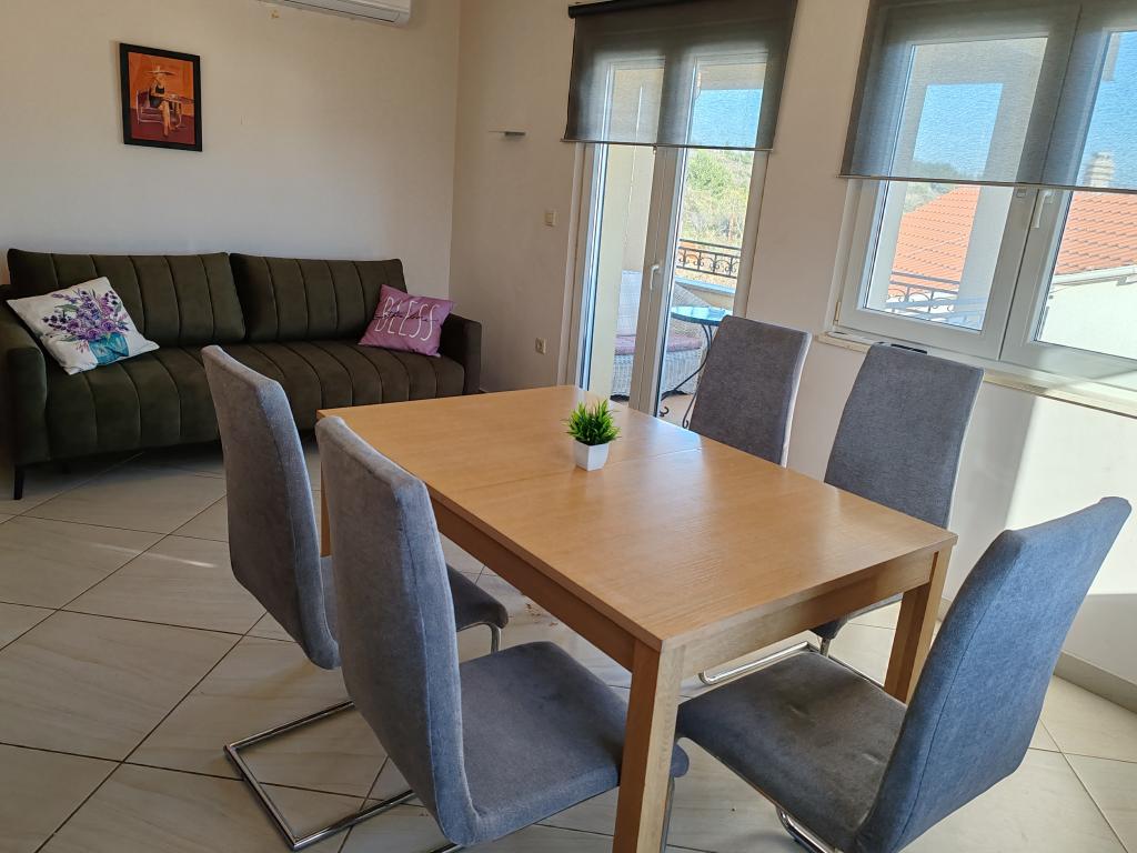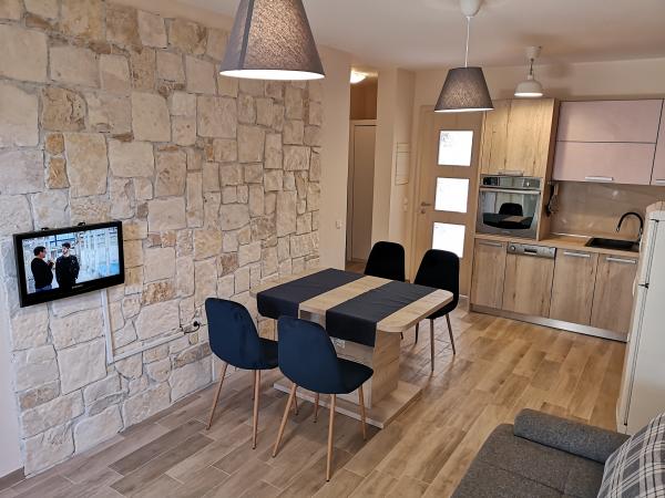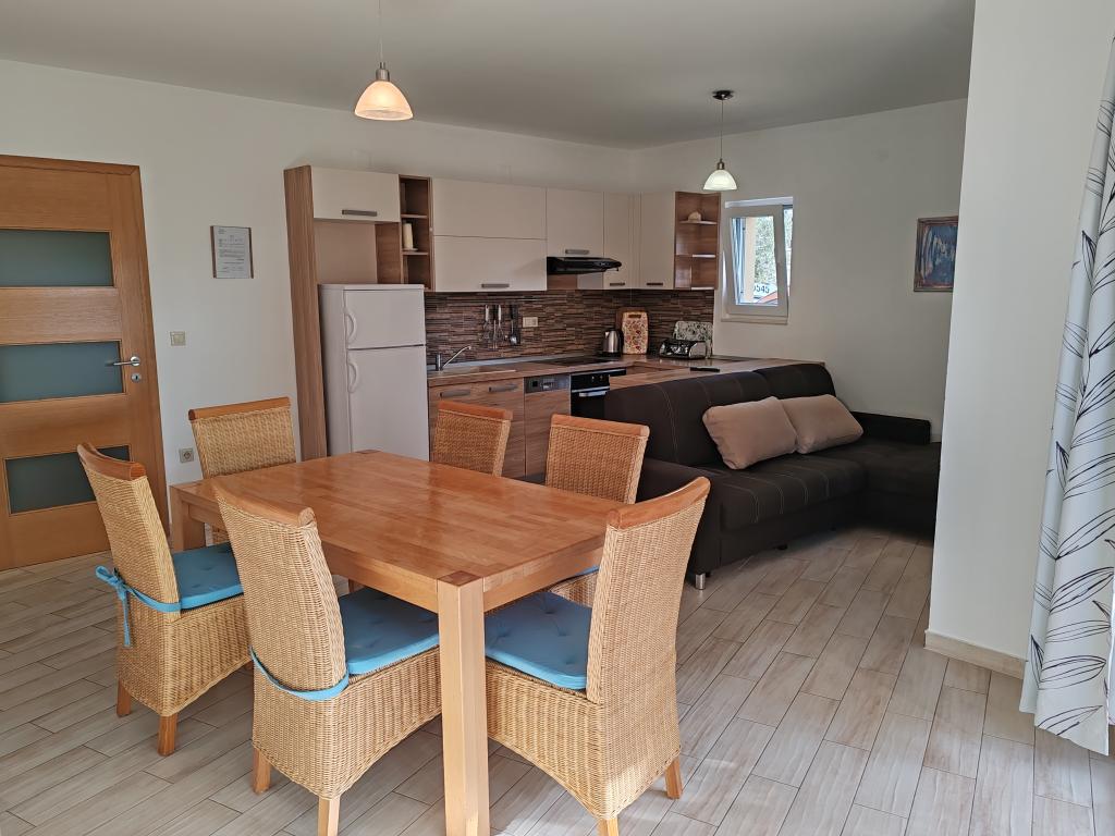 The apartments are located in a house located in the quiet settlement of Kumenat. It is surrounded by greenery and nature, only 250 meters from the sea. The facility consists of 5 apartments with a capacity of 4-6 people. All apartments are air-conditioned, with TV and a terrace with a view of the sea. Each apartment has a washing machine. Around the building, parking is provided for all guests, and if desired, the use of an outdoor grill.