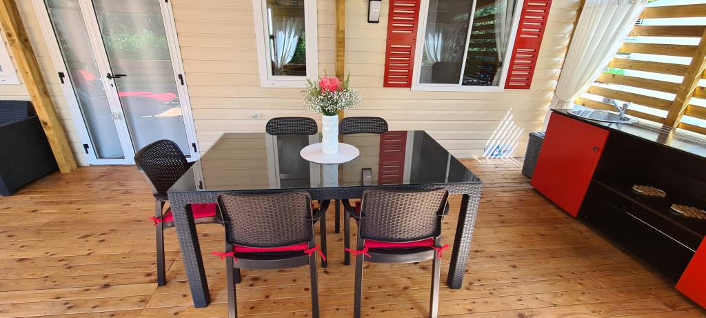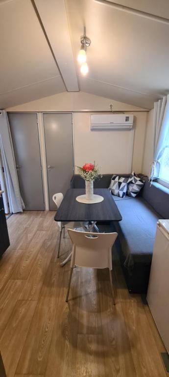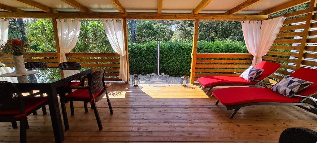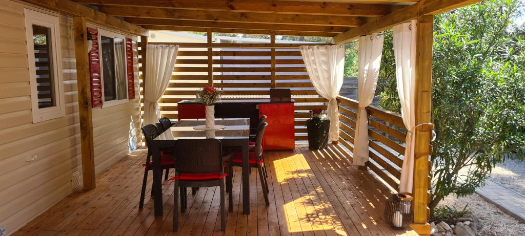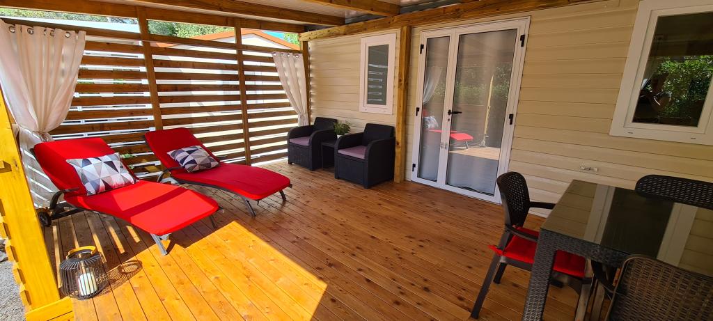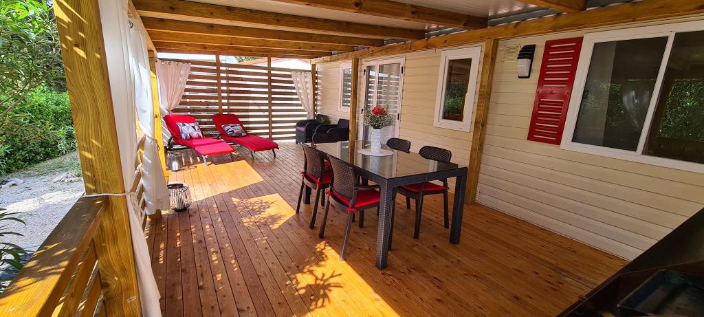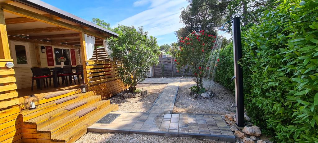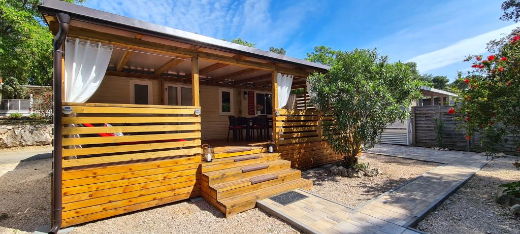 Blue Wave Mobile Home II is located in the first row to Soline bay, protected from view. A fully equipped mobile home with two separate bedrooms with wardrobes, a living room with an auxiliary pull-out bed (135x190), a fully equipped kitchen with air conditioning and a large terrace. There is a barbecue, a dining table and comfortable deck chairs on the terrace. Wireless internet access is available throughout the area free of charge.