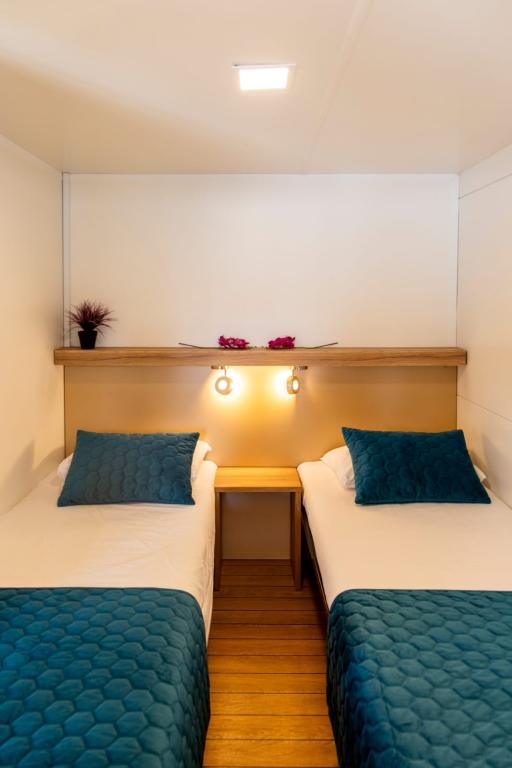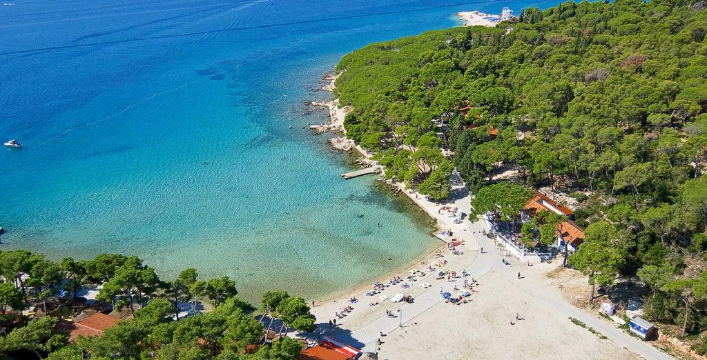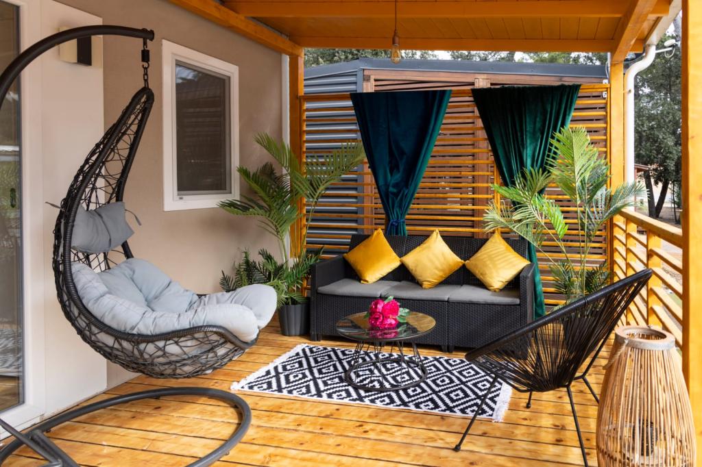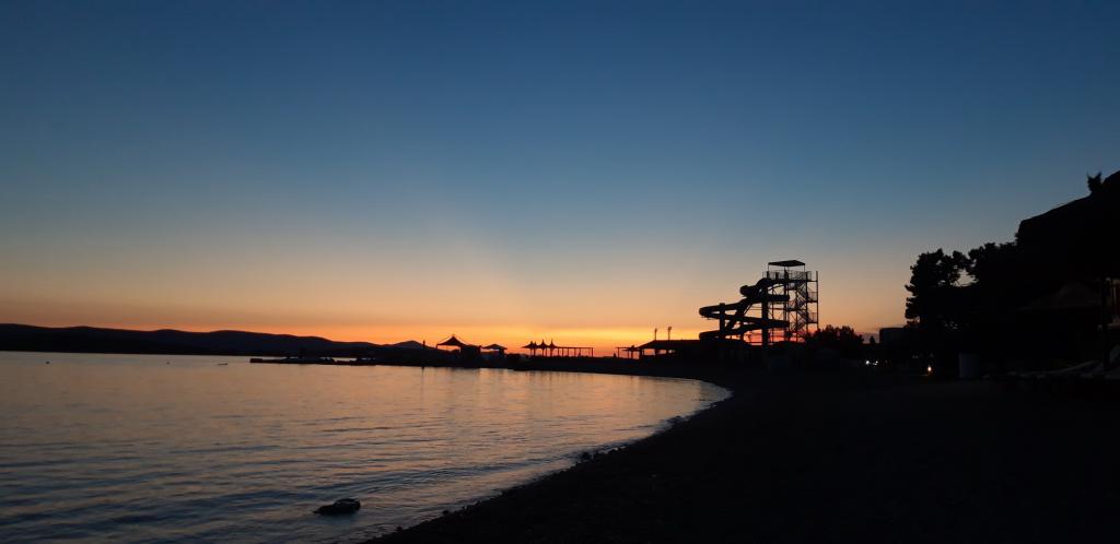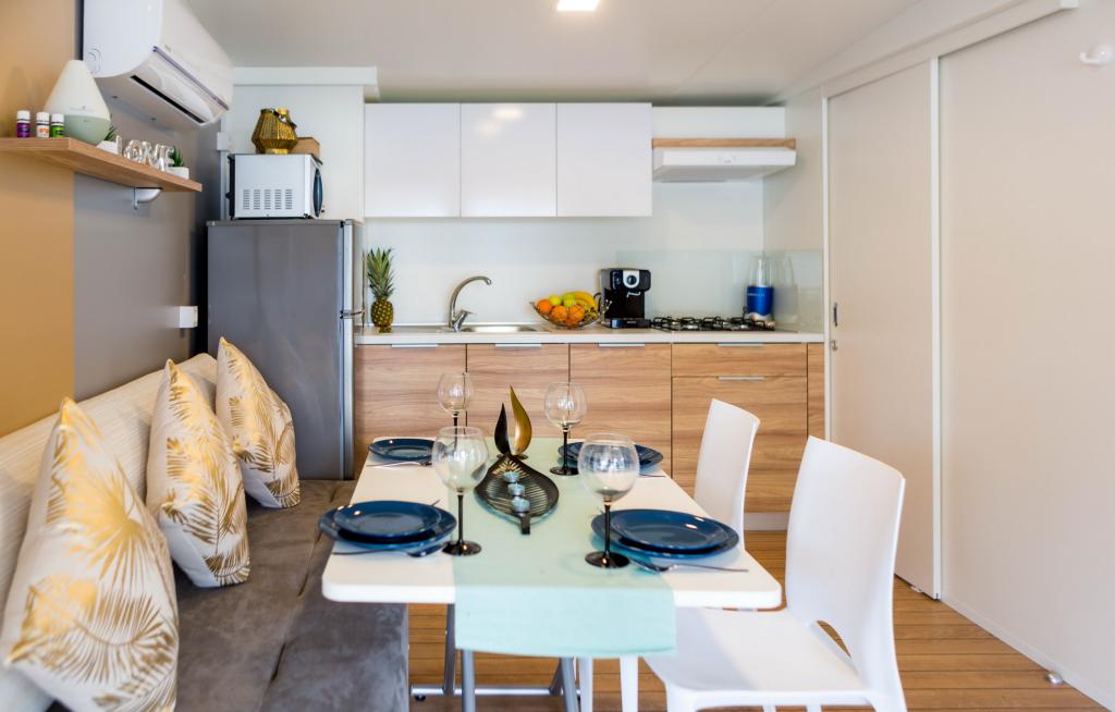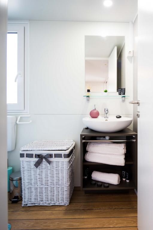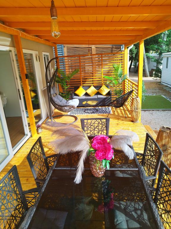 Mobile home Nancy is located in Camp Soline in Biograd na Moru, just two minutes from the beautiful pebbly beach. It is equipped with two rooms, one with a bed (160 x 200 cm) and its own toilet/bathroom. The second room has two beds (80 x 200 cm) that can easily be combined into a larger bed. It has a living room, a fully equipped kitchen, an additional toilet/bathroom, a dishwasher, a microwave, a freezer, a coffee machine and a sofa that can be folded out into a bed that can sleep two people. The house can accommodate six people (4 2). On the beautiful and spacious terrace you can relax and enjoy the sunset and a good drop of wine. In Kampo you have a restaurant only 200 m from the house, there are also various cafes and restaurants as well as playgrounds for children. Daily animations are held for our youngest guests. The center of Biograd can be reached by a path through a dense pine forest that provides shade, along with all kinds of attractions for both our youngest and adults.