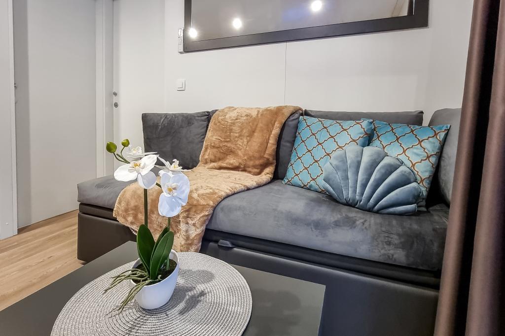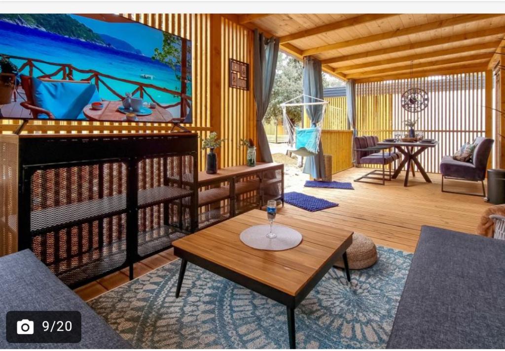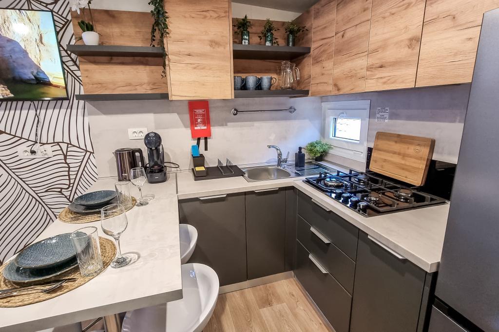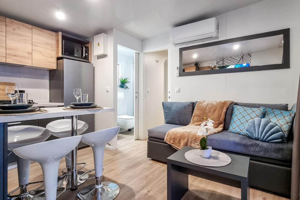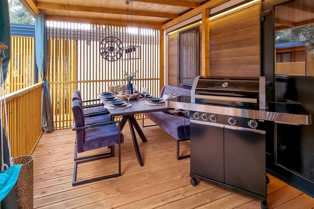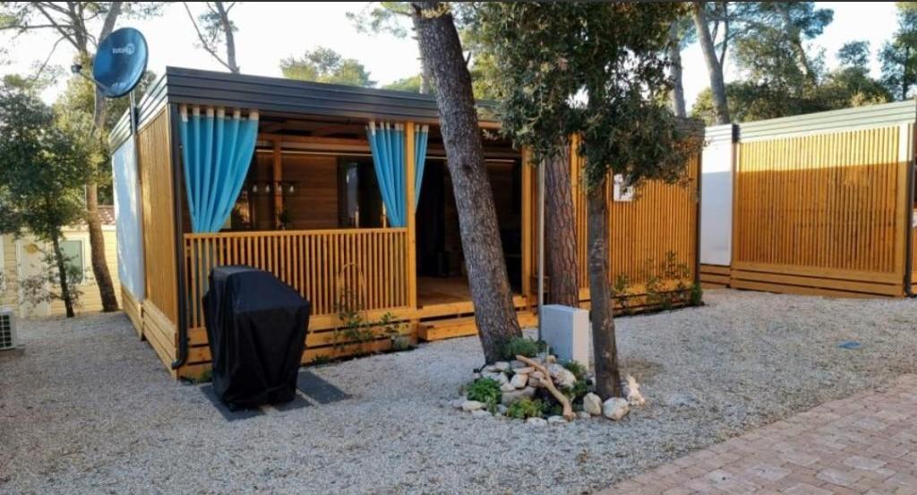 Our modernly equipped mobile home offers comfortable accommodation for up to 6 people, with 2 spacious bedrooms, a living room with a sofa bed and 2 bathrooms. Enjoy the large covered terrace equipped with a dining area and an outdoor living room, ideal for long evening gatherings. Here you can enjoy darts or relax in front of the big TV, while grilling on our large gas grill and outdoor stove. The covered terrace is surrounded by pine trees and a gentle breeze from the sea. On one side of the terrace there is a spacious dining area equipped with a comfortable sofa and even more comfortable armchairs, while on the other side, our outdoor living room offers a comfortable seating area where you can not only relax, but also enjoy your favorite TV shows on the huge TV with available satellite TV channels, Netflix and HBO GO. The house is located 3 minutes from the beautiful beach.