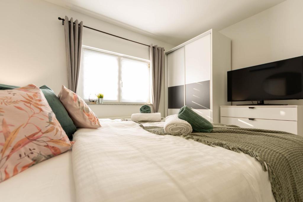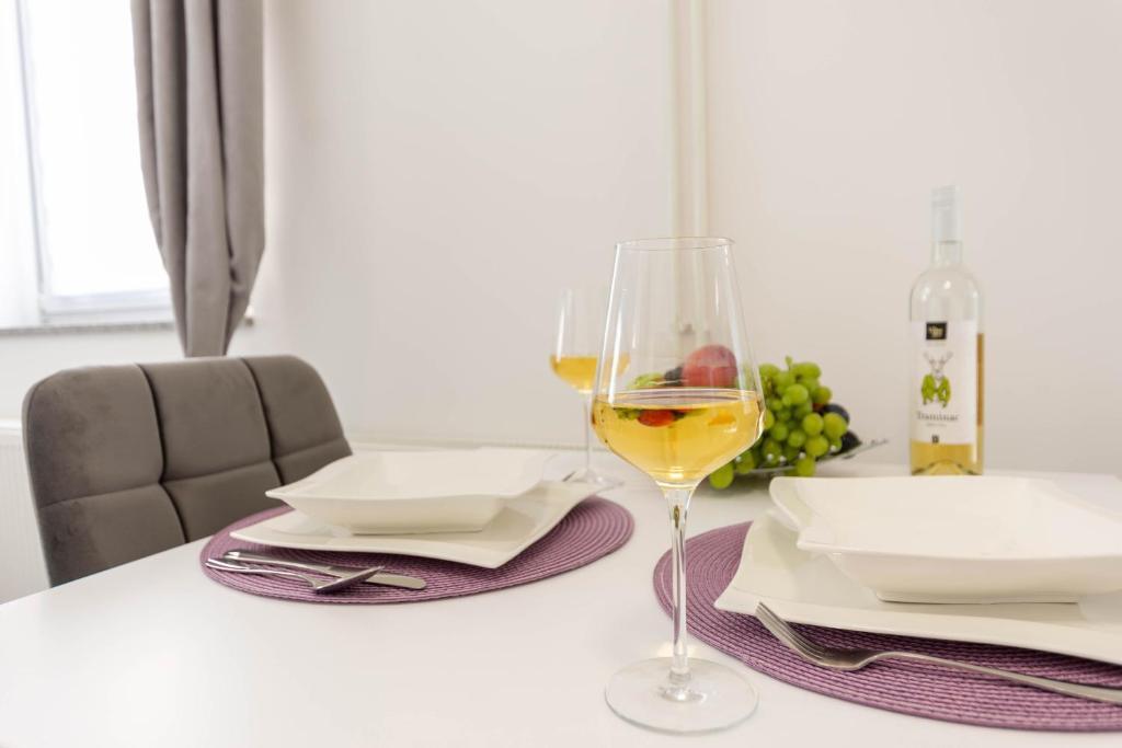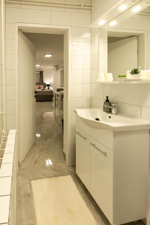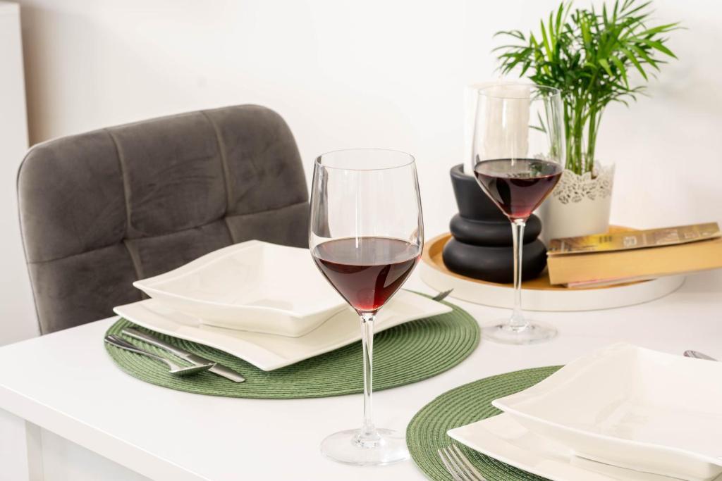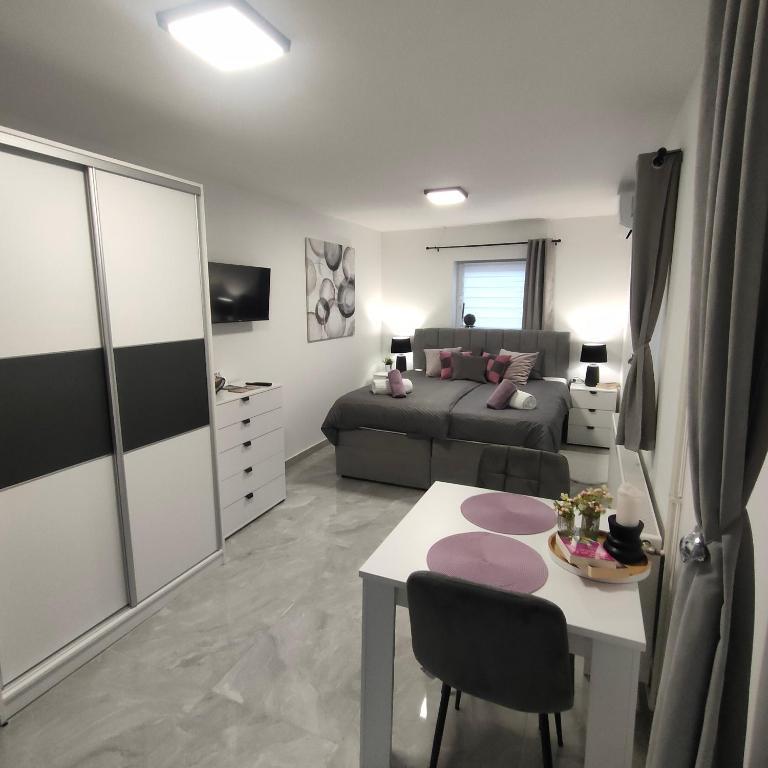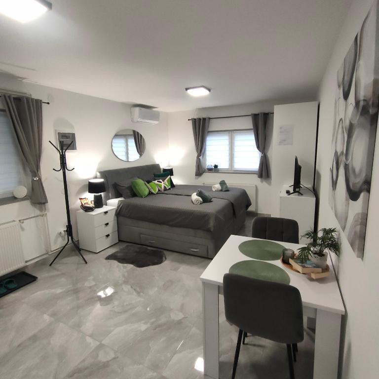 The house consists of two studio apartments. Each studio apartment has 1 bedroom with a fully equipped kitchen, 1 bathroom, linen, towels, soaps, shower gels, shampoos, flat screen TV, shared terrace for pleasant enjoyment of coffee with a large garden. The apartment is located in a quiet street approximately 500 m from the city center and is tucked into the plot. A courtyard and a large garden separate the apartment from the road, which allows for a quiet stay in the apartment and on the terrace. There is a parking lot for private cars in the courtyard.