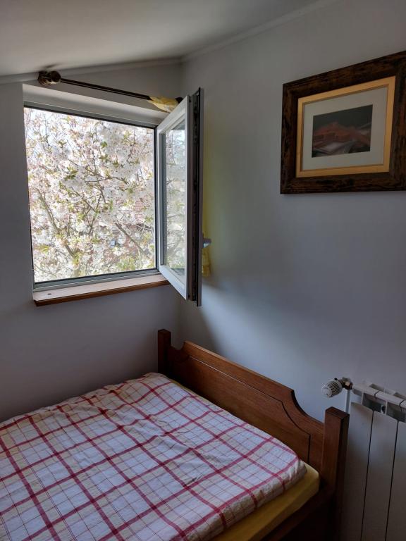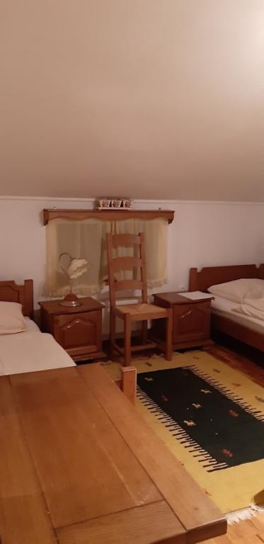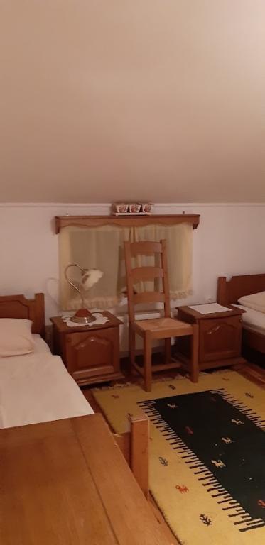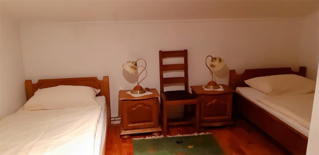 Family house with rooms for rent on the slopes of Bilogora. In the attic there are three rooms with bathrooms, a large common living room and an outdoor terrace. Around the house there is a large yard with a covered terrace next to which there is a grill, which can be used. In the orchard we also have a gazebo from which you can observe fallow deer.
