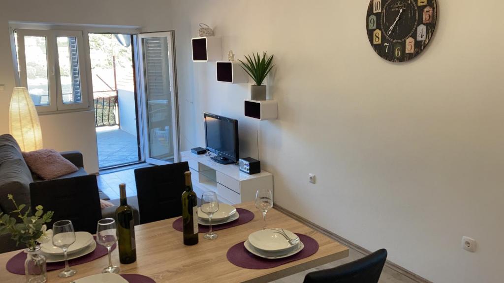 Seven of us (4 adults, three children, one of whom is 2 years old, so the owner prepared a travel cot upon request) and a dog stayed in the apartment from June 27 to July 7. When we entered, it looked even more spacious than the pictures suggested. Extremely well cleaned and tidy. All appliances were functional (we were even surprised by the existence of both washing machines - for laundry and dishes), a brand new oven. There is nothing in the apartment: even two irons, an ironing board, a mixer and a stick with a chopper, an electric grill located in the fireplace on the balcony, which is actually more practical for summer, brooms, a mop, a basin, a vacuum cleaner, all possible means of washing (and enough detergents for washing dishes and hand gel), even oil; usually olive oil, sugar, salt, pepper and even foil; aluminum and transparent and parchment paper. The space welcomed us chilled, and the air conditioning is otherwise very good and cools the space very quickly. Beštek, piati and teče were impeccably clean, and their number is not negligible. I would especially like to praise the quality of the cooking utensils. The beds in the rooms were very comfortable to sleep on, and the couch where the children slept was furnished with a mattress topper so that they were also very comfortable. The landlady surprised us with a cake for the birthday of our youngest member and wine for the birthday of the oldest member of our team! We were really taken aback by such an act of hospitality! I would definitely recommend this accommodation to people who wished for more peaceful Dalmatian towns and who are willing to take the time to explore the island by car, because Brna is located right in the middle and it is very easy to reach the beautiful bays on the far south-west but also on the far north-east tip of the island .