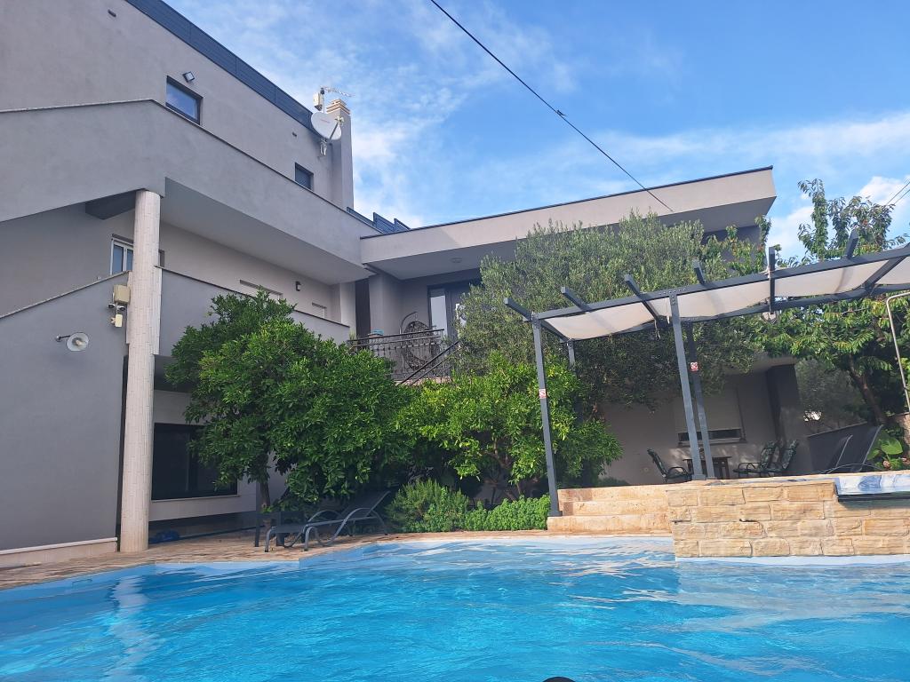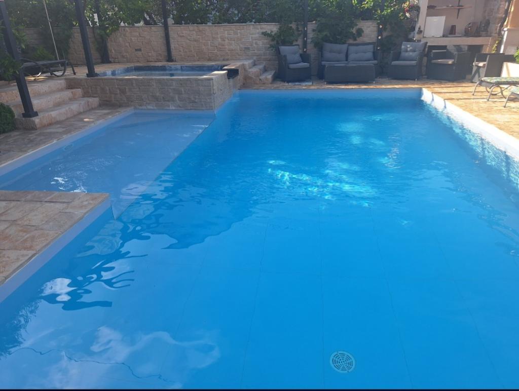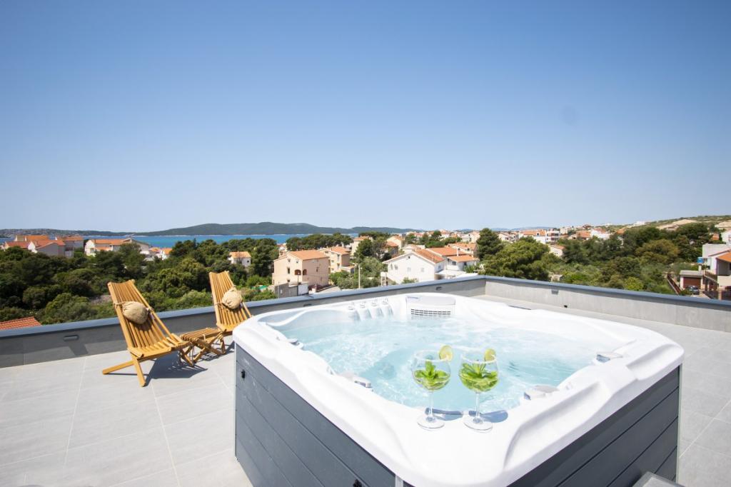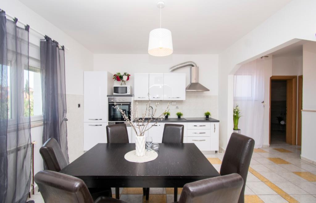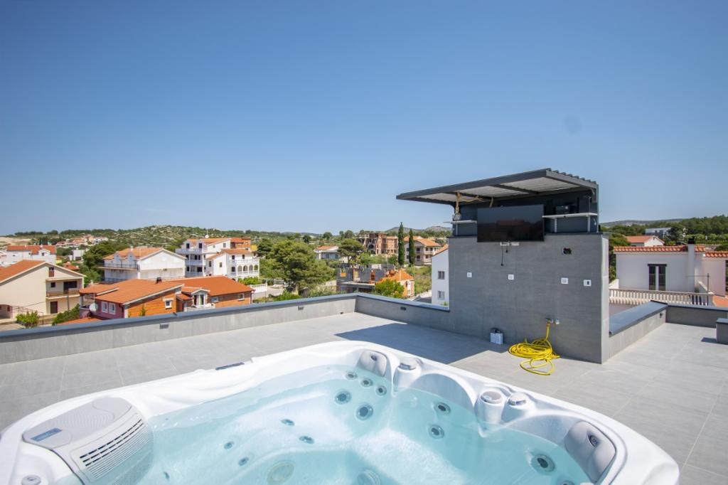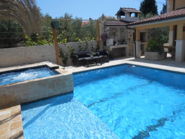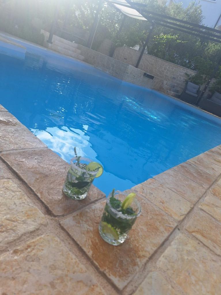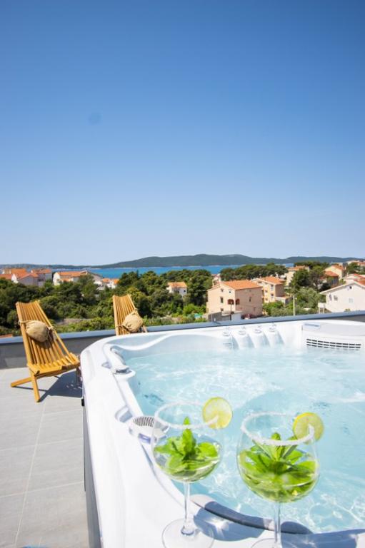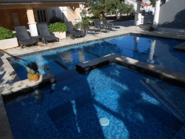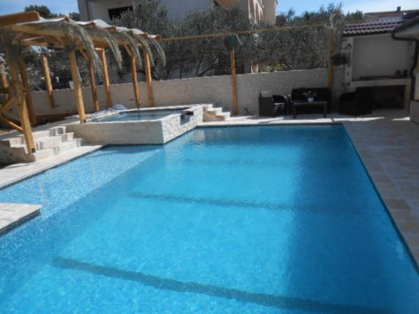 The house for 10 people with a swimming pool and jacuzzi is located in a quiet area of Brodarica, surrounded by plenty of greenery and flowers. The first two apartments are on the ground floor, one is 45 m2, and the other is 50 m2. Each apartment has a double bedroom, a kitchen, a sofa bed, a bathroom and a terrace with a table and chairs. The third apartment is 90 m2, located on the first floor, has two large double bedrooms, a large living room, kitchen, bathroom and a 45 m2 terrace with a table and chairs. It is suitable for a slightly larger family and friends. The apartment is air-conditioned. The fourth apartment is luxuriously arranged, about 100m2, has a large living room, a fully equipped kitchen, a large room with television and air conditioning, the apartment also has a sauna. there is a jacuzzi with a large terrace on the roof. each apartment has air conditioning and each room also has a television. The pool is shared. The house is 5-6 minutes' walk from the sea. Next to the house there are two more apartments, one is 110m2 luxuriously furnished, and the other is 55m2.