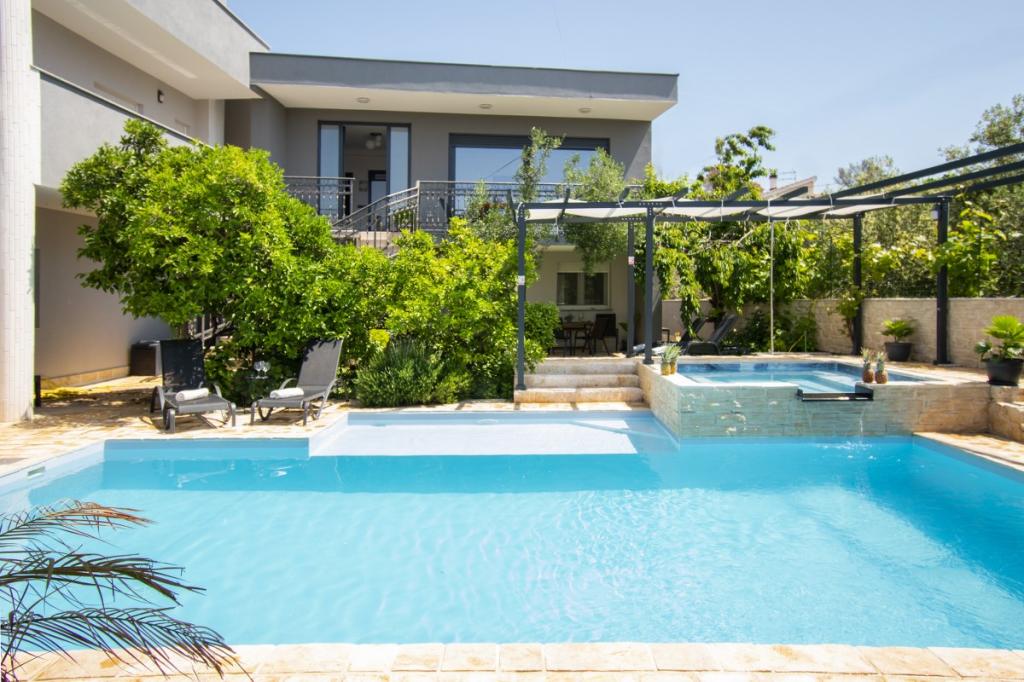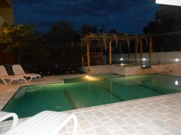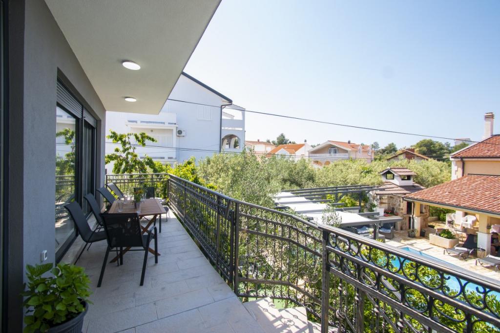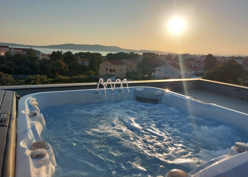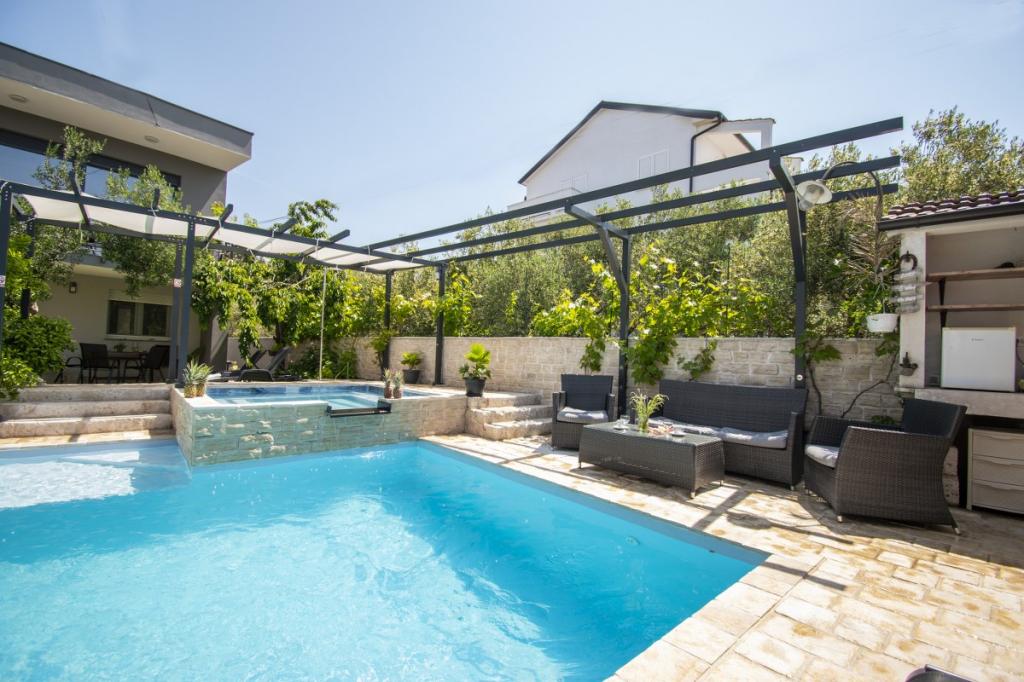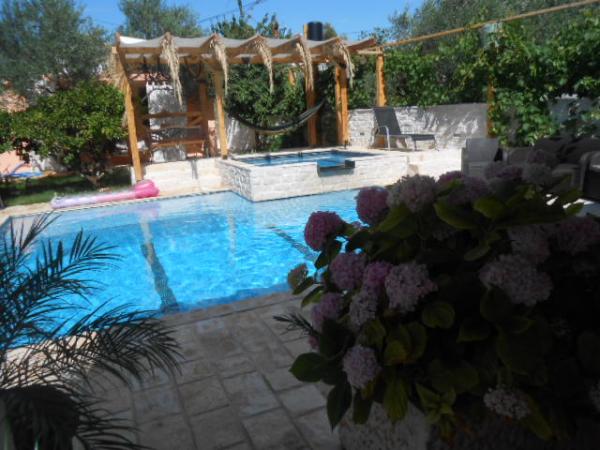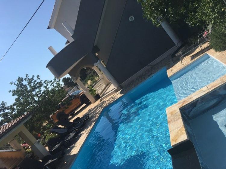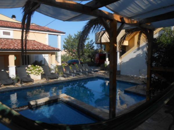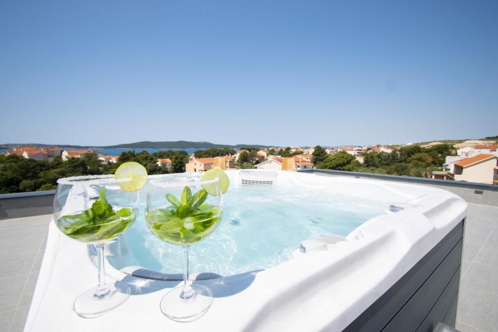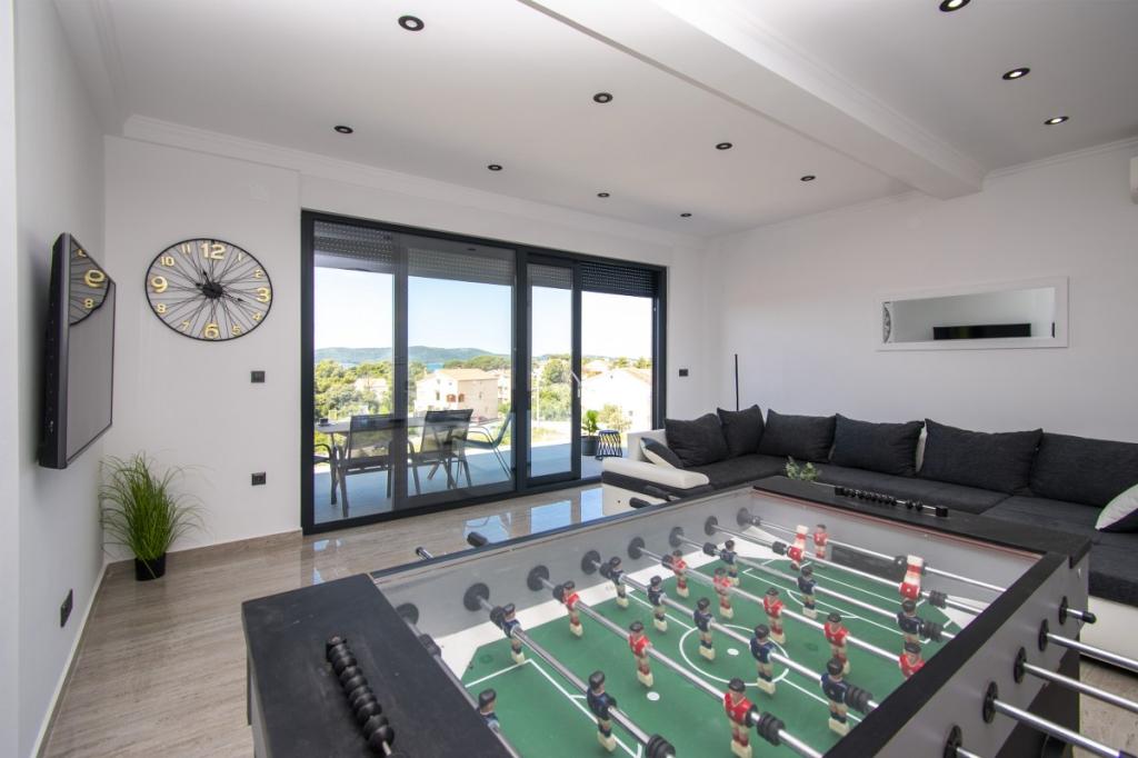 The house for 10 people with a swimming pool and jacuzzi is located in a quiet area of Brodarica, surrounded by plenty of greenery and flowers. The first two apartments are on the ground floor, one is 45 m2, and the other is 50 m2. Each apartment has a double bedroom, a kitchen, a sofa bed, a bathroom and a terrace with a table and chairs. The third apartment is 90 m2, located on the first floor, has two large double bedrooms, a large living room, kitchen, bathroom and a 45 m2 terrace with a table and chairs. It is suitable for a slightly larger family and friends. The apartment is air-conditioned. The fourth apartment is luxuriously arranged, about 100m2, has a large living room, a fully equipped kitchen, a large room with television and air conditioning, the apartment also has a sauna. there is a jacuzzi with a large terrace on the roof. each apartment has air conditioning and each room also has a television. The pool is shared. The house is 5-6 minutes' walk from the sea. Next to the house there are two more apartments, one is 110m2 luxuriously furnished, and the other is 55m2.