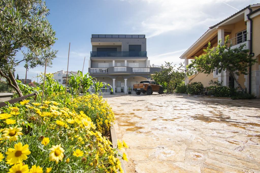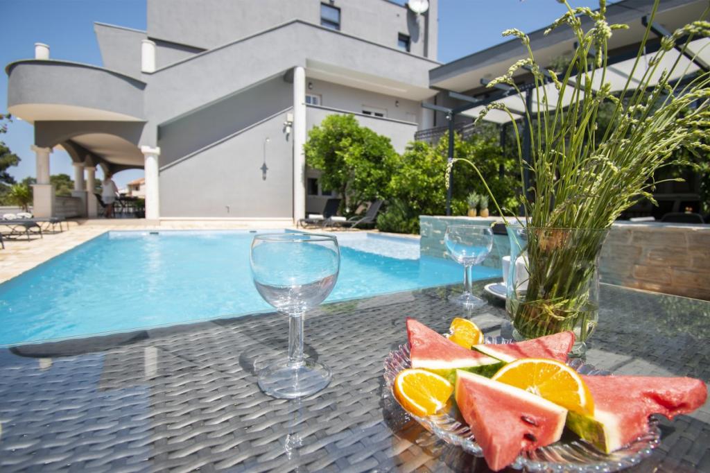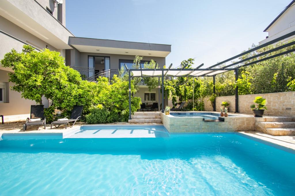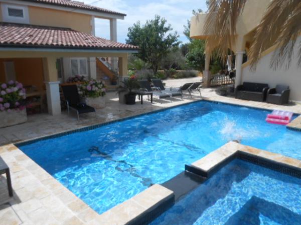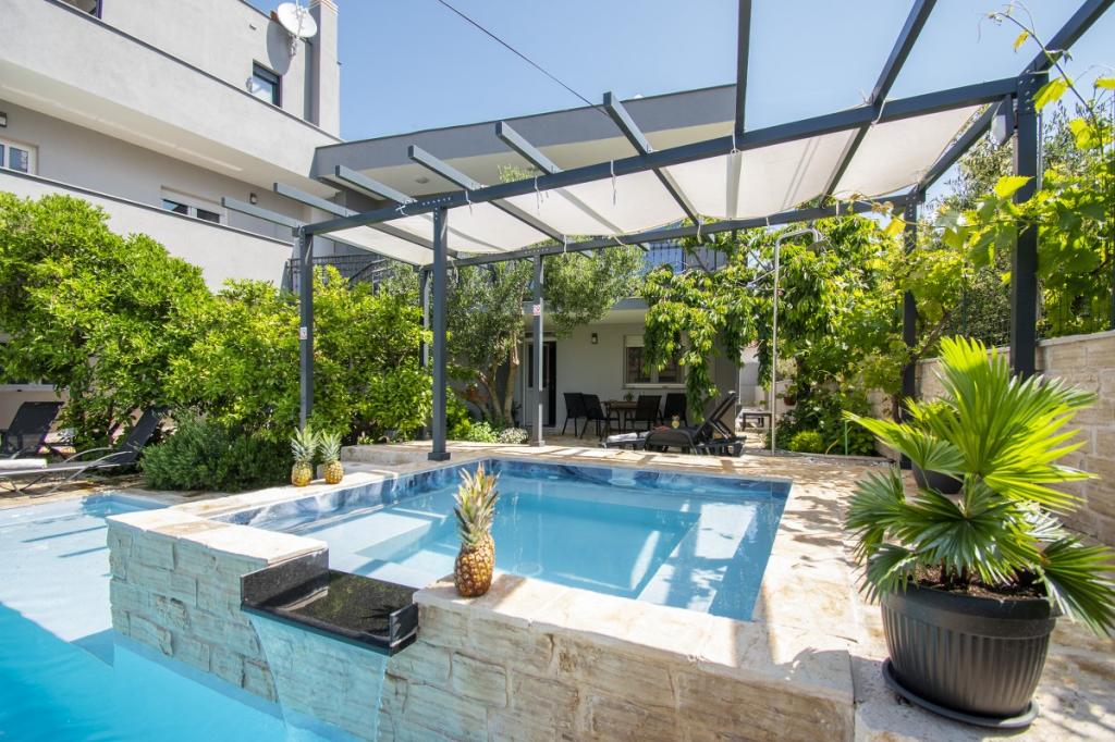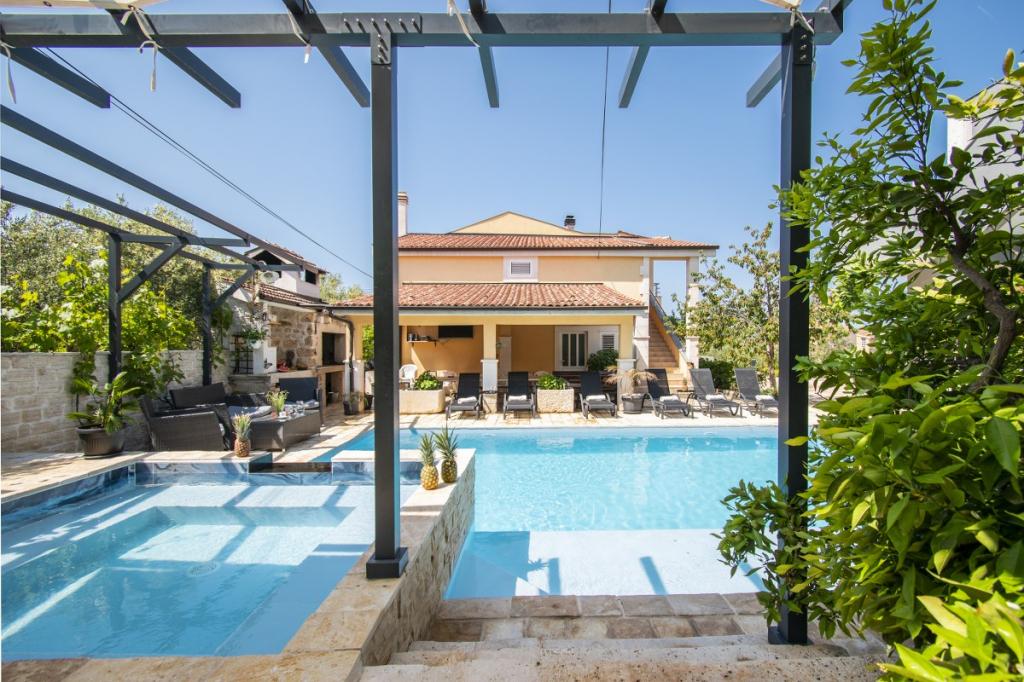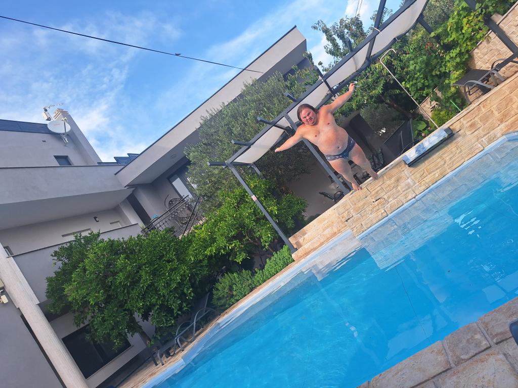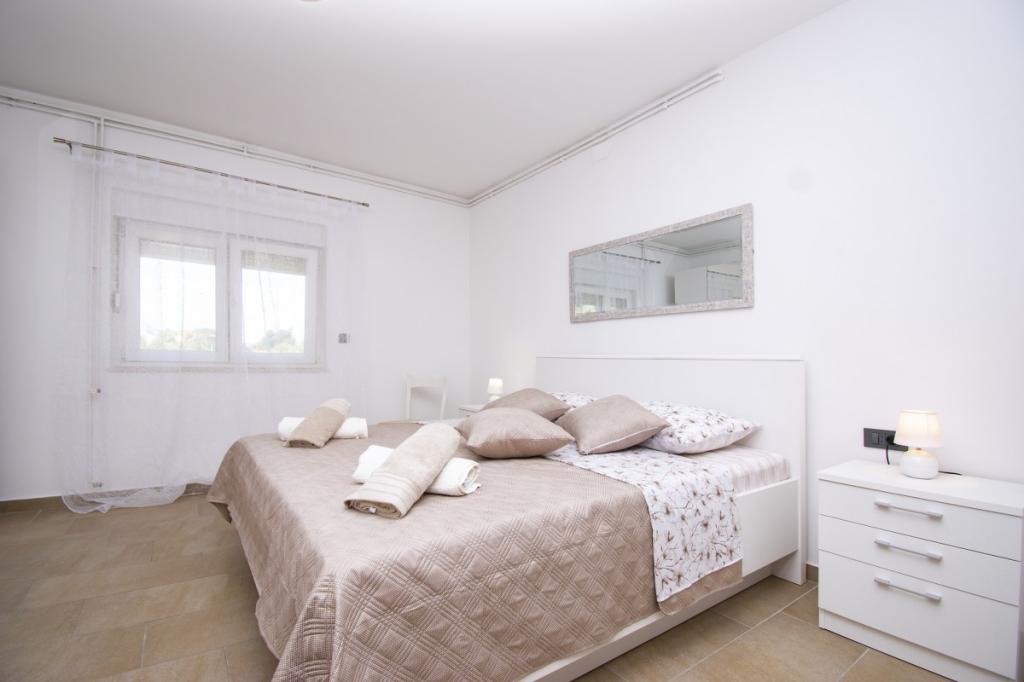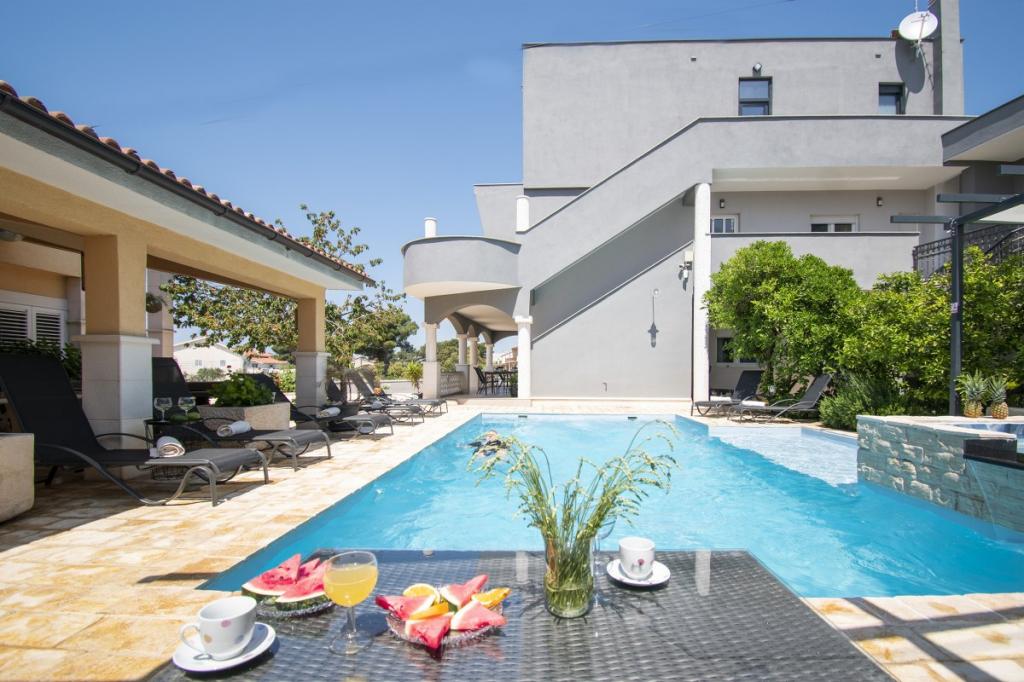 The house for 10 people with a swimming pool and jacuzzi is located in a quiet area of Brodarica, surrounded by plenty of greenery and flowers. The first two apartments are on the ground floor, one is 45 m2, and the other is 50 m2. Each apartment has a double bedroom, a kitchen, a sofa bed, a bathroom and a terrace with a table and chairs. The third apartment is 90 m2, located on the first floor, has two large double bedrooms, a large living room, kitchen, bathroom and a 45 m2 terrace with a table and chairs. It is suitable for a slightly larger family and friends. The apartment is air-conditioned. The fourth apartment is luxuriously arranged, about 100m2, has a large living room, a fully equipped kitchen, a large room with television and air conditioning, the apartment also has a sauna. there is a jacuzzi with a large terrace on the roof. each apartment has air conditioning and each room also has a television. The pool is shared. The house is 5-6 minutes' walk from the sea. Next to the house there are two more apartments, one is 110m2 luxuriously furnished, and the other is 55m2.