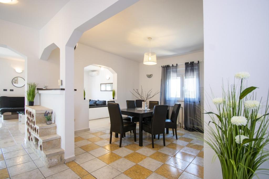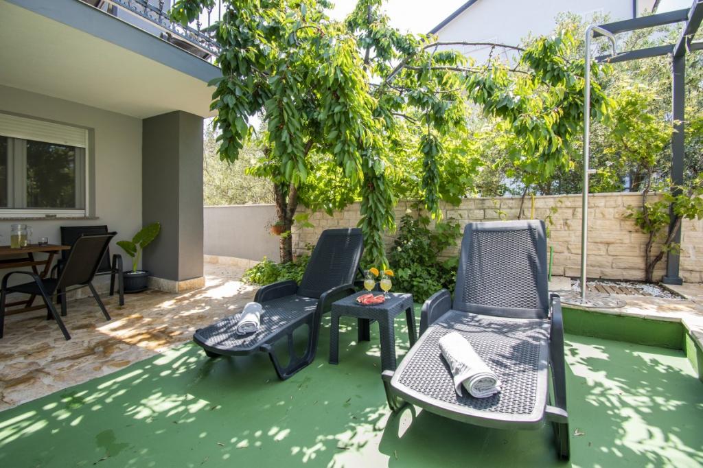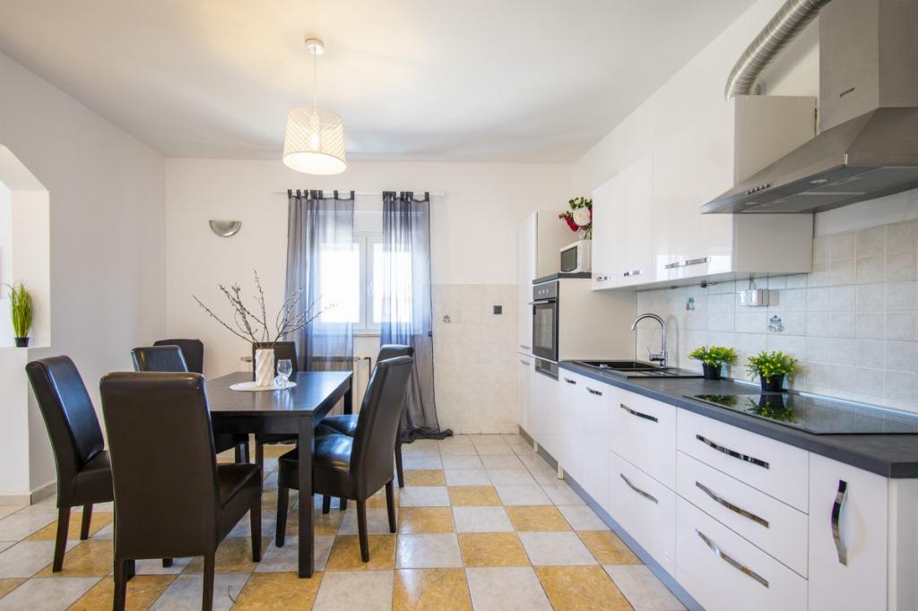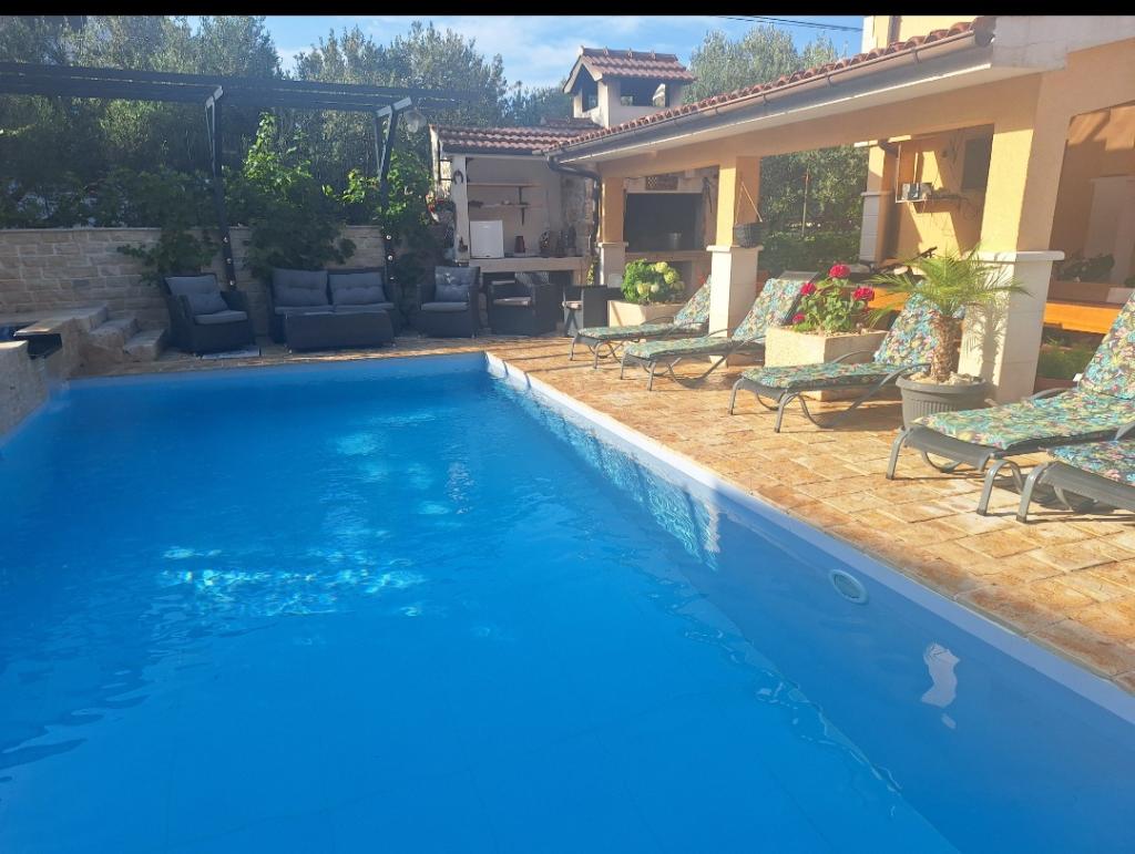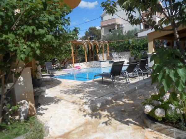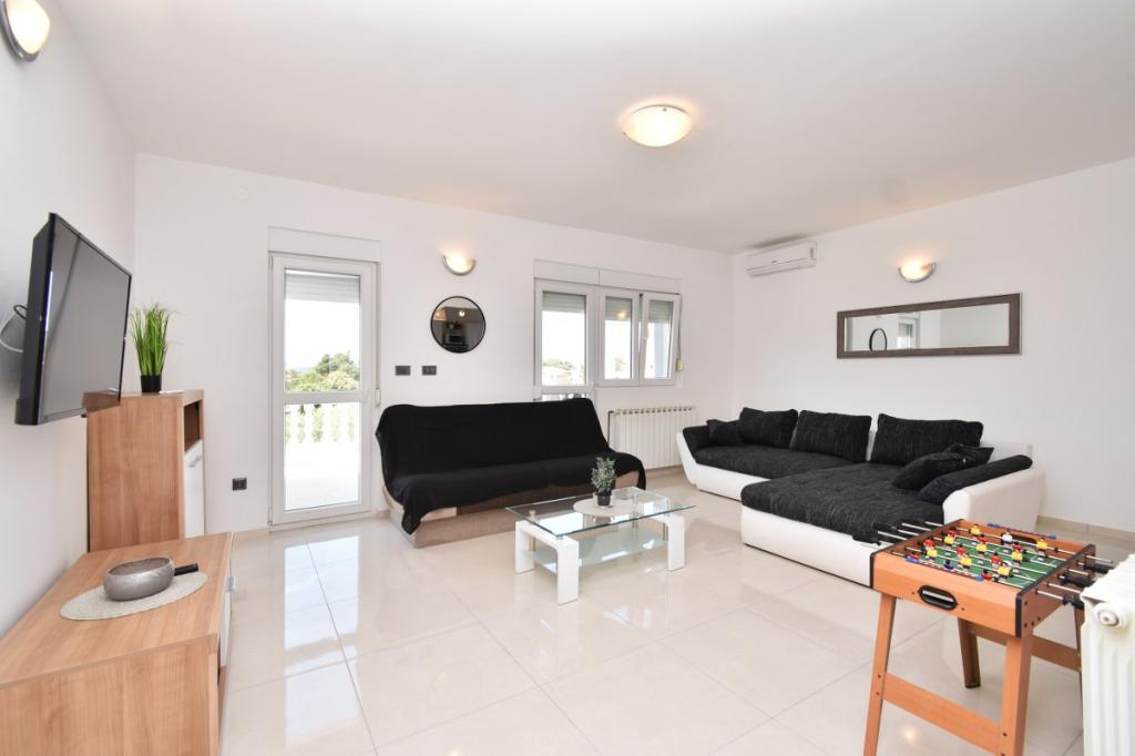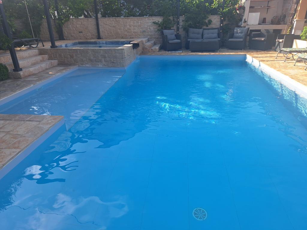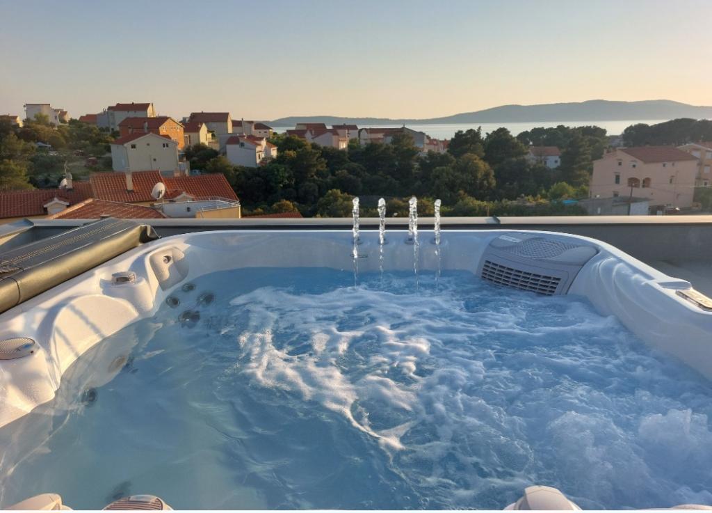 The house for 10 people with a swimming pool and jacuzzi is located in a quiet area of Brodarica, surrounded by plenty of greenery and flowers. The first two apartments are on the ground floor, one is 45 m2, and the other is 50 m2. Each apartment has a double bedroom, a kitchen, a sofa bed, a bathroom and a terrace with a table and chairs. The third apartment is 90 m2, located on the first floor, has two large double bedrooms, a large living room, kitchen, bathroom and a 45 m2 terrace with a table and chairs. It is suitable for a slightly larger family and friends. The apartment is air-conditioned. The fourth apartment is luxuriously arranged, about 100m2, has a large living room, a fully equipped kitchen, a large room with television and air conditioning, the apartment also has a sauna. there is a jacuzzi with a large terrace on the roof. each apartment has air conditioning and each room also has a television. The pool is shared. The house is 5-6 minutes' walk from the sea. Next to the house there are two more apartments, one is 110m2 luxuriously furnished, and the other is 55m2.