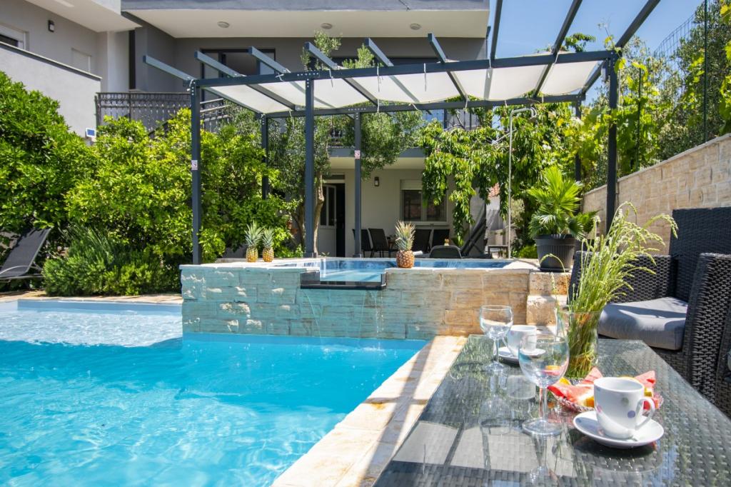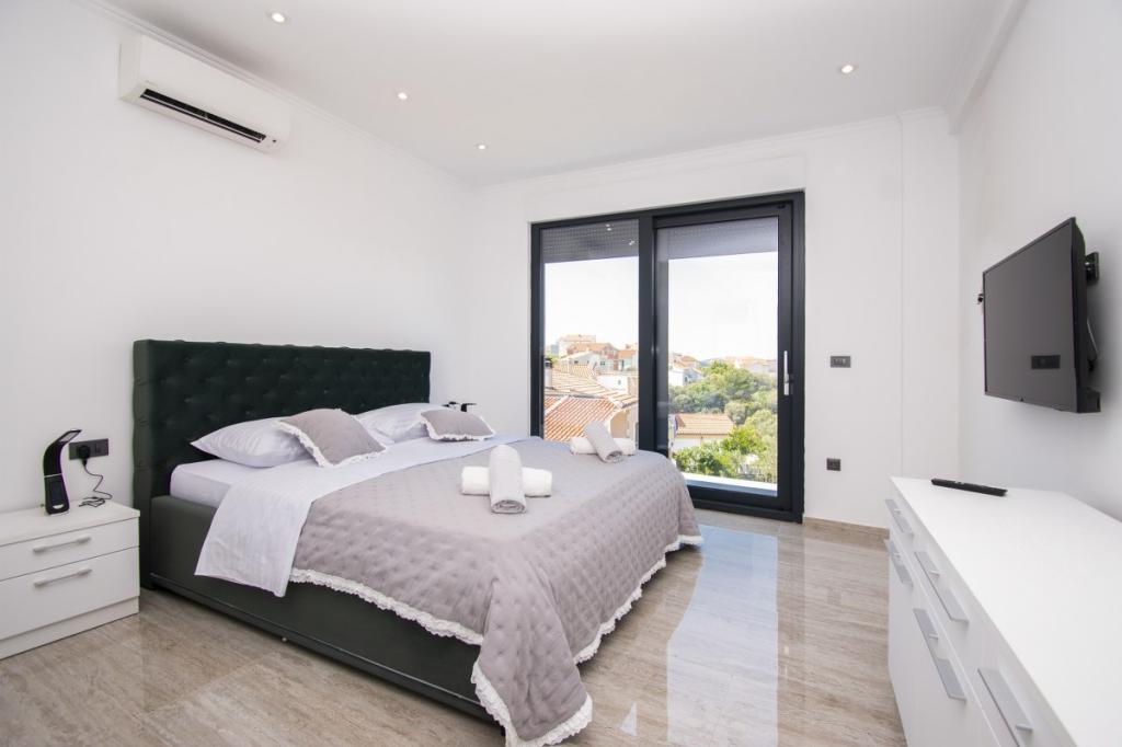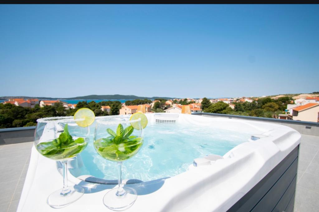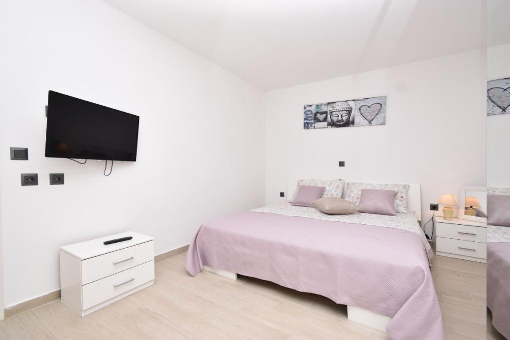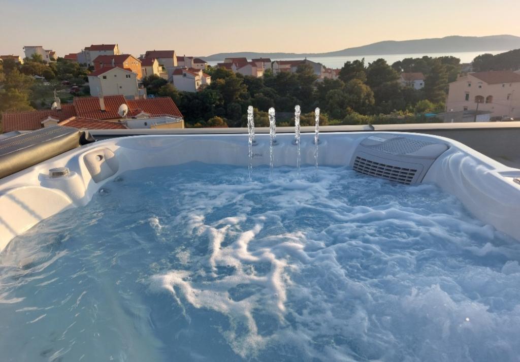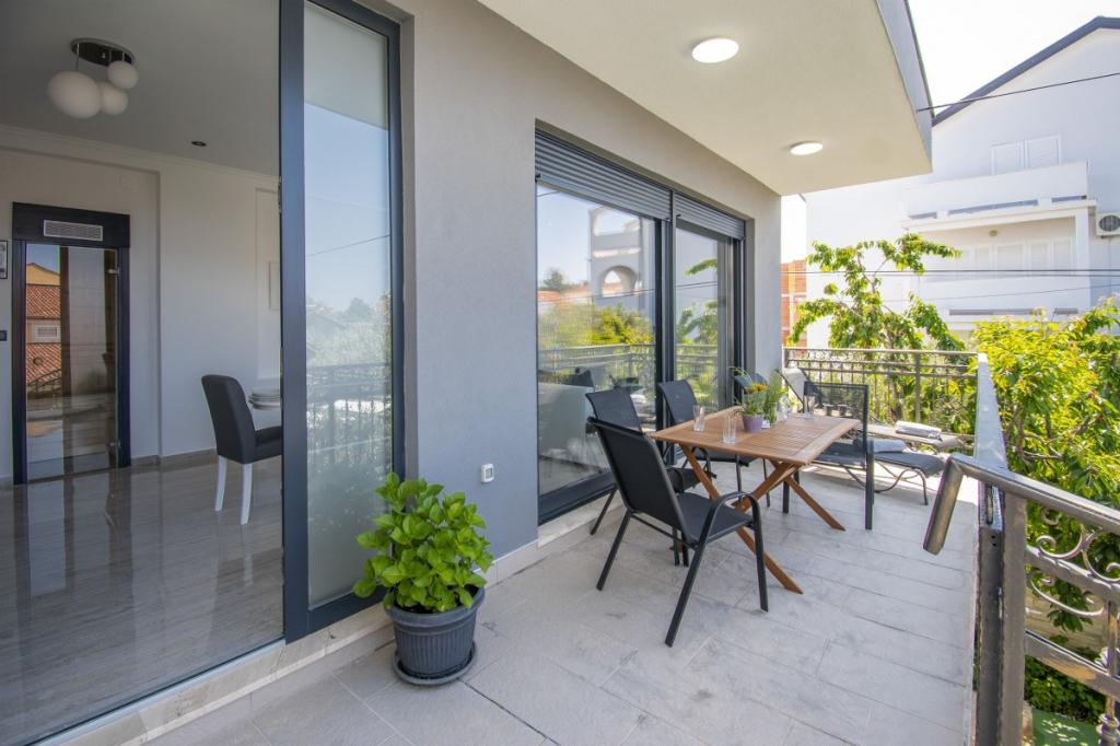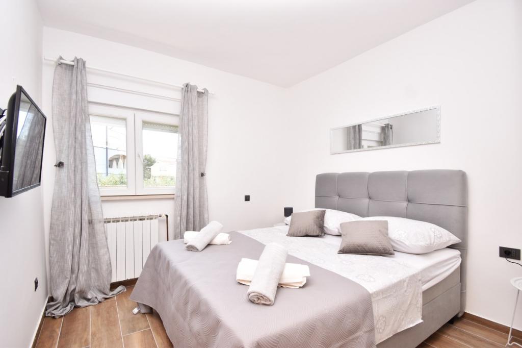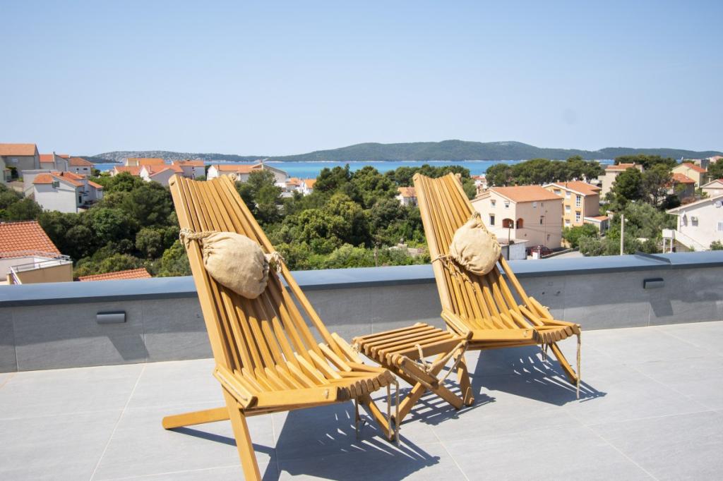 The house for 10 people with a swimming pool and jacuzzi is located in a quiet area of Brodarica, surrounded by plenty of greenery and flowers. The first two apartments are on the ground floor, one is 45 m2, and the other is 50 m2. Each apartment has a double bedroom, a kitchen, a sofa bed, a bathroom and a terrace with a table and chairs. The third apartment is 90 m2, located on the first floor, has two large double bedrooms, a large living room, kitchen, bathroom and a 45 m2 terrace with a table and chairs. It is suitable for a slightly larger family and friends. The apartment is air-conditioned. The fourth apartment is luxuriously arranged, about 100m2, has a large living room, a fully equipped kitchen, a large room with television and air conditioning, the apartment also has a sauna. there is a jacuzzi with a large terrace on the roof. each apartment has air conditioning and each room also has a television. The pool is shared. The house is 5-6 minutes' walk from the sea. Next to the house there are two more apartments, one is 110m2 luxuriously furnished, and the other is 55m2.