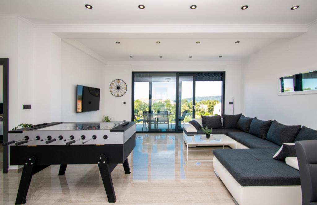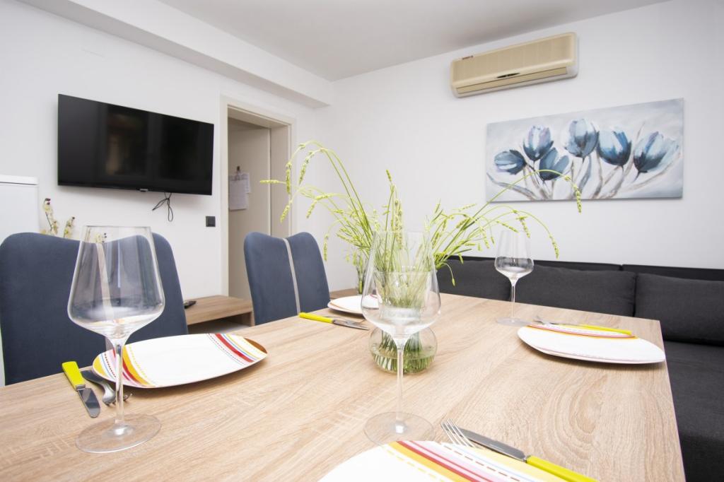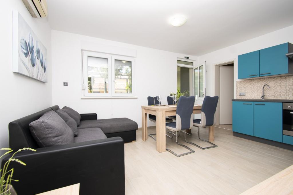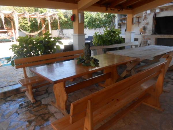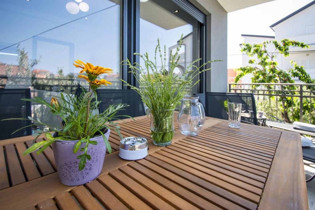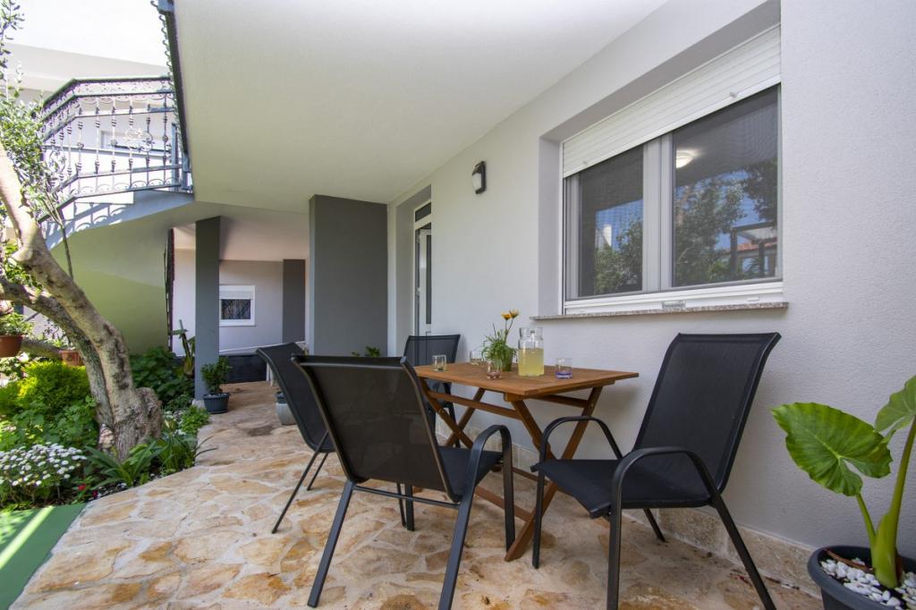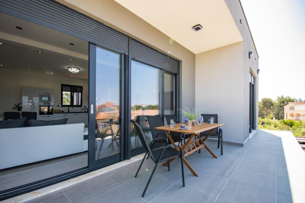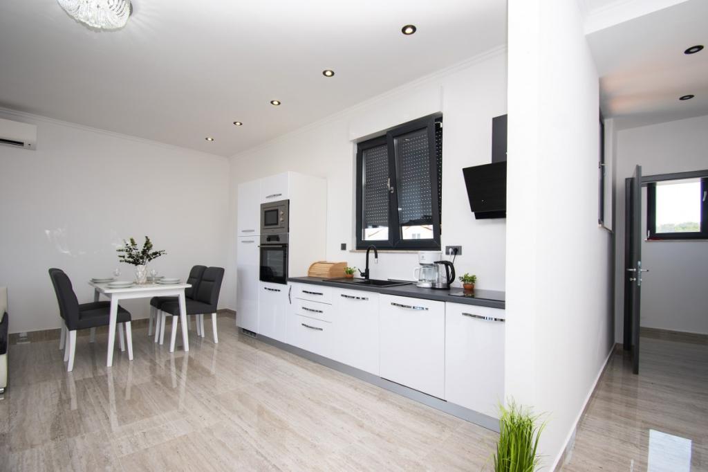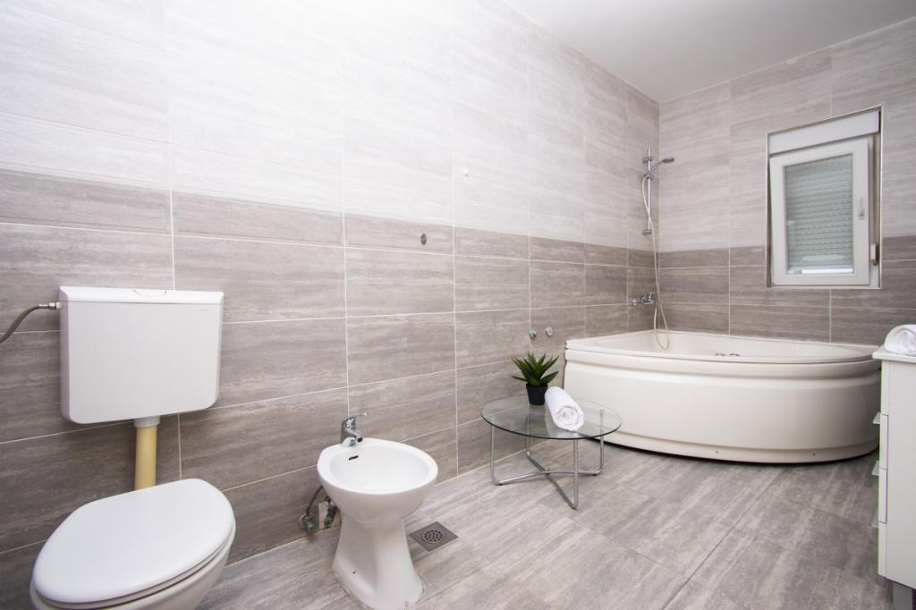 The house for 10 people with a swimming pool and jacuzzi is located in a quiet area of Brodarica, surrounded by plenty of greenery and flowers. The first two apartments are on the ground floor, one is 45 m2, and the other is 50 m2. Each apartment has a double bedroom, a kitchen, a sofa bed, a bathroom and a terrace with a table and chairs. The third apartment is 90 m2, located on the first floor, has two large double bedrooms, a large living room, kitchen, bathroom and a 45 m2 terrace with a table and chairs. It is suitable for a slightly larger family and friends. The apartment is air-conditioned. The fourth apartment is luxuriously arranged, about 100m2, has a large living room, a fully equipped kitchen, a large room with television and air conditioning, the apartment also has a sauna. there is a jacuzzi with a large terrace on the roof. each apartment has air conditioning and each room also has a television. The pool is shared. The house is 5-6 minutes' walk from the sea. Next to the house there are two more apartments, one is 110m2 luxuriously furnished, and the other is 55m2.