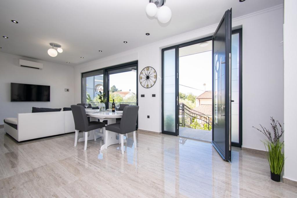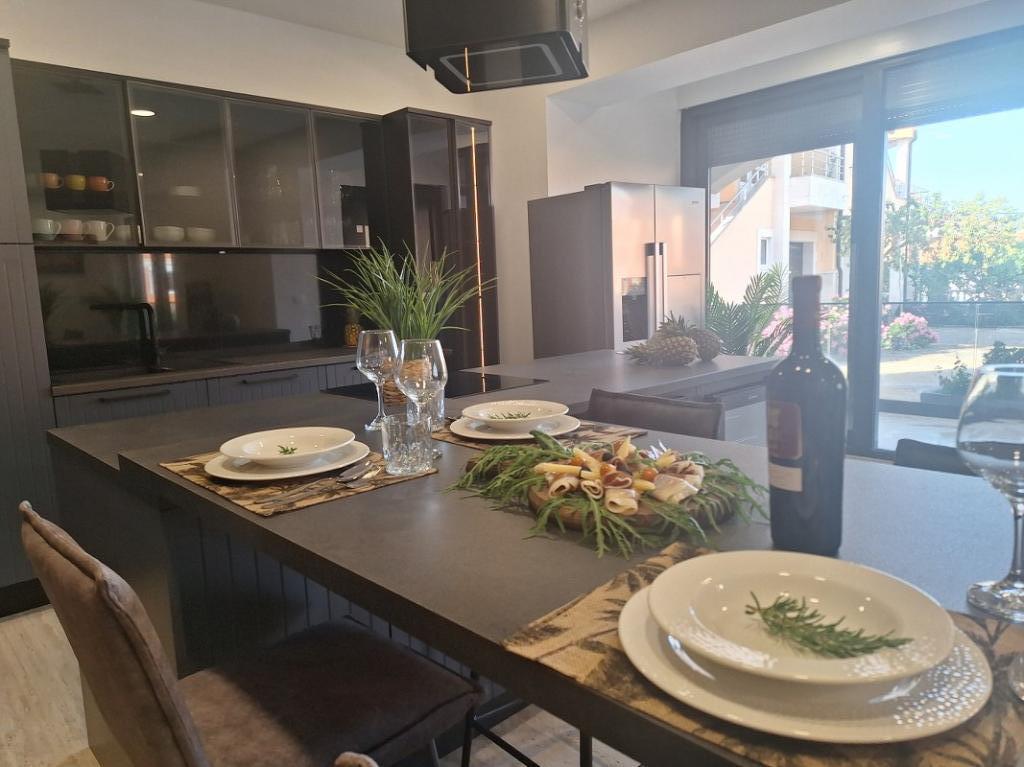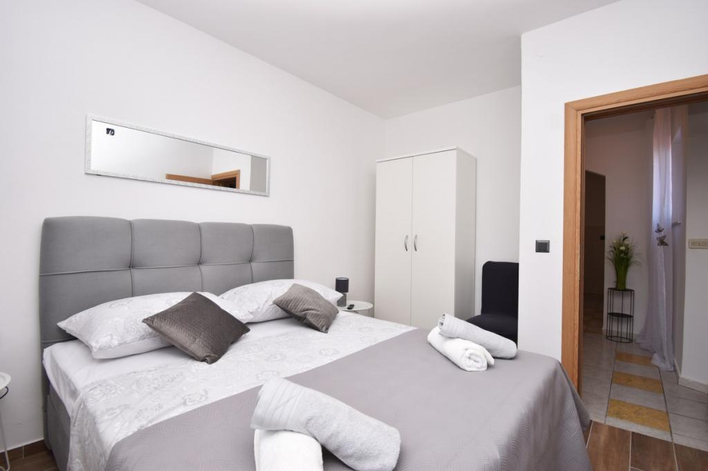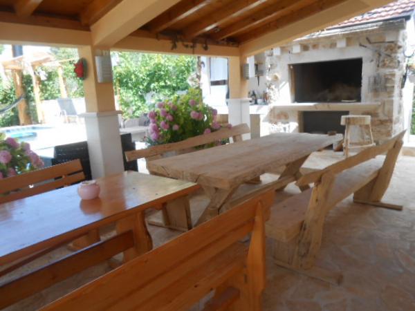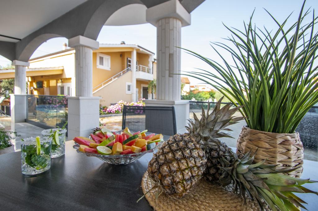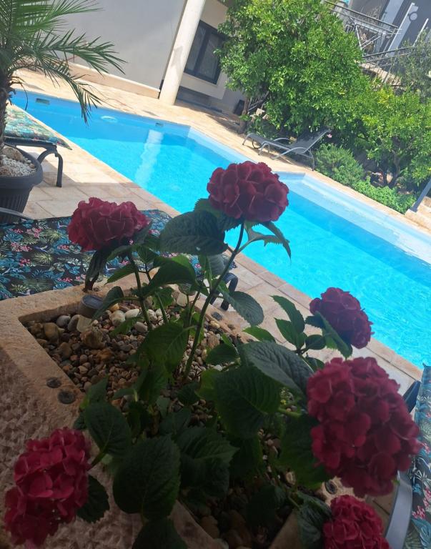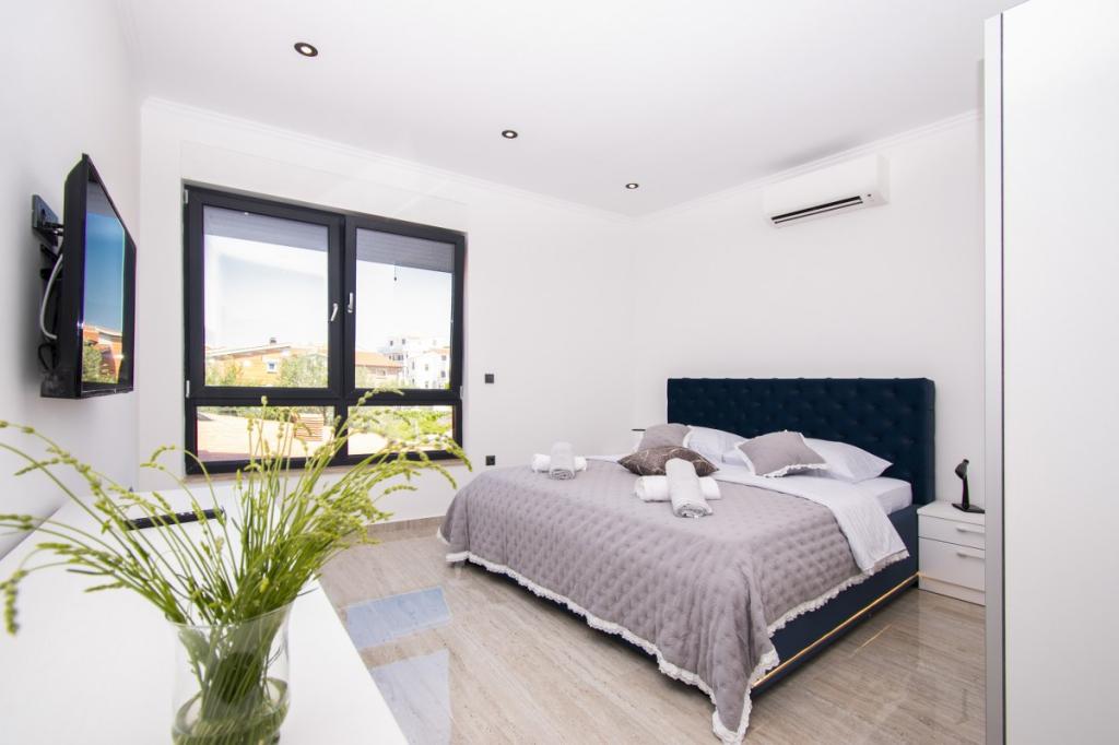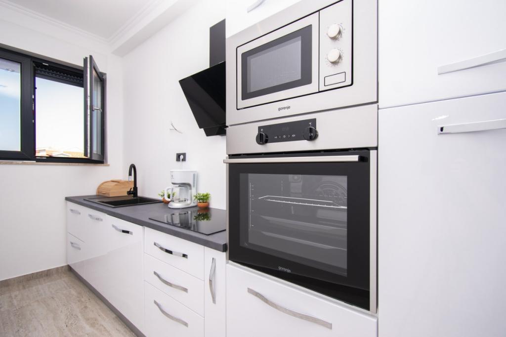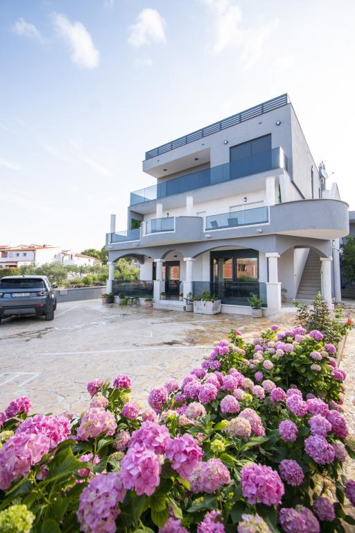 The house for 10 people with a swimming pool and jacuzzi is located in a quiet area of Brodarica, surrounded by plenty of greenery and flowers. The first two apartments are on the ground floor, one is 45 m2, and the other is 50 m2. Each apartment has a double bedroom, a kitchen, a sofa bed, a bathroom and a terrace with a table and chairs. The third apartment is 90 m2, located on the first floor, has two large double bedrooms, a large living room, kitchen, bathroom and a 45 m2 terrace with a table and chairs. It is suitable for a slightly larger family and friends. The apartment is air-conditioned. The fourth apartment is luxuriously arranged, about 100m2, has a large living room, a fully equipped kitchen, a large room with television and air conditioning, the apartment also has a sauna. there is a jacuzzi with a large terrace on the roof. each apartment has air conditioning and each room also has a television. The pool is shared. The house is 5-6 minutes' walk from the sea. Next to the house there are two more apartments, one is 110m2 luxuriously furnished, and the other is 55m2.