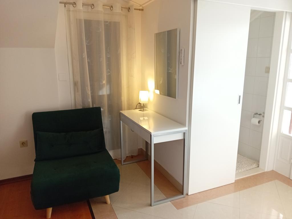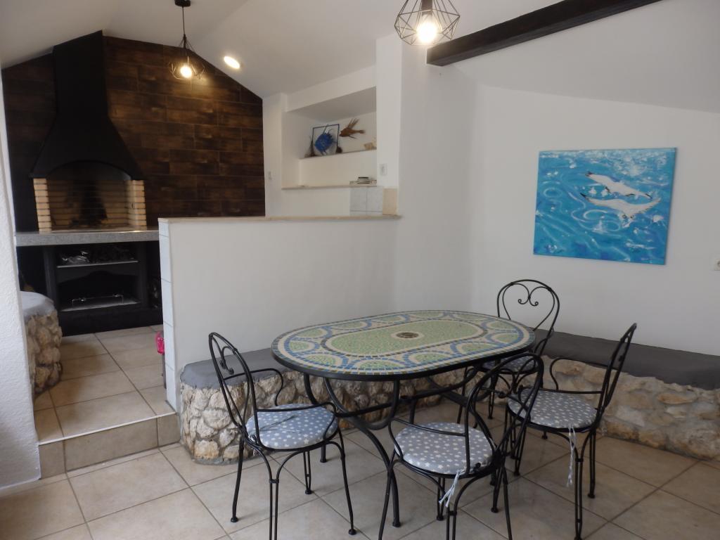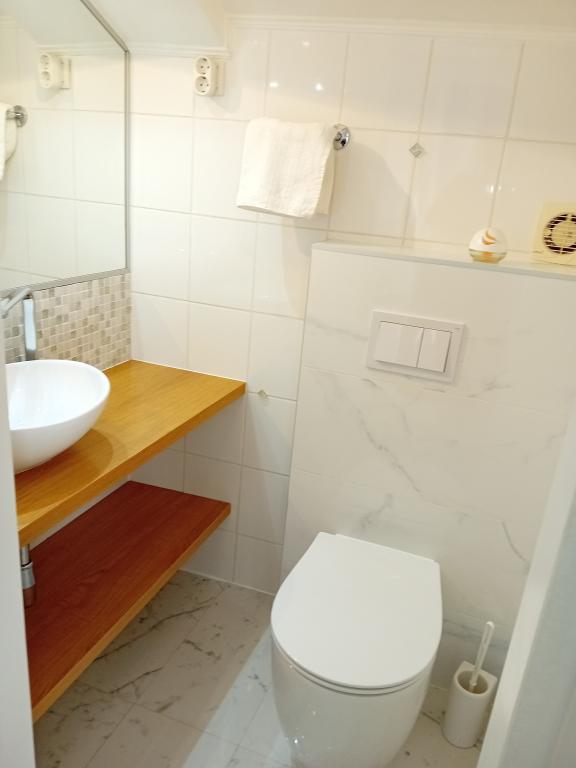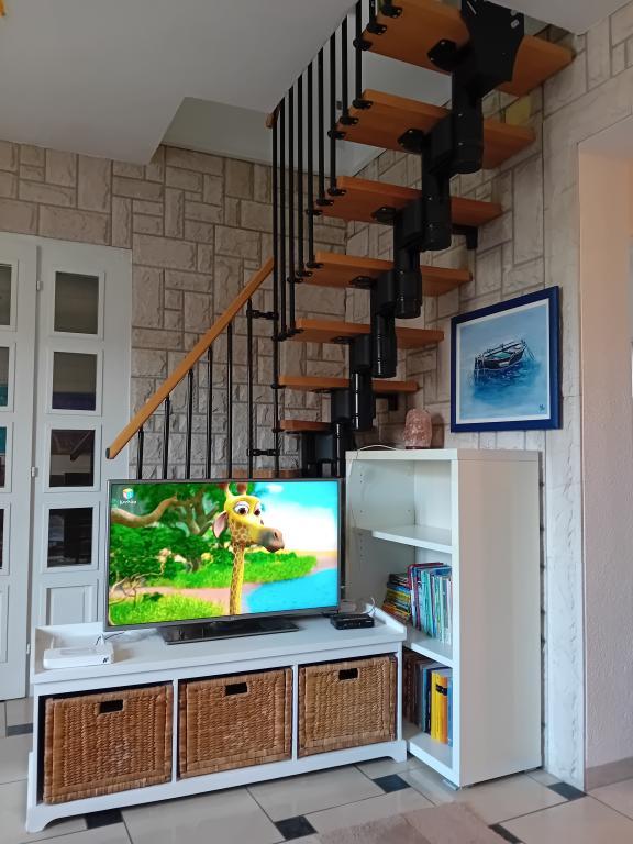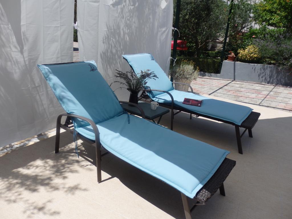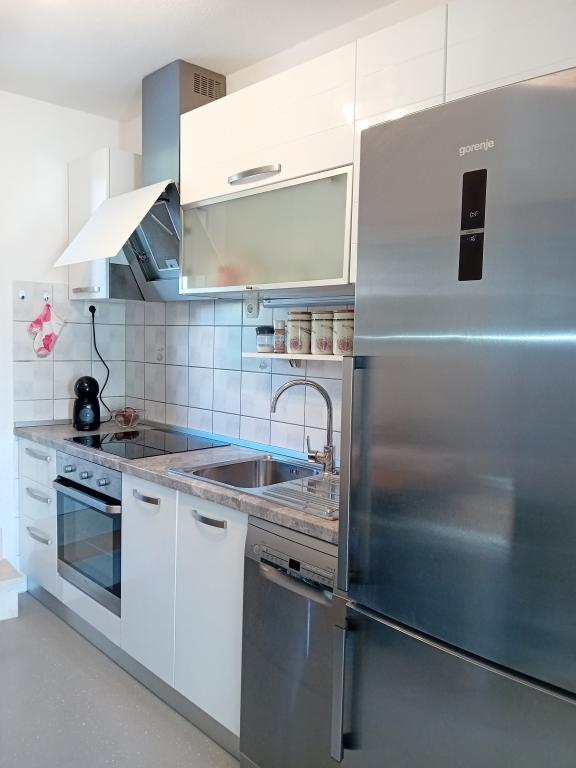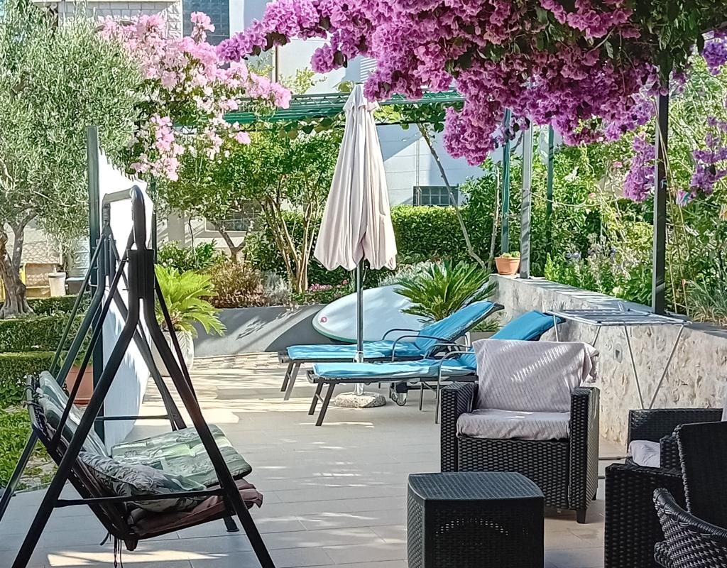 Modernly equipped apartment with sea view, large terrace and garden, close to the beach, 4 stars. The apartment is located in a house (ground floor and first floor). On the ground floor there is; entrance area, kitchen, living room and bathroom. The living room is equipped with a sofa bed for two people. On the first floor there is: bedroom, bathroom (with separate shower and toilet) and a covered balcony of 10 m² with sea view. The bedroom has a comfortable double bed and an armchair that converts into a cot. The kitchen on the ground floor leads to a 45 m2 terrace. The barbecue and dining table are in the covered part (15 m2), and the remaining part is an area for sunbathing and relaxing with a view of the garden.