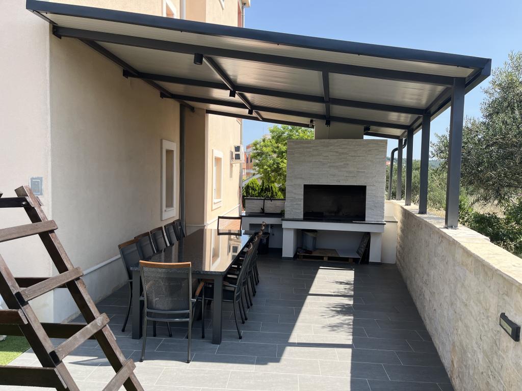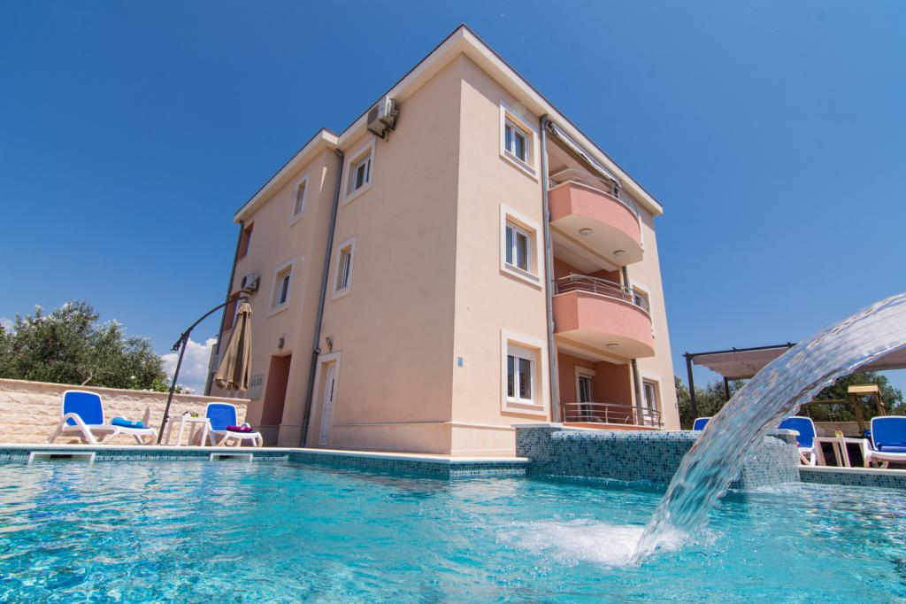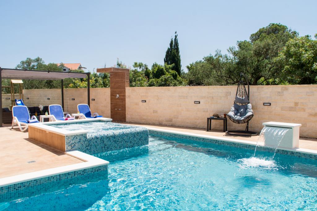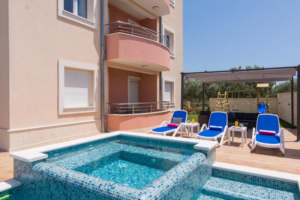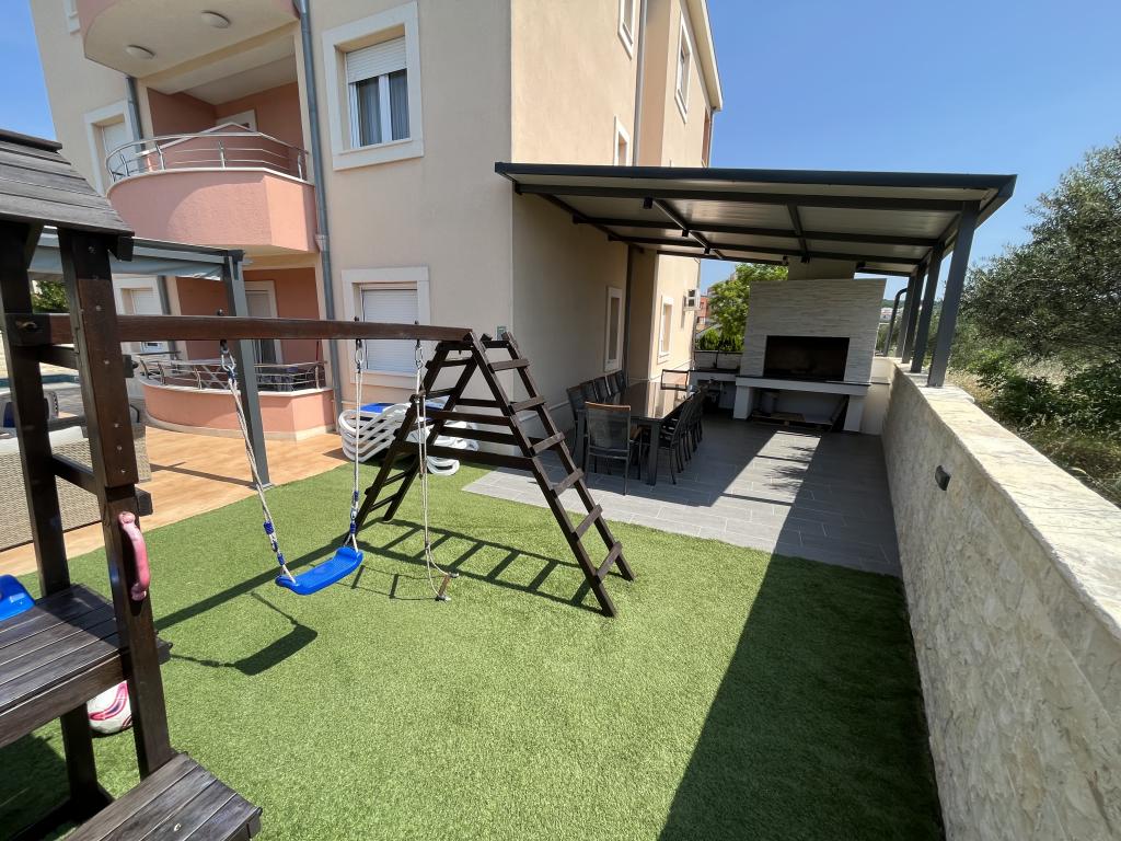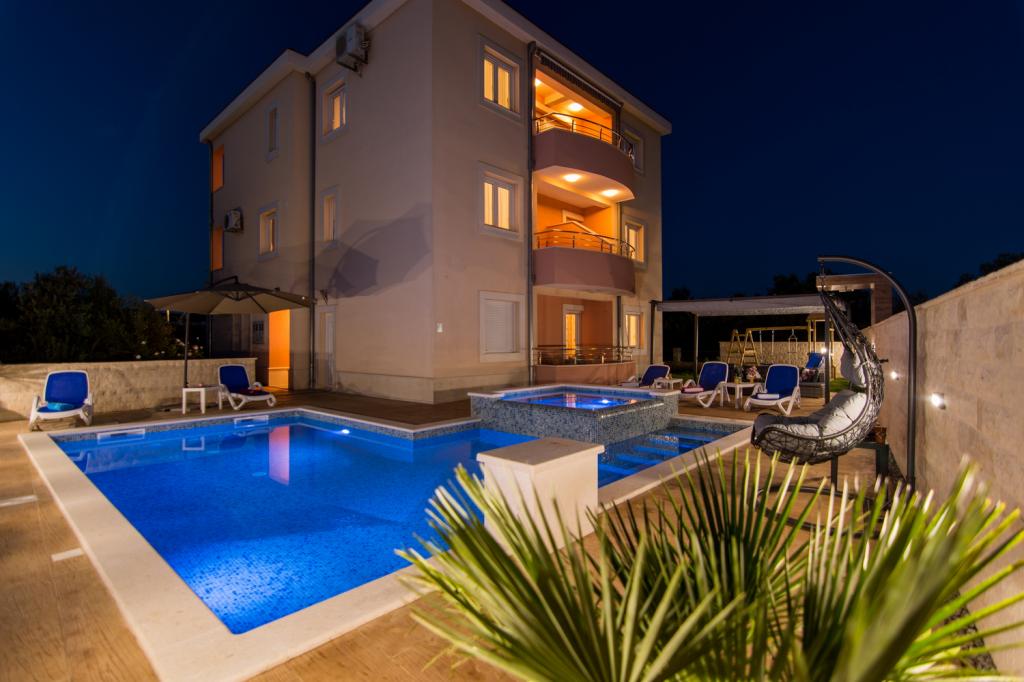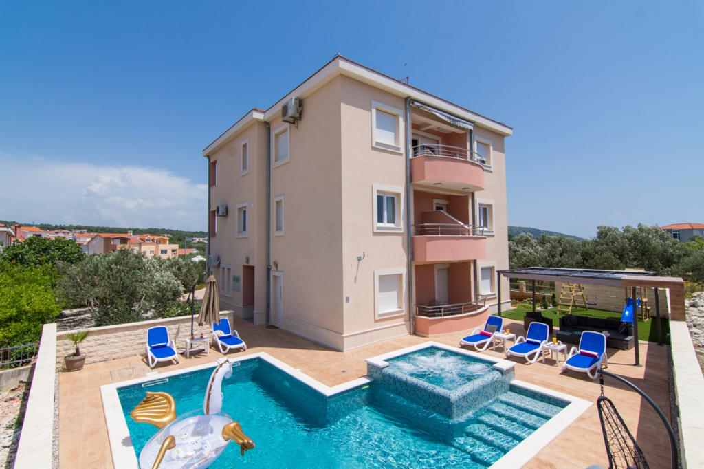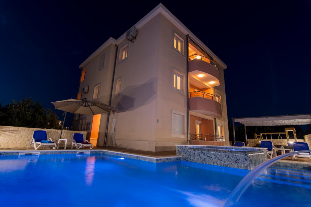 Modernly equipped, air-conditioned, Apartments Villa Peky are located in a family house on the island of Čiovo in Okrug Gornji. Two A2 2 apartments and one 4 2 apartment can host up to 14 people. There is a parking lot for guests in front of the house. At the back of the house there is a heated swimming pool with a jacuzzi, a children's playground and a covered outdoor grill with a large table. The most popular destination in the Trogir region is Okrug Gornji on the island of Čiovo with its beautiful beach. The old village of Okrug is located on the top of a small hill at the bottom of which is a fishing port, about 4 km from the center of Trogir, or 8 km from Split airport. On the beach in Okrug Gornji you can rent a scooter, jet ski, you can enjoy parasailing and other activities at sea. During the summer in Okrug, you can also enjoy the shade of cafes or restaurants that offer Dalmatian specialties in addition to other dishes. The diving school Trogir Diving Center in Mavarčica will introduce you to the beauties of the undersea of central Dalmatia.