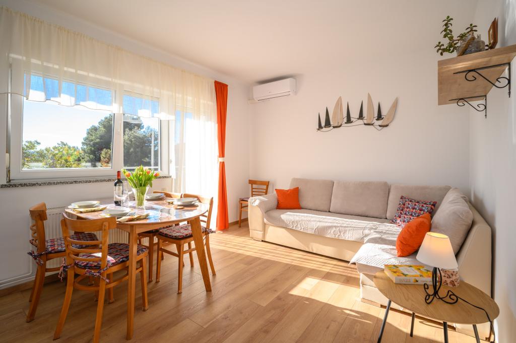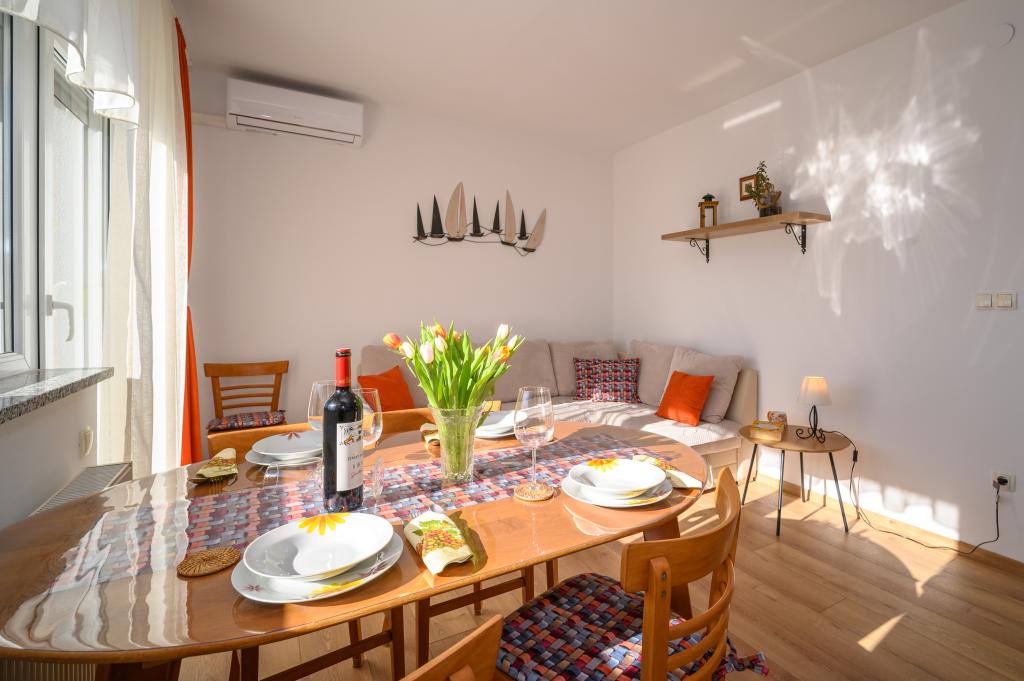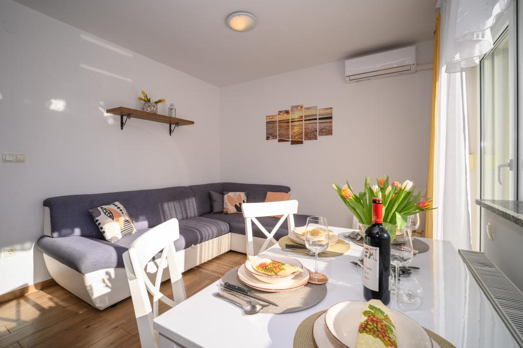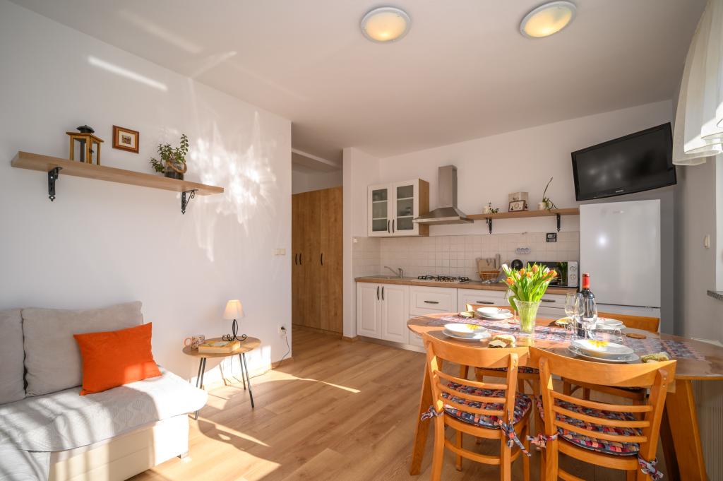 Apartments in a quiet location and only 50 m from the beach and 100 m from other facilities such as a restaurant, shop, children's playground, sports field. Each apartment has its own parking space and guests have access to a grill and a large terrace. The rental price includes wi fi, use of air conditioning and TV/sat. The apartments are new, modern and comfortably equipped and provide an ideal vacation without the need to use a car.