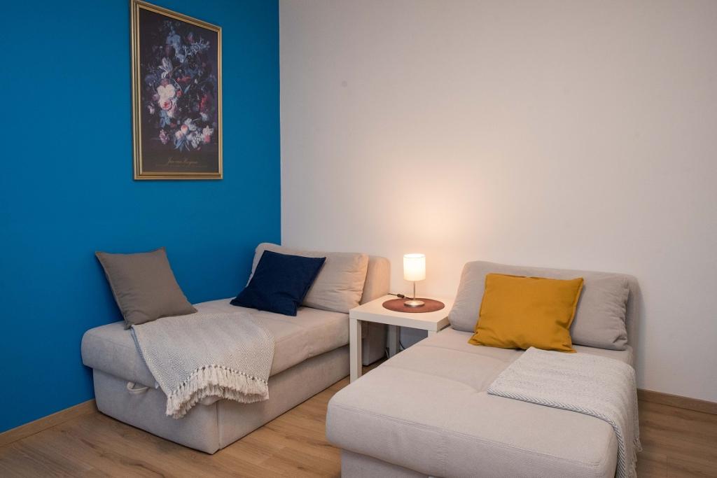 The modernly furnished apartment is located in a family house. A pleasant place to relax or work, consisting of a hallway, bedroom with a double bed, bathroom, dining room-kitchen with sofas with the possibility of placing two beds. The apartments are located approximately 600 m from the city square, park, Special Rehabilitation Hospital, Thermal Water Park, lake, or up to 7 minutes of easy walking. There is a local shop in the neighborhood. The proximity of various additional facilities, restaurants and cafes, pharmacies, and the Health Center, allow for a fulfilling and pleasant stay.