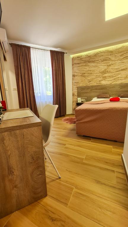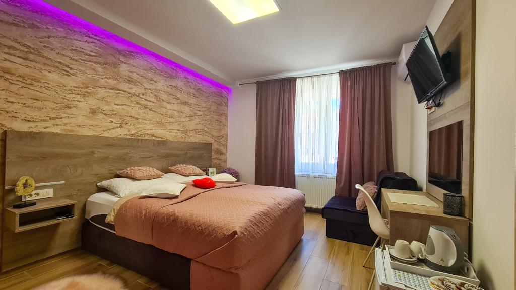 The rooms are equipped with superior hotel beds, with high-class mattresses, each room has an LCD TV, free Wi-Fi, and its own bathroom is decorated according to the most modern standards. Likewise, each room has special LED lighting to create a pleasant atmosphere that will contribute to a special atmosphere during your stay with us. There are parking lots next to the facility that do not need to be reserved separately. In the rooms, you will be greeted with a small sign of attention in the form of instant coffee, chocolate bars, and candies, and if you wish, you can also use our wellness and spa oasis located within the facility.