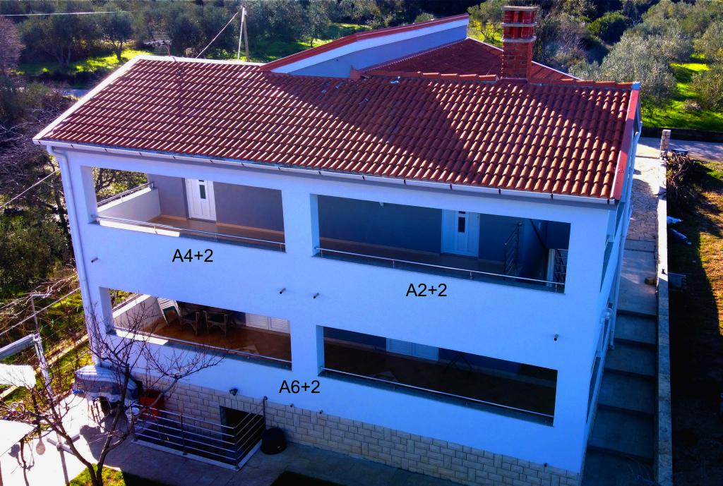 The building has 3 apartments. The largest A6+1 covers the entire ground floor, about 90m2, with a 30m2 terrace. On the first floor there are apartments A4+1 and A2+1, each about 45m2 in size and a shared terrace of 30m2. The terraces have a sea view. The apartments are fully equipped and air-conditioned. The building is 50m from the sea. The building is located in a secluded area. The beach in front of the apartment is concrete, 50% in the shade. There is a parking lot in front of the building. There is also a large barbecue/baking/roast for free use by guests. As well as a large table and benches in front of the barbecue. The town of Dobropoljana is 200m away. The town center is a 5-minute walk away. In the center there are 2 shops, a large, well-maintained sandy beach, a first-class restaurant, and a small boat harbor. There is also space in front of the building for mooring a boat, and in Dobropoljana the boat can be put in or taken out of the sea on a trailer.