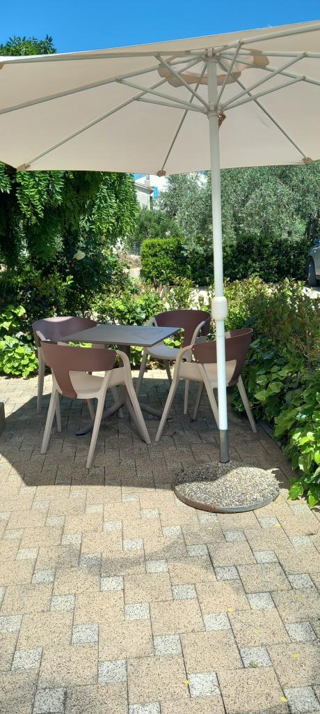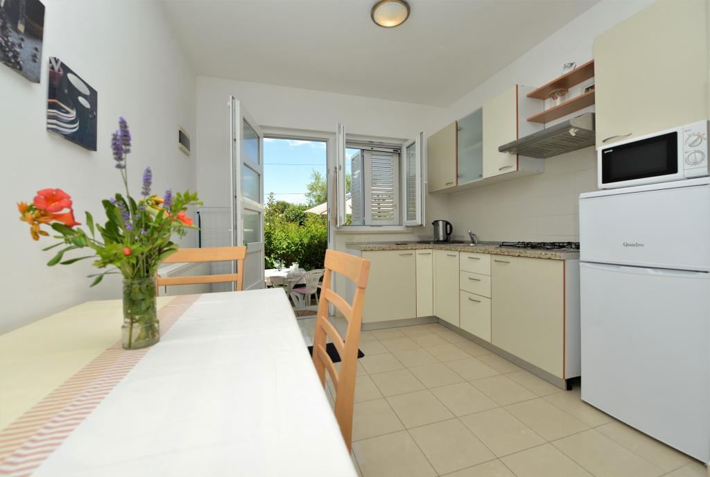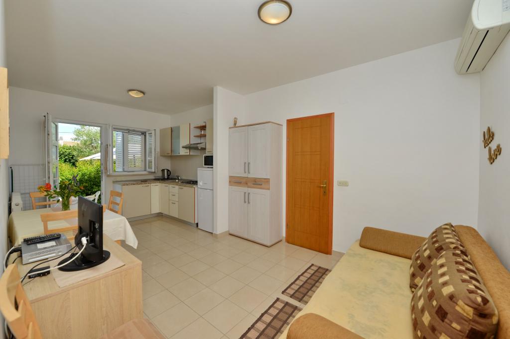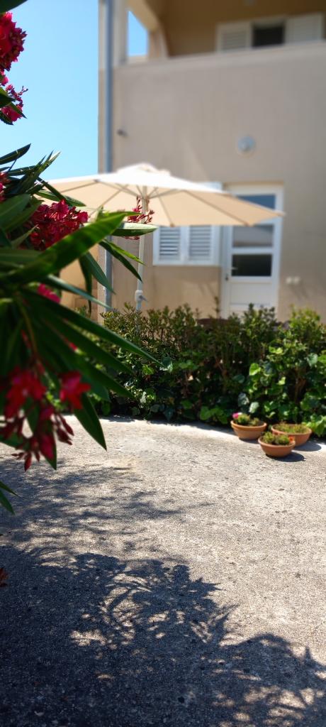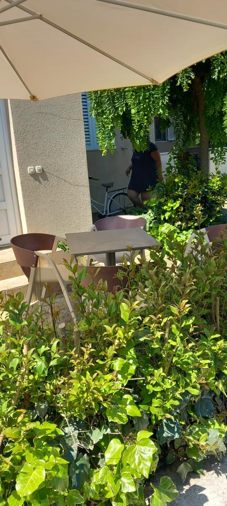 Everything is as in the pictures, the apartment is well equipped, neat and clean, nice terrace as well as the whole yard with lots of greenery and shade. The pool is excellent, well maintained, the children loved it. Wonderful hosts always available and very kind. The beach is a 1-minute walk away, stone. Because of the children, we went to a slightly further beach, which is sandy. All recommendations! We will surely come back again.
