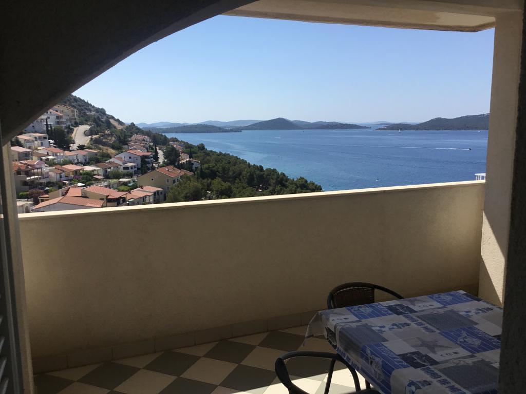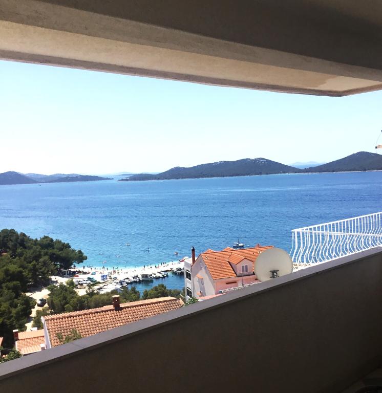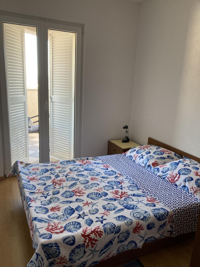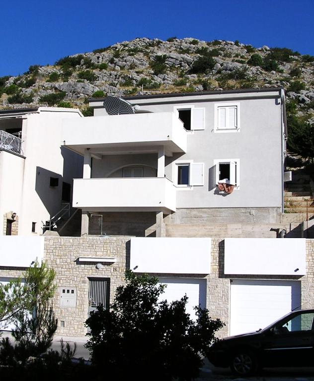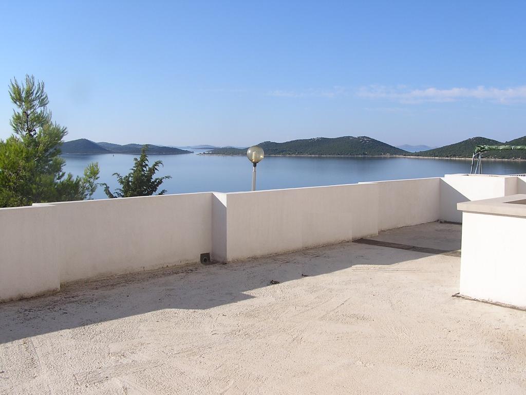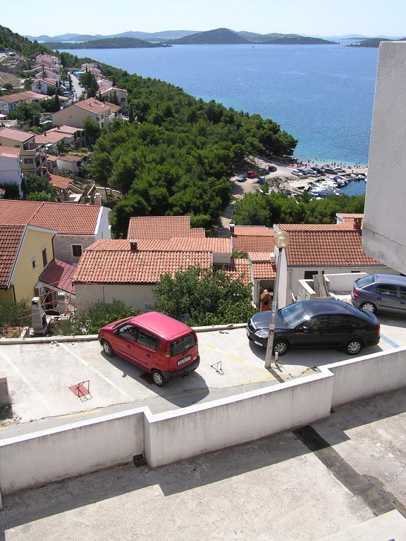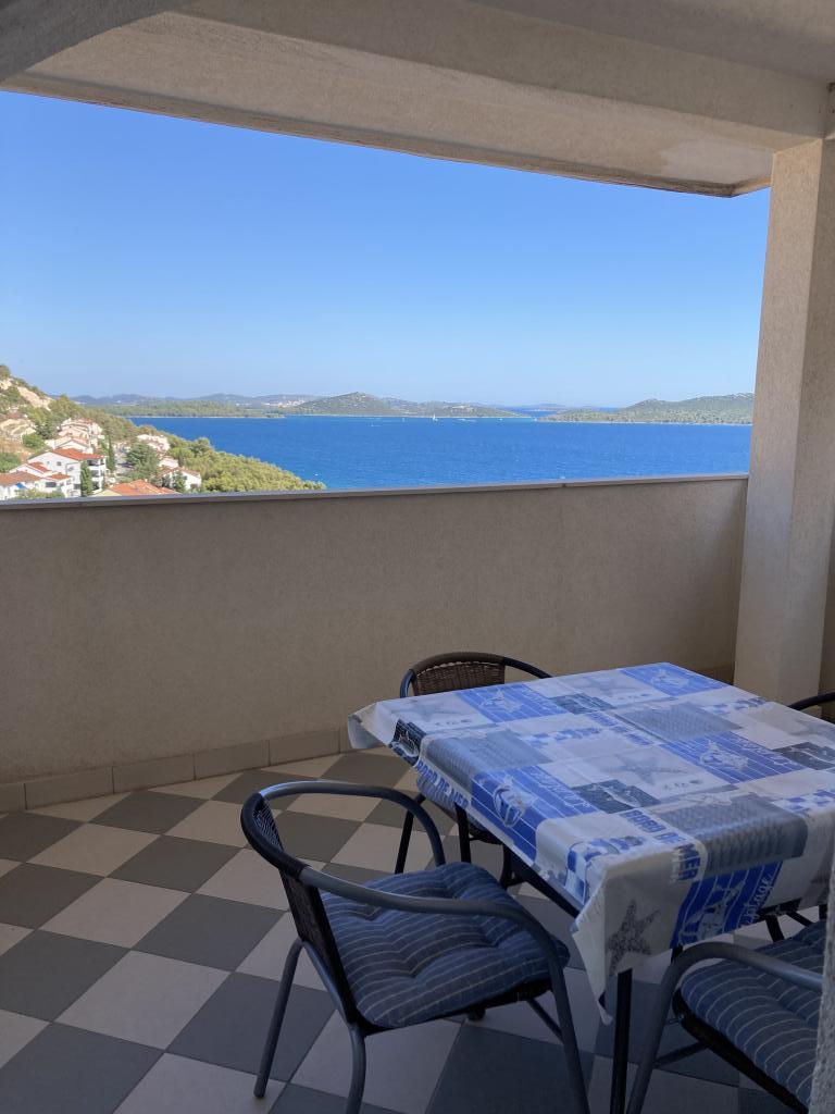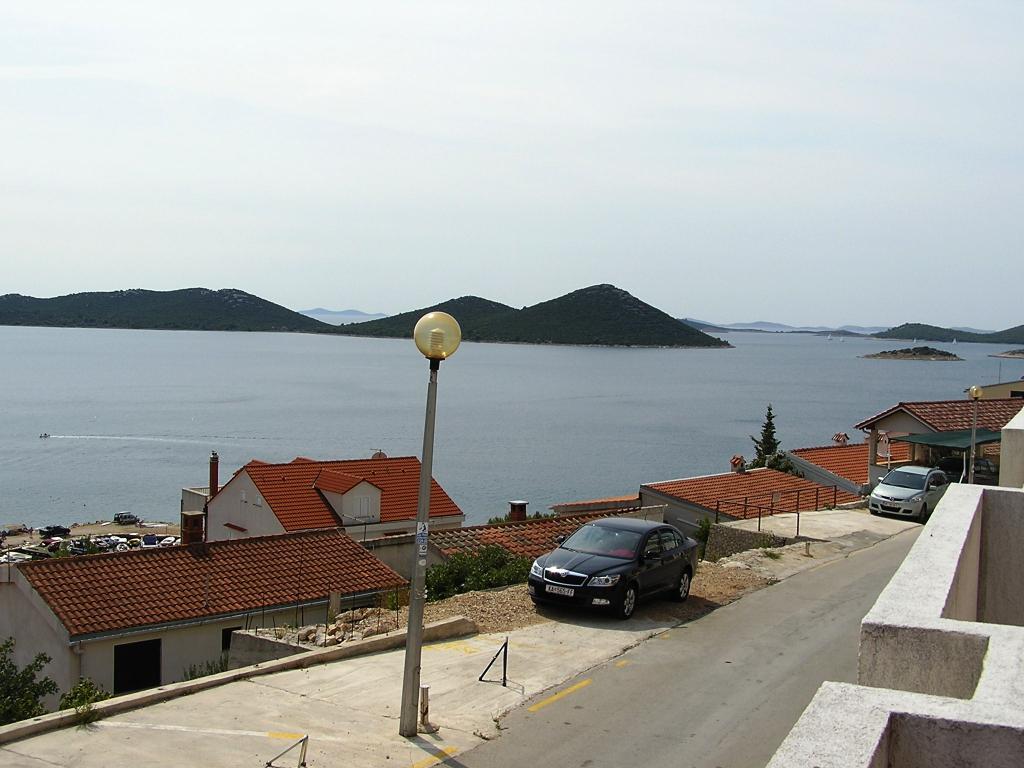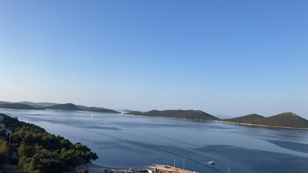 The property is located in the 3rd row of the Dolaška draga bay weekend village, part of the town of Drage, approximately 100 m (as the crow flies) from the sea and beaches that stretch along the weekend village to the dense pine forest and promenade. Due to the dominant elevation of the property (approximately 50 m above sea level), all apartment rooms and terraces have a beautiful panoramic view of the weekend village itself, the local harbor, the surrounding beaches, nearby islands and the town of Murter and the Kornati islands in the distance. The distance from the property to the sea (beaches surrounded by dense pine forests and a promenade) is approximately 300 m using the access road through the Dolaška draga weekend village; on foot around the road (approximately 10 min) or by car (2 min). The sea can be reached on foot faster (5 min) if you use a short section of the access road and one of the several flights of stairs in the weekend village purpose-built for access to the sea, beach, promenade, pine forest, harbor, cafe, etc. The facility has two apartments (on the 2nd and 3rd floors), of which only the apartment on the 2nd floor is rented, and the hosts (2-4 people) stay in the apartment on the 3rd floor in the summer, so they are available daily and at the service of the guests, but without disturbing their peace and privacy. Guests have 1 parking space for a car in the facility's garage, and on the panoramic terrace (80 m2) above the garage (1st floor) they can use the appropriate equipment (barbecue, garden table with 4 chairs and 2 sun loungers) unlimitedly.