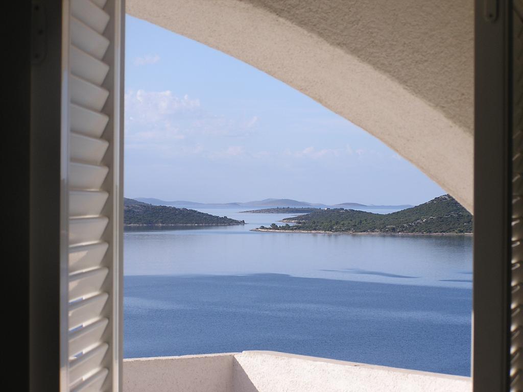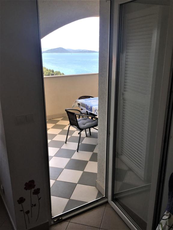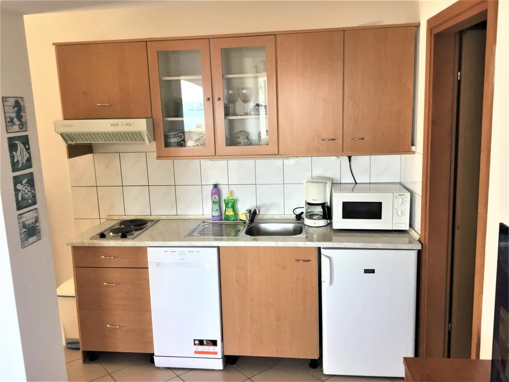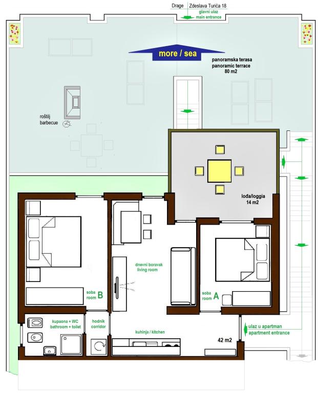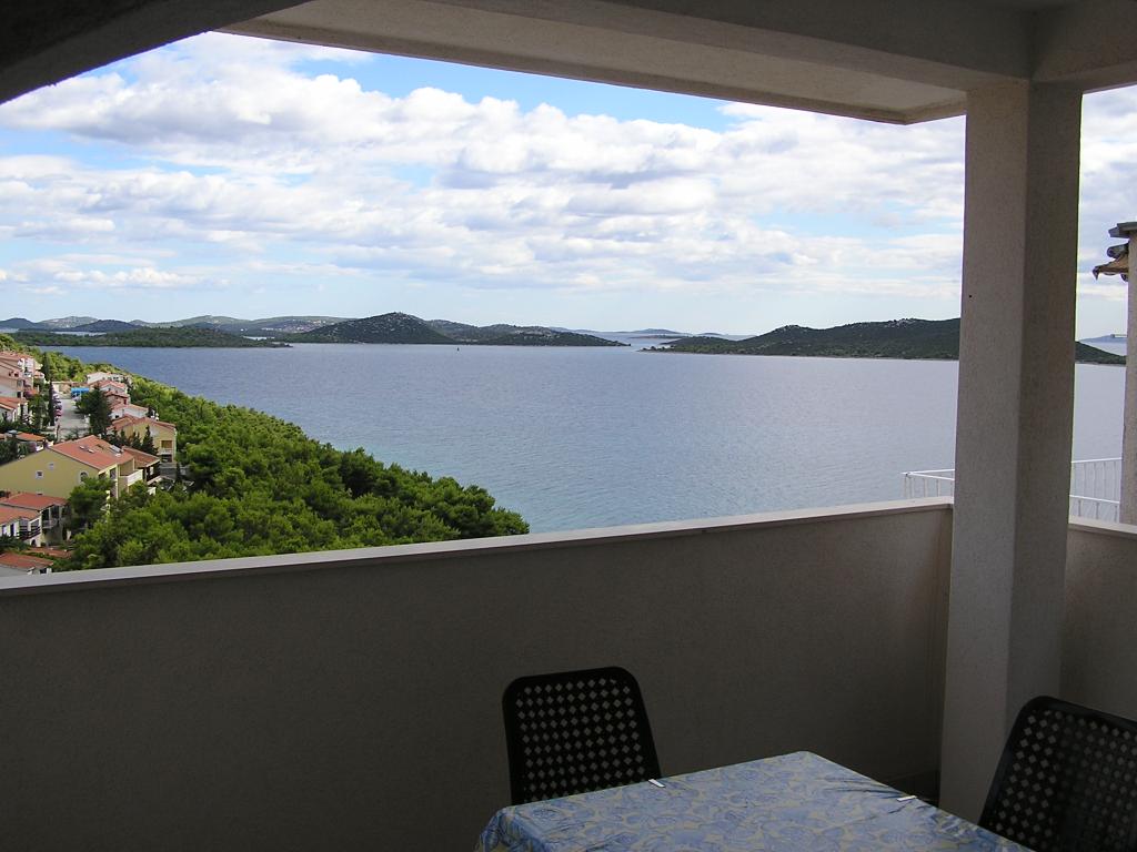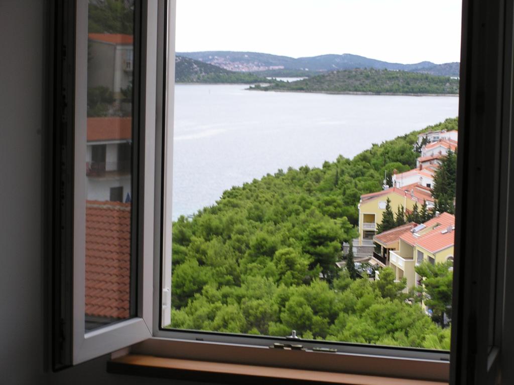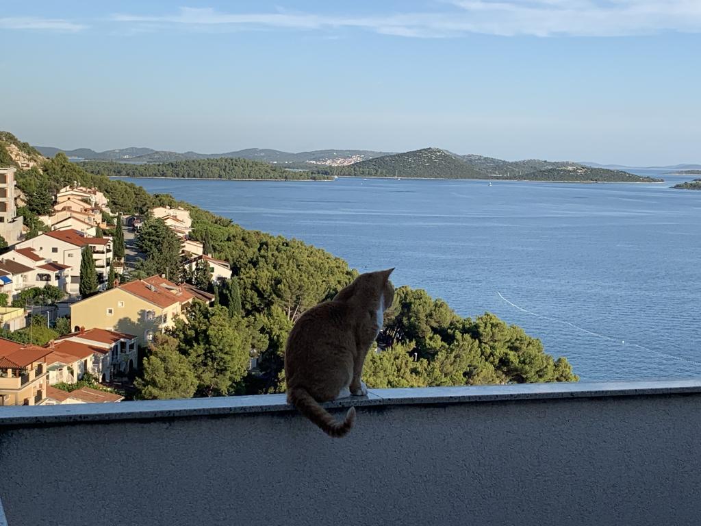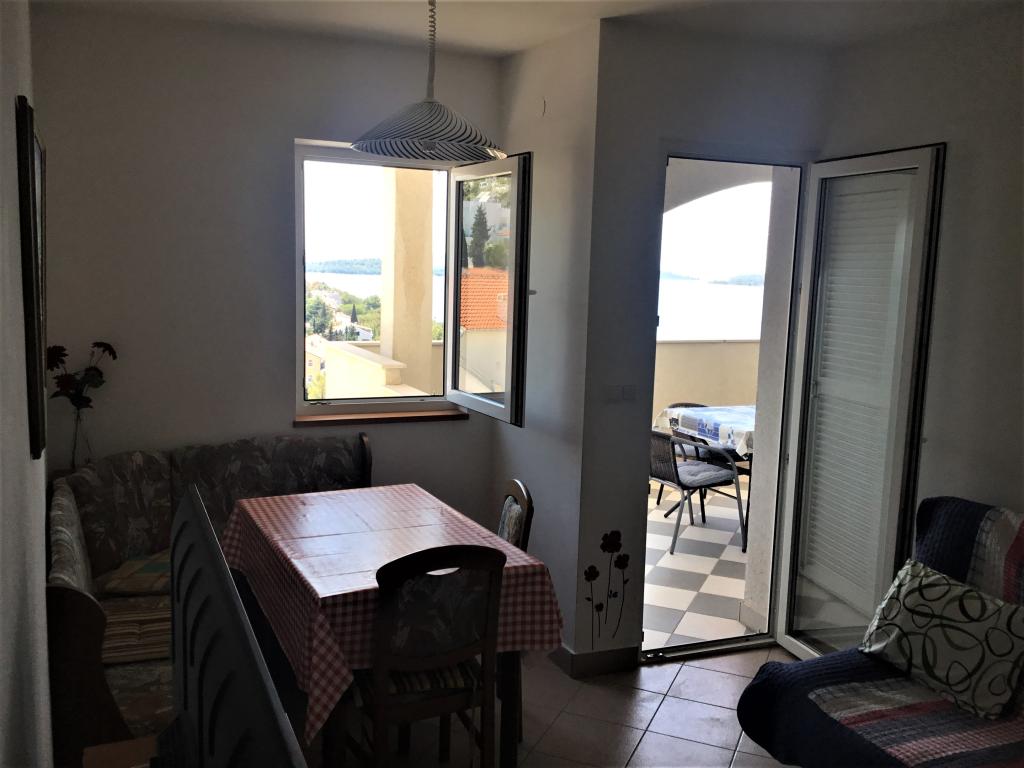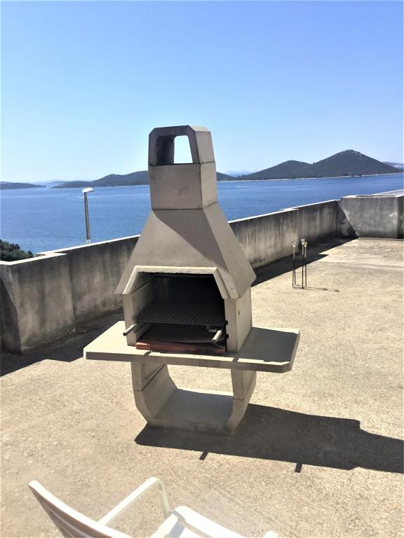 The property is located in the 3rd row of the Dolaška draga bay weekend village, part of the town of Drage, approximately 100 m (as the crow flies) from the sea and beaches that stretch along the weekend village to the dense pine forest and promenade. Due to the dominant elevation of the property (approximately 50 m above sea level), all apartment rooms and terraces have a beautiful panoramic view of the weekend village itself, the local harbor, the surrounding beaches, nearby islands and the town of Murter and the Kornati islands in the distance. The distance from the property to the sea (beaches surrounded by dense pine forests and a promenade) is approximately 300 m using the access road through the Dolaška draga weekend village; on foot around the road (approximately 10 min) or by car (2 min). The sea can be reached on foot faster (5 min) if you use a short section of the access road and one of the several flights of stairs in the weekend village purpose-built for access to the sea, beach, promenade, pine forest, harbor, cafe, etc. The facility has two apartments (on the 2nd and 3rd floors), of which only the apartment on the 2nd floor is rented, and the hosts (2-4 people) stay in the apartment on the 3rd floor in the summer, so they are available daily and at the service of the guests, but without disturbing their peace and privacy. Guests have 1 parking space for a car in the facility's garage, and on the panoramic terrace (80 m2) above the garage (1st floor) they can use the appropriate equipment (barbecue, garden table with 4 chairs and 2 sun loungers) unlimitedly.