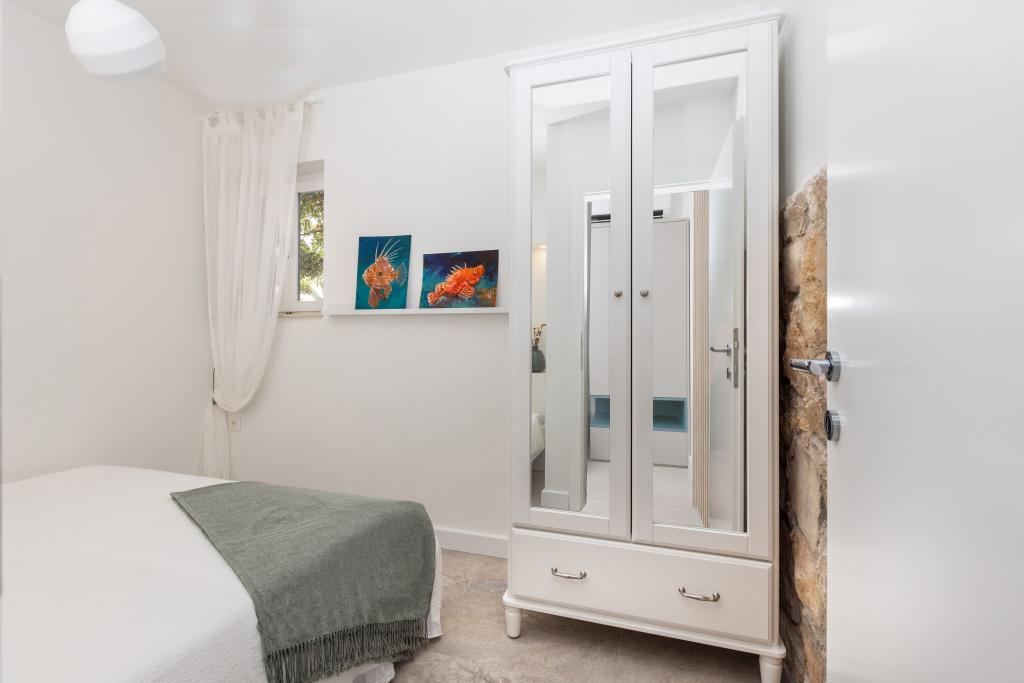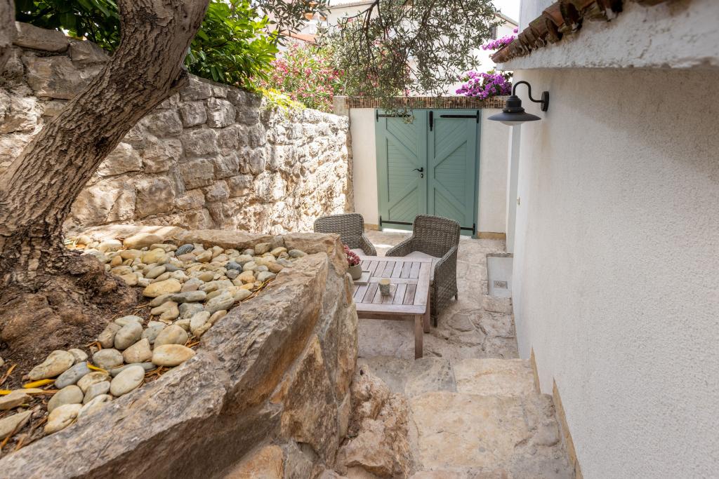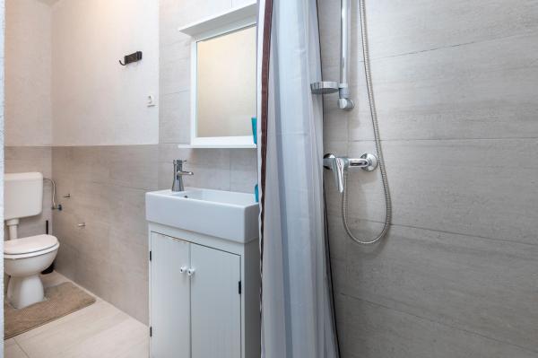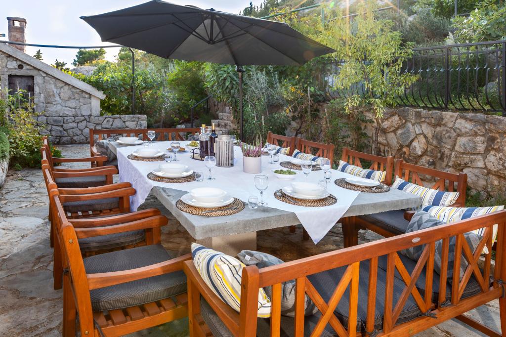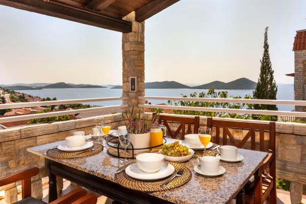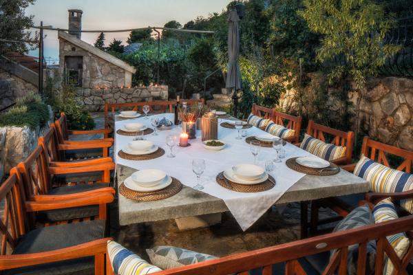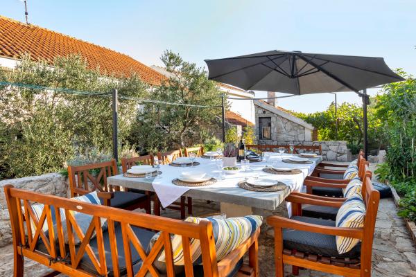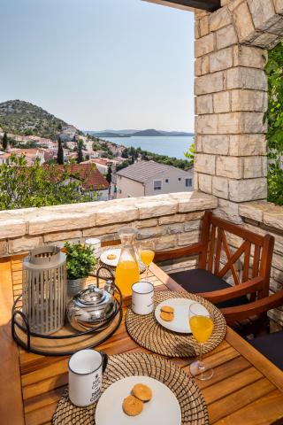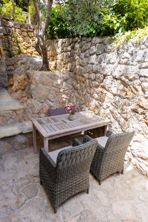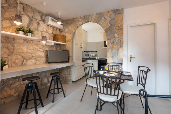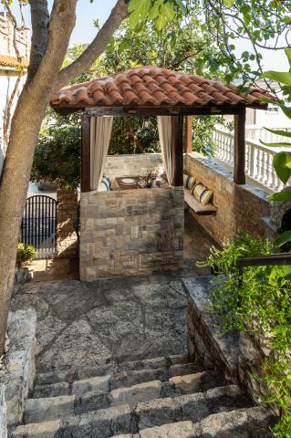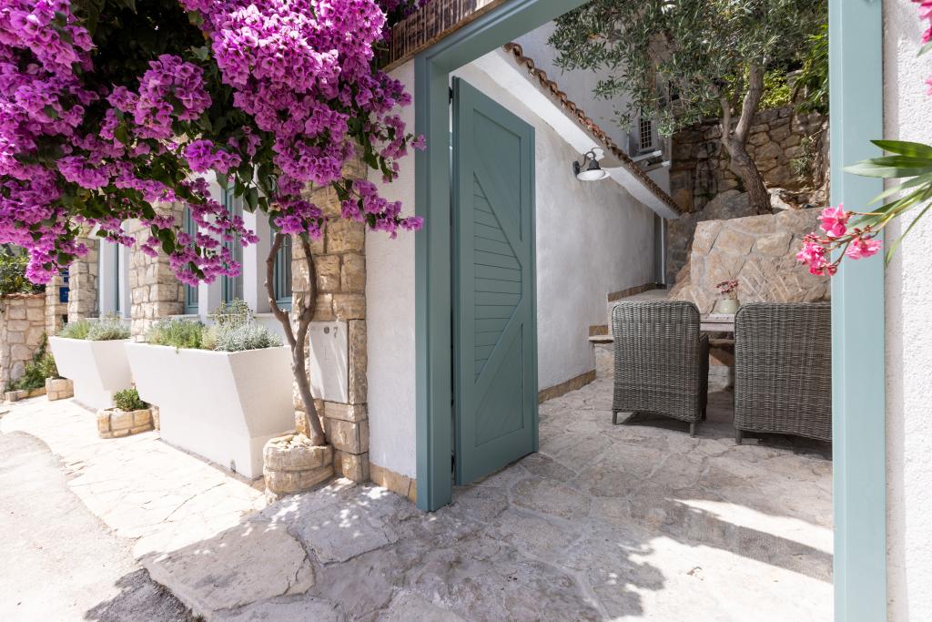 The house itself is fantastic. Stone surrounded by olives, laurel, figs and flowers. It has a corner with a barbecue, while even chickens hide in the back of the house. The apartment has a wonderful view and everything you need for a pleasant vacation. Friendly host. The fastest way to get to the beach is by stairs. Two or three minutes and you are on the beach. It's a little more uphill. There is always a corner in the shade on the beach. There is a bakery and a small market nearby. We had a great time on vacation.