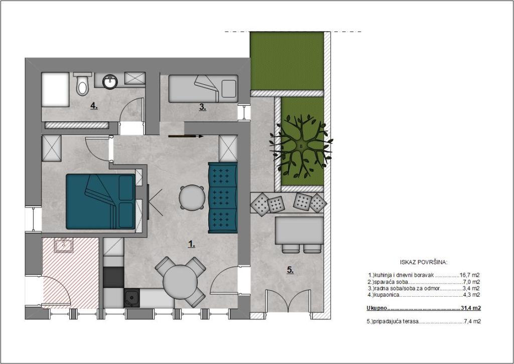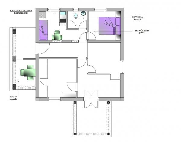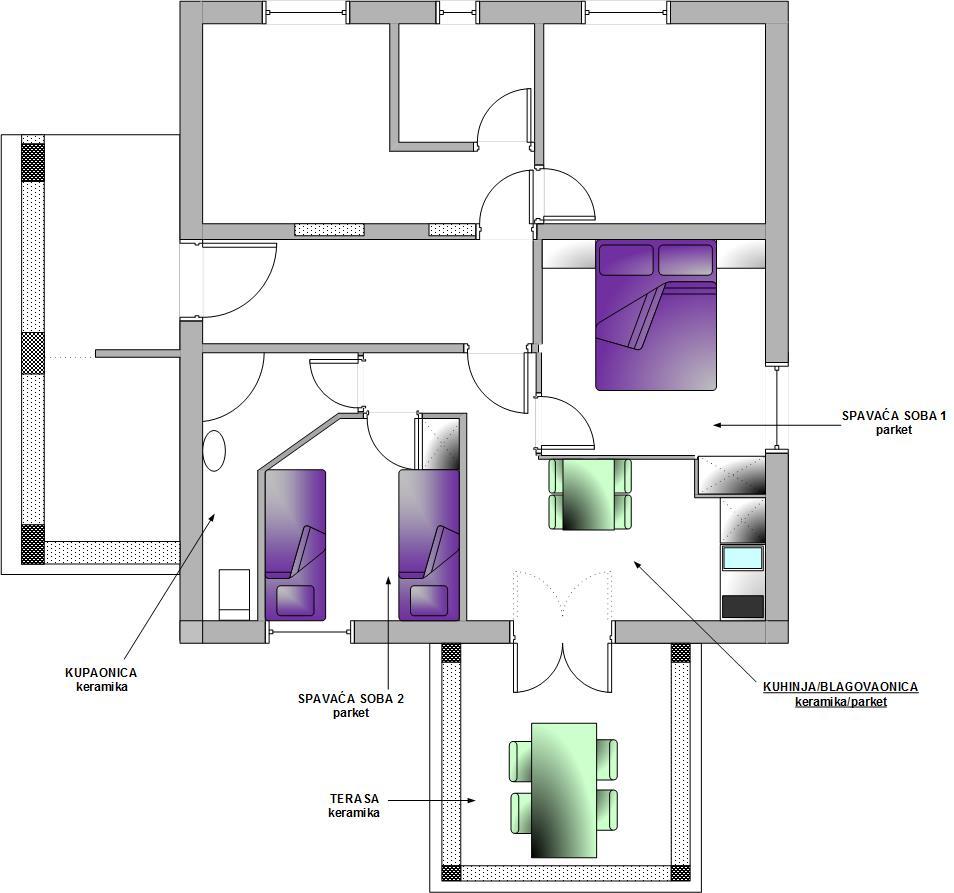 Fully equipped apartments in a beautiful location with a sea view in a house surrounded by greenery. The facility is 150 m from the sea and the beach, which is surrounded by a dense pine forest. An illuminated promenade runs through the pine forest along the sea. Each apartment has its own kitchen and bathroom and 1-2 bedrooms, depending on the apartment. The kitchen has all the necessary appliances and dishes. The apartment has an oven or microwave (depending on the apartment). The rooms have comfortable beds, and bed linen and towels are provided in the bathroom. Apartment A4 has a spacious terrace with a beautiful sea view and the terrace is an integral part of the apartment. Apartment A4+1 has a covered private terrace next to the apartment, surrounded by greenery. The studio apartment has its own private terrace next to the apartment, separated from the passage, with a beautiful sea view. The floor plan of each accommodation unit is attached to the pictures so you can see the size and layout of the rooms. Each apartment has its own parking space.
