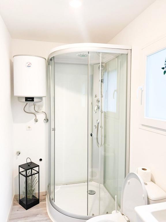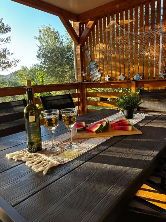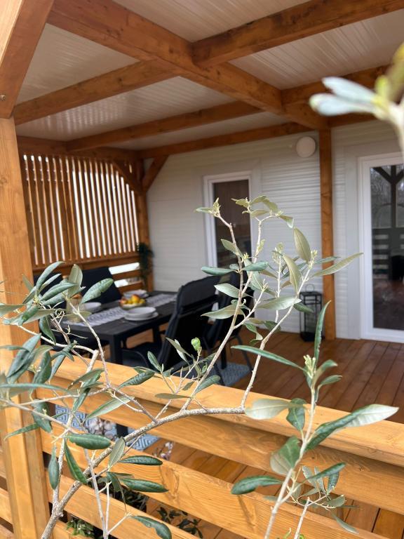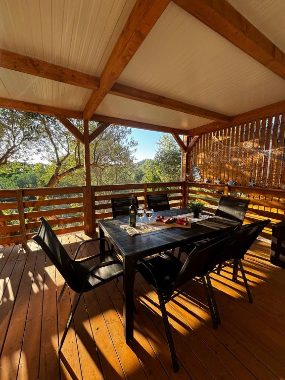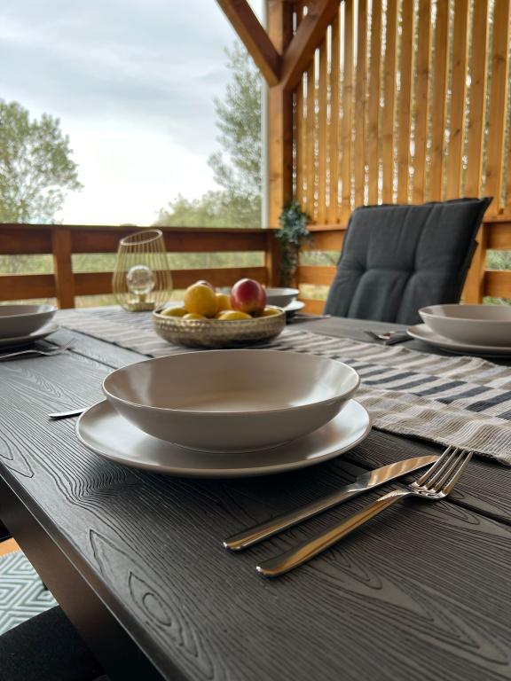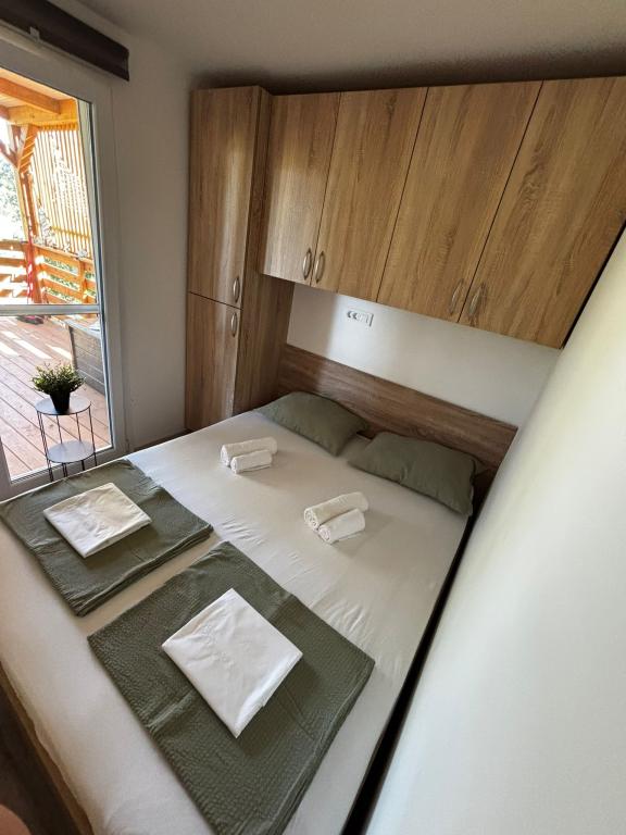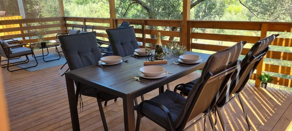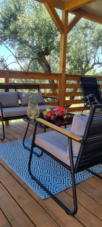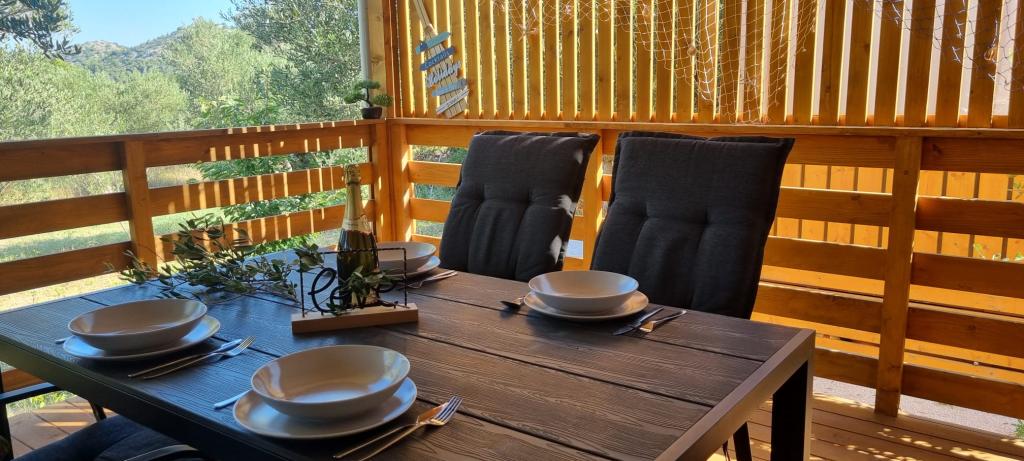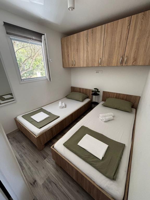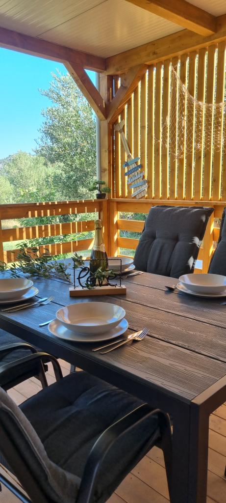 Olive Nest is a mobile home available from 2024. The house is fully equipped, with a modern design, measuring 32 m2 with a 32 m2 outdoor covered terrace. The house is equipped with a bedroom with a double bed, and a room with two single beds, also containing a pull-out bed for two people. Inside the accommodation there is a kitchen with a dining area, and a bathroom (toilet, shower, sink). The covered terrace provides an opportunity for all-day stay and relaxation. There is an outdoor dining table on the terrace. Come and experience a vacation in the heart of Dalmatia! ️- 1 room (double bed) - 2 rooms (two single beds) - pull-out bed for two people - portable cot for a child up to 2 years old -️ 1 bathroom (shower and sink) ️- large terrace 32m2, with a table for 6 people and a lounge area ️- Wi-Fi ️- TV ️- dishwasher ️- electric grill - outdoor shower ️- equipped kitchen - free parking - vacuum cleaner - hairdryer - washing machine