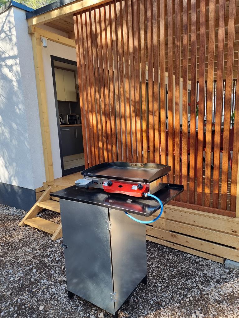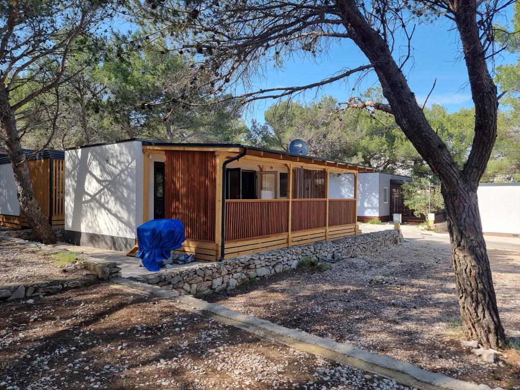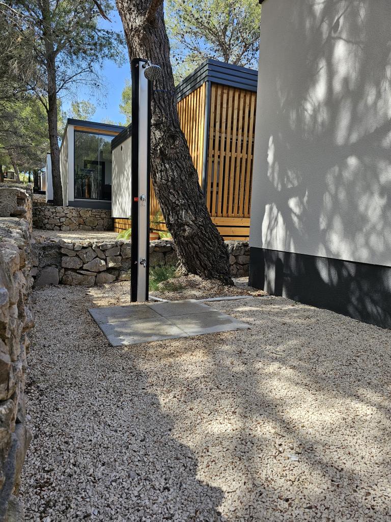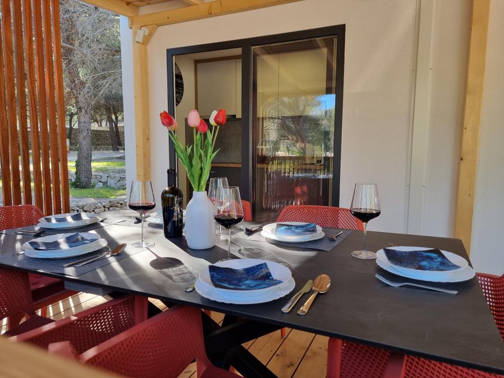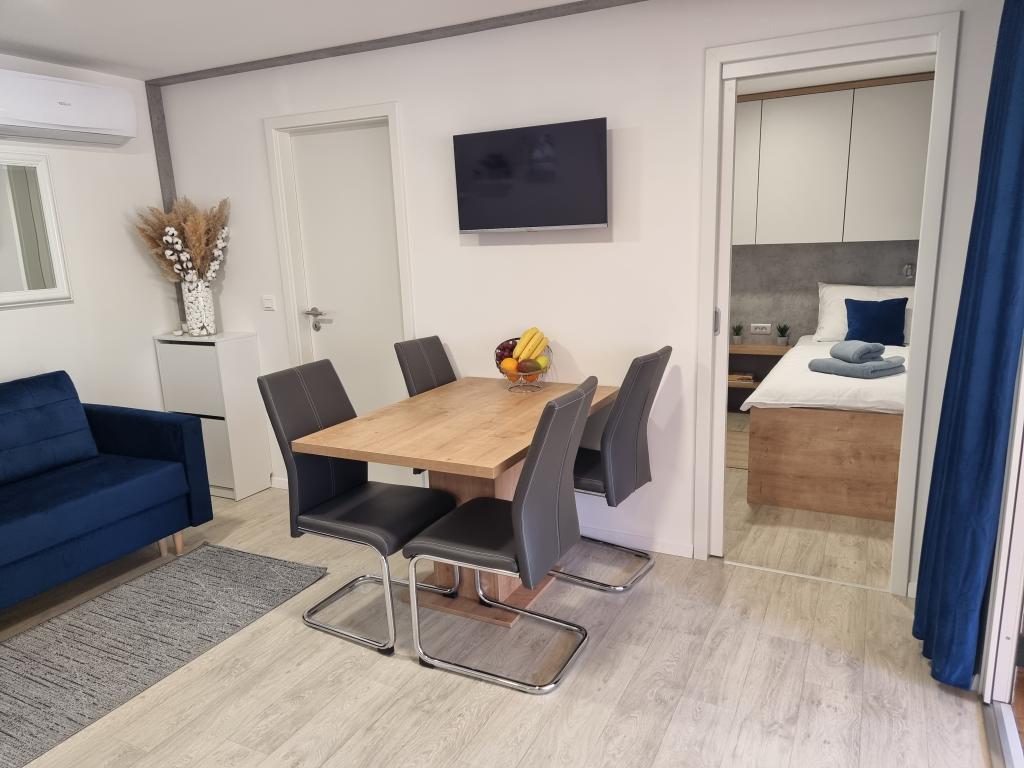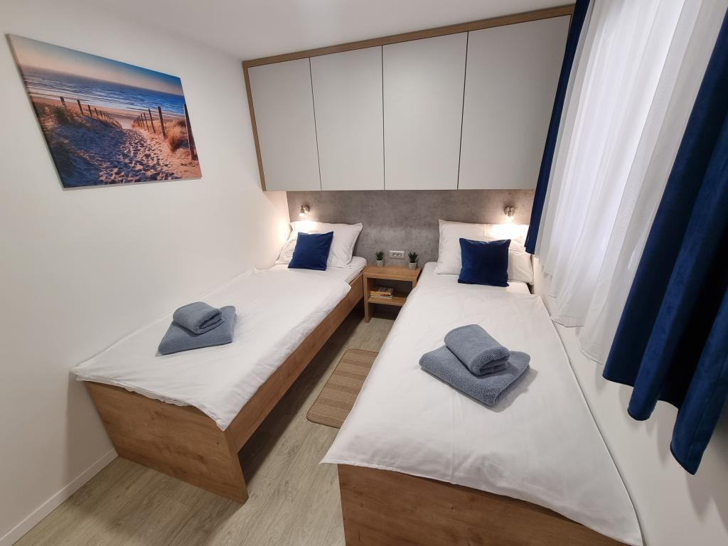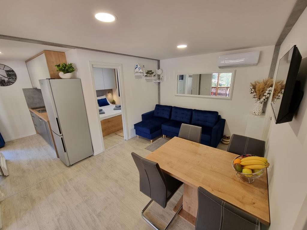 The premium mobile home "SUN & JOY" is brand new and located in an excellent location within the 4-star camp "Oaza mira", only 50 meters from Porat beach, and 150m from Oaza mira beach. It is designed to accommodate up to 6 people. It has 2 bedrooms, one with a double bed and the other with 2 separate beds. In the living room there is a corner sofa with a mattress pad that can be used as a bed for 2 people. The house is modernly equipped with all devices for a comfortable stay, such as air conditioning for cooling and heating, TV with satellite programs, and free internet. The kitchen is equipped with a refrigerator with a freezer, a stove, a microwave oven, a kettle, a toaster, a mixer, and adequate dishes and pans. On the spacious terrace there is a dining table and lounge furniture. There is a barbecue available in the garden, and you can park your vehicle next to the cottage itself. Towels and bed linen are included in the price. Smoking is allowed on the terrace. Pets are not allowed.