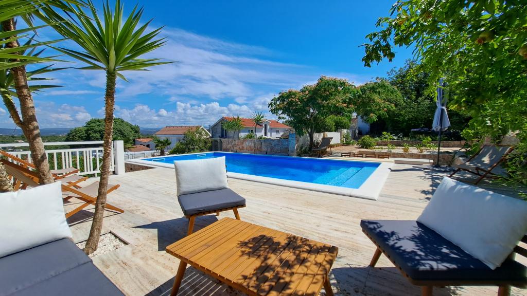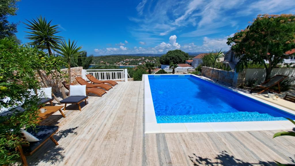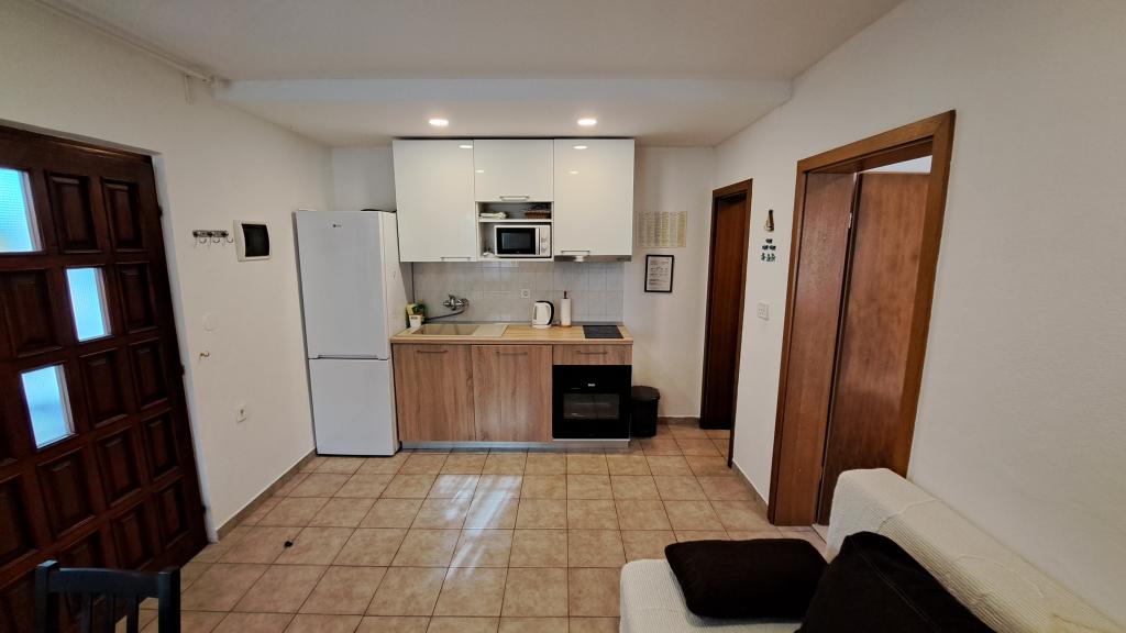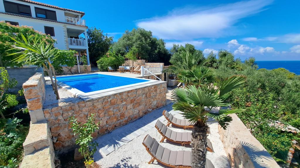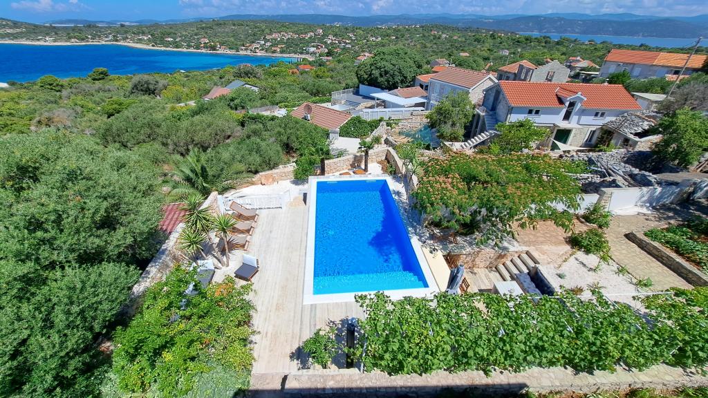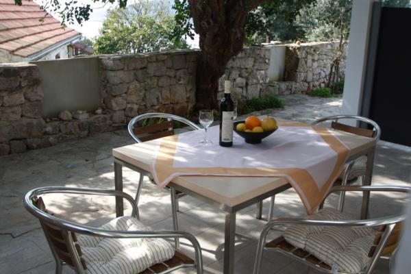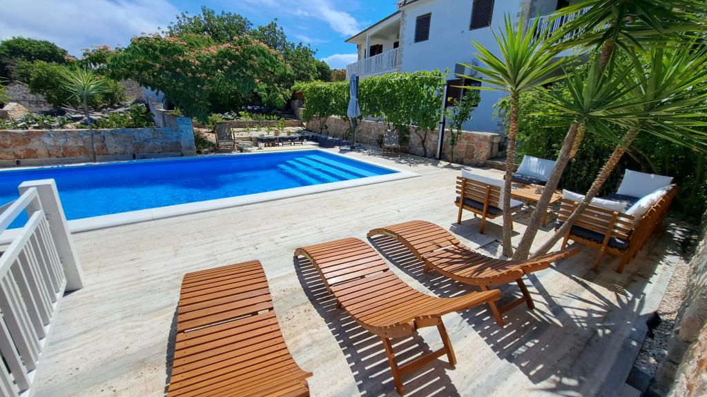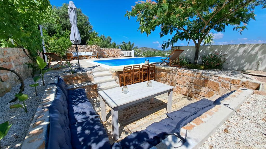 Apartments Villa Knez offer modern and fully equipped apartments with swimming pool, barbecue and a pleasant exterior for gatherings. Drvenik Mali (Ploča) is an island where time has stood still. The island is tame, the coast is accessible, so you can swim around the entire island. It is desirable for those who yearn for untouched nature, clean sea, beautiful beaches, late-night diving and relaxation far from civilization. It's the right place for modern Robinsons. Drvenik Mali is a central Dalmatian island that belongs to the city of Trogir, from which it is 10 NM away. It is connected by a ferry line three times a day. The sailing lasts 50 minutes. The vegetation consists of olives, carobs, fragrant and medicinal Mediterranean herbs. The shop is modestly stocked with basic items and it is recommended to buy food in Trogir. There are no disco clubs. Everything is nearby, the island is ideal for walks. The apartments are located in the old village of Petomavar and can be reached by car, and each apartment has secured parking