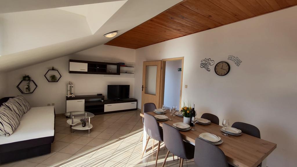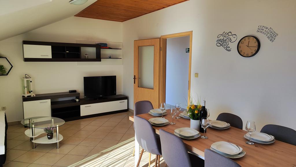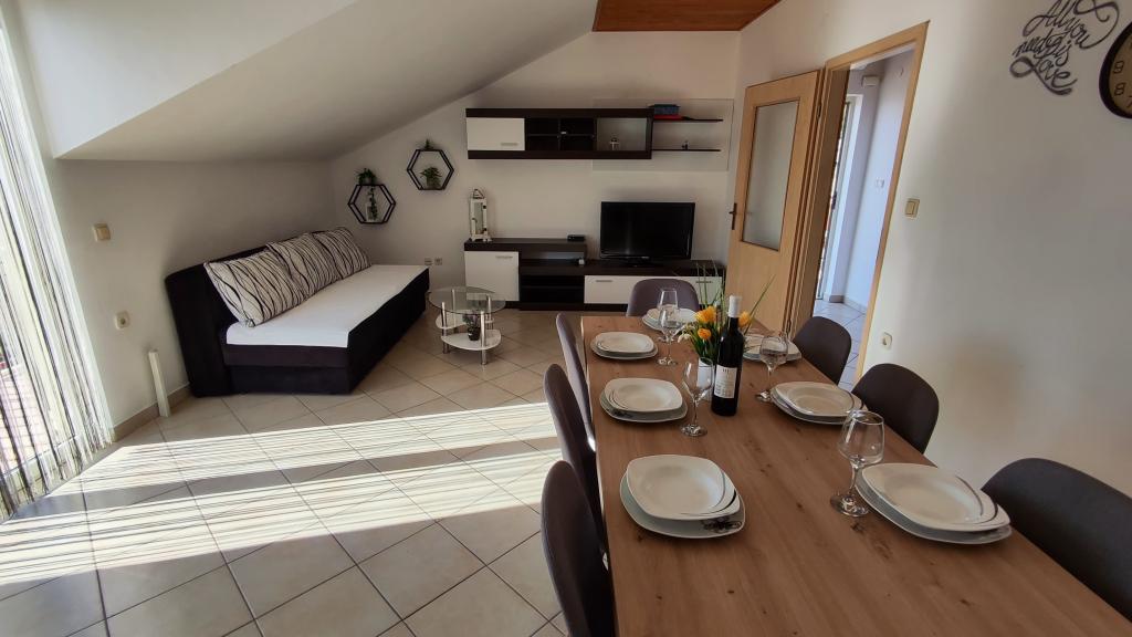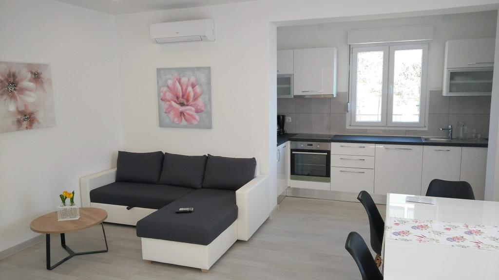 Apartment very good for a family with one child, very clean, sheets and towels replaced with clean after 7 days. Very well equipped kitchen, great terrace. The hosts very nice people. Children speak English hosts. No air-conditioning can be disruptive during a very warm night, because hot days and so spends the sea. The nearest beach is rocky, but good, convenient access to the promenade by the sea beach gravel - very good for children. City peaceful, which is not overcrowded beaches. A good starting point to visit Split, Trogir, Omis and Makarska Riviera - anywhere close.