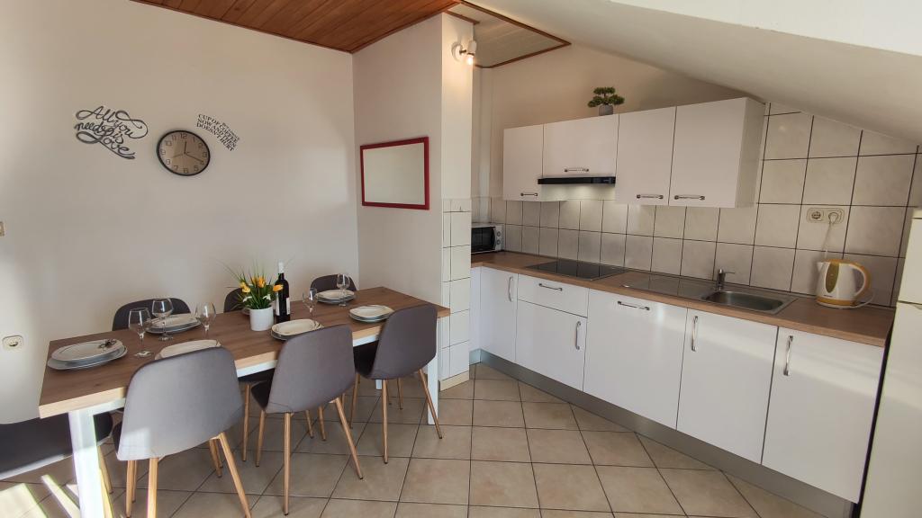 We had a wonderful week here. The interior of the apartment is completely new, the kitchen is fully equipped. The lack of a microwave oven is negligible. The washing machine is amazing, we have never been to a place with a washing machine. Now we know it's good to have it. Eternal panorama for breakfast, dinner and conversations. The hosts are friendly and helpful, we understood each other even though we didn't speak the same language. The sea is 150 m below, the way back is a bit steep, but it's worth going down. The car is recommended to buy due to its striking parts mentioned above. The Lidl in Split approx. 14 km away, Ribola approx. 700 m, Tommy Market, Studenac approx. 800 m. We recommend the Therapy pizzeria on the beach. A hamburger is as delicious as a kebab in a bun. A little further along the beach, the Rivica bar is also recommended for the aforementioned hamburgers and kebabs. Since both places are on the beach, it gets quite crowded in the afternoons. If you want a sandy beach, head to Omiš (it's 4 km away), the water is less salty than here, and the most important thing is the sandy beach. If you don't want to park near the beach, you can expect a fee of 1.5 eur/hour. The apartment is equipped with everything, there is also air conditioning for which you do not have to pay extra, we could also bring a dog, but it would hurt the poor. No grass, no smell, all the other dogs we met were "year-old" dogs, regardless, he felt good with us, we couldn't take him to the sea, but we didn't want to either. We were satisfied with everything, I recommend it to others!